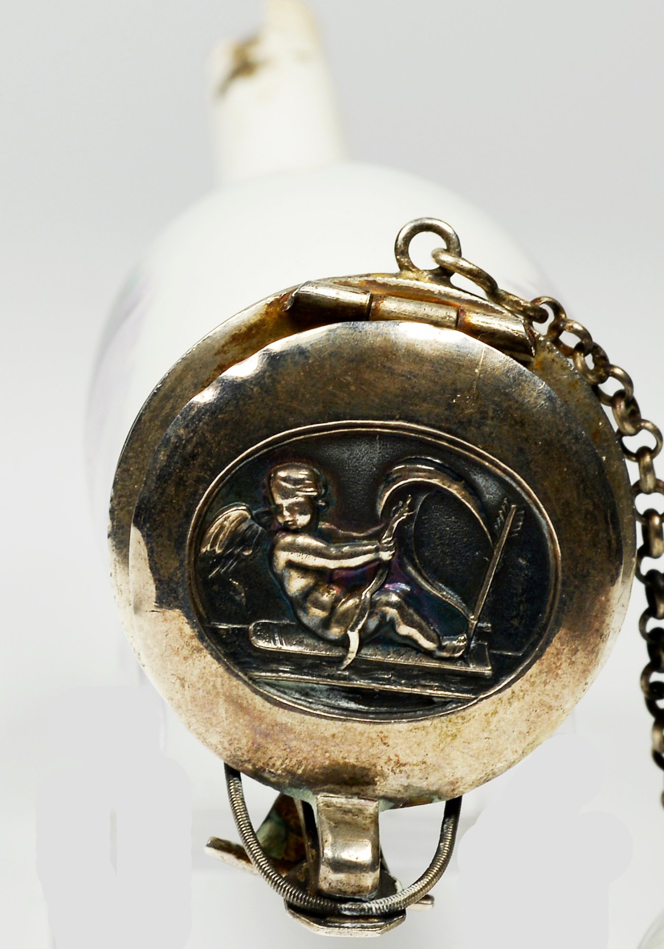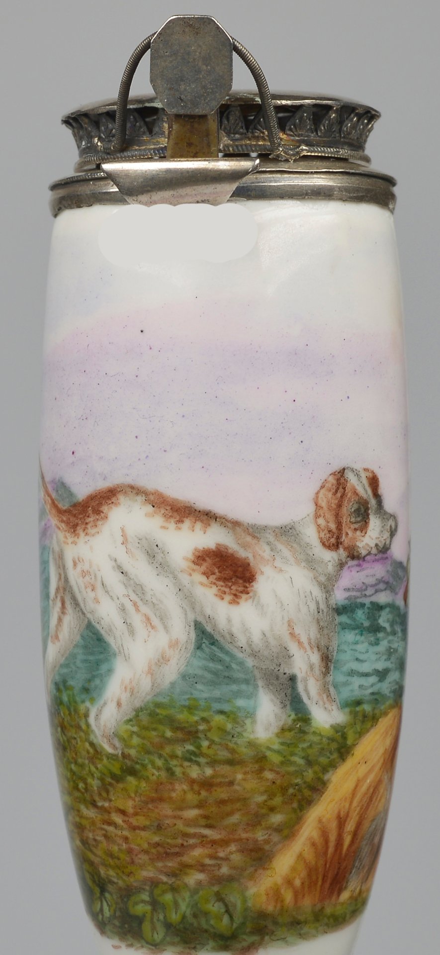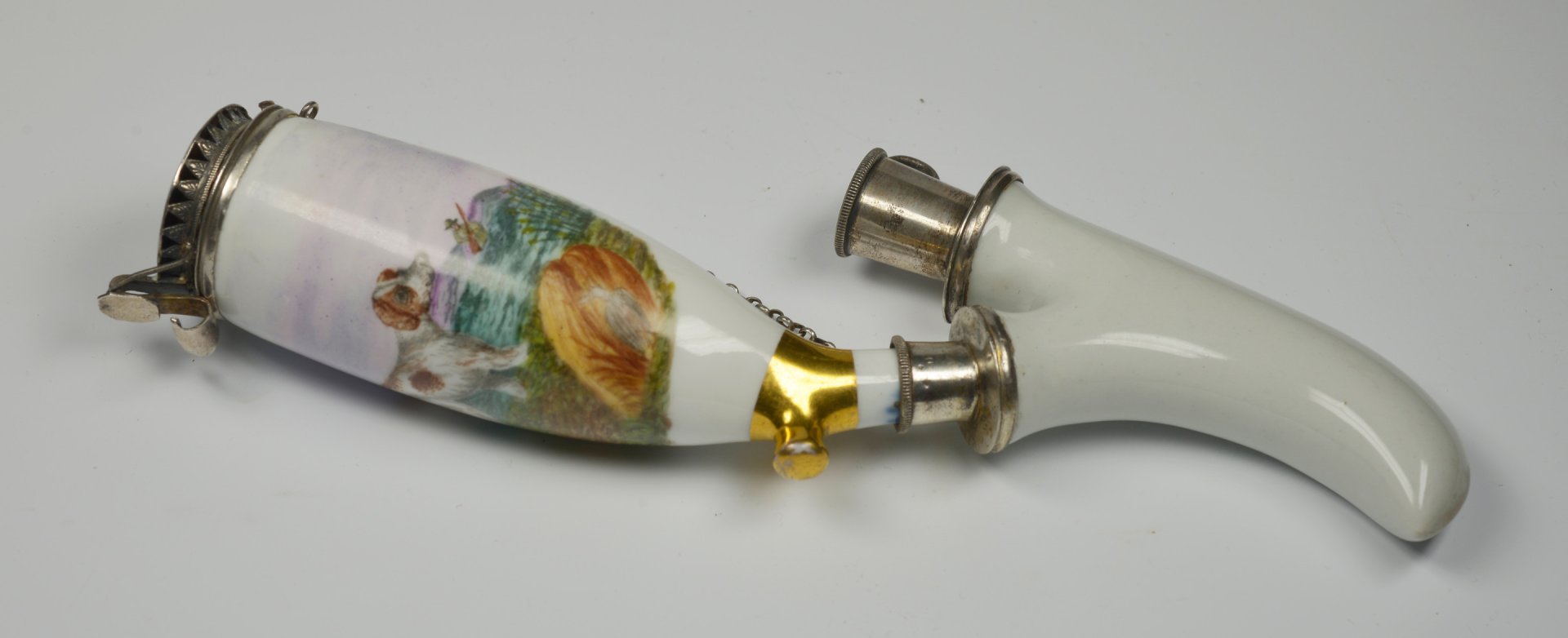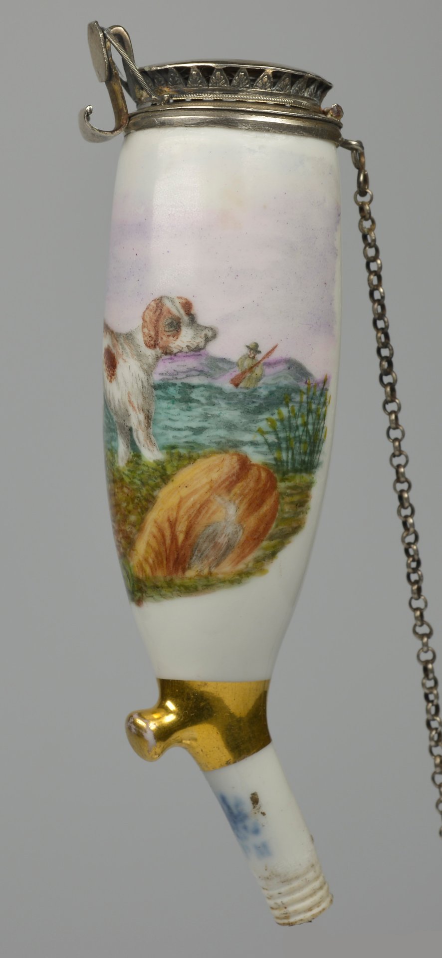 Porzellan-Pfeifenkopf, Berliner Form, zu 2/3 den Korpus umspannende ovale Kartusche, darin mit bunten Muffelfarben die Darstellung eines Jagdhundes und im Hintergrund ein Jäger mit Gewehr; Montur: Silber; Knopf umlaufend vergoldet; Stiel mit unterglasurblauer Adlermarke, darunter KPM (vergl. E. Röntgen, Deutsche Porzellanmarken, Nr. 215); aufwendig gestaltete Montur aus Silber; Deckel mit eingeprägtem Putto, der im Wind segelt; H=14,1 cm (a=127,5; b=98,1; c=36,8 mm)