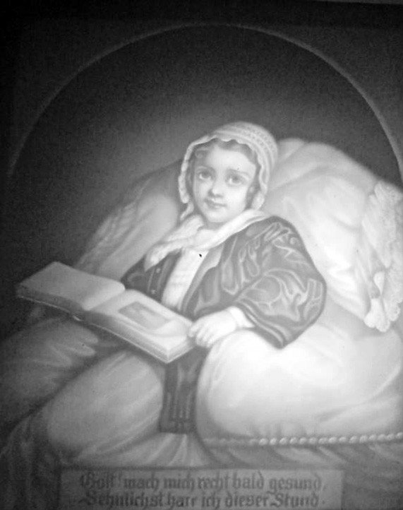 Plaue Porzellan Manufaktur, Lithophanie, Modell PPM 383, im Preis-Courant bezeichnet: „Das kranke Kind“; in der Platte bezeichnet: „Gott! Mach mich recht bald gesund, Sehnlichst harr ich dieser Stund“;  13 x 11,1 cm