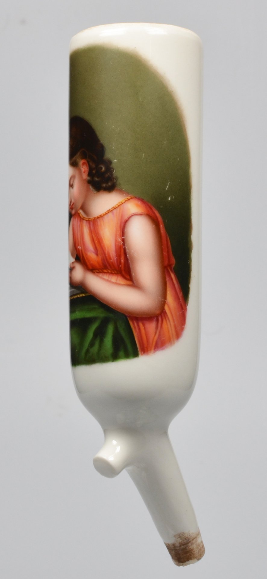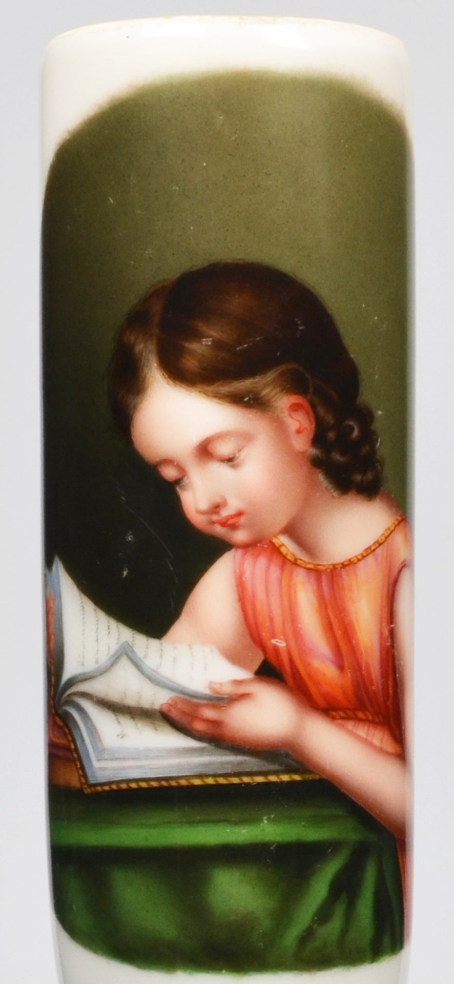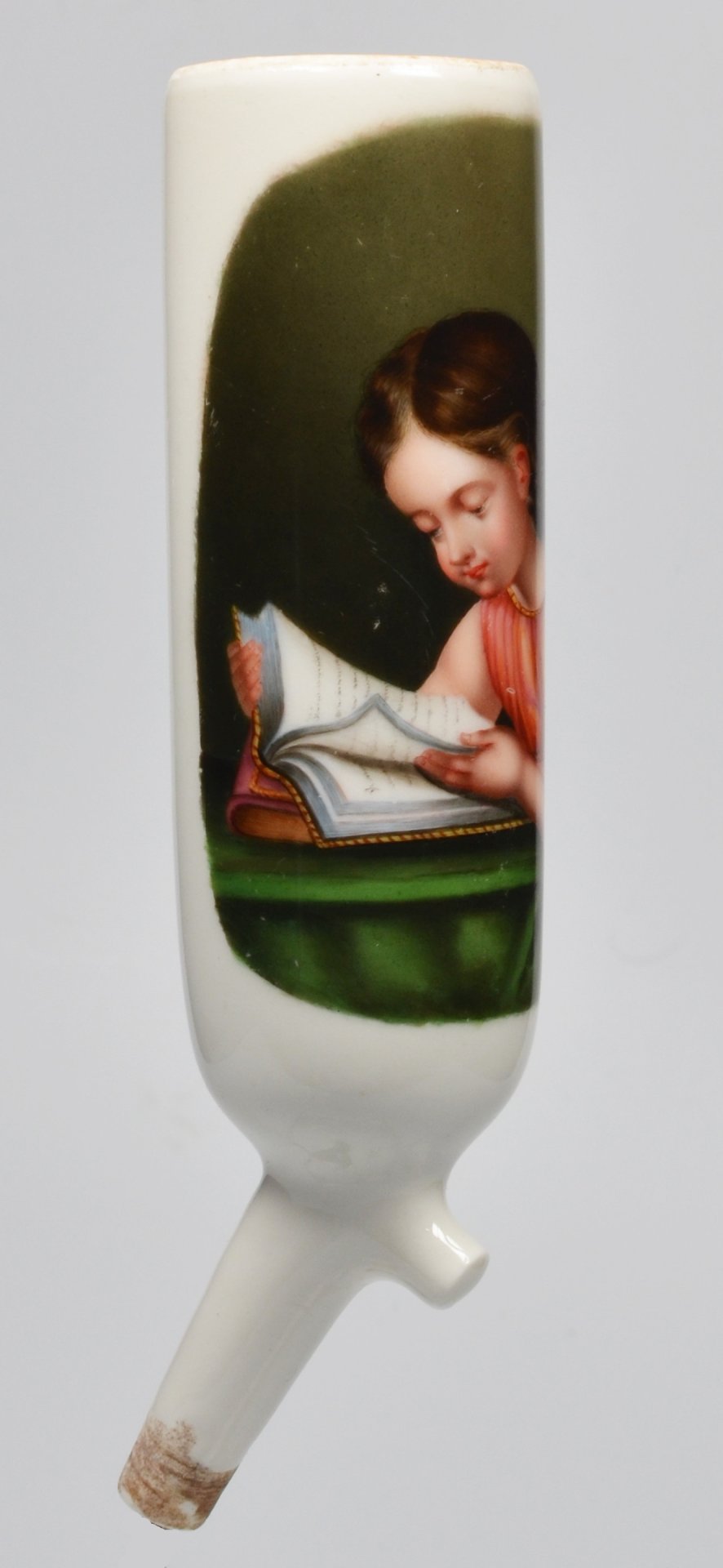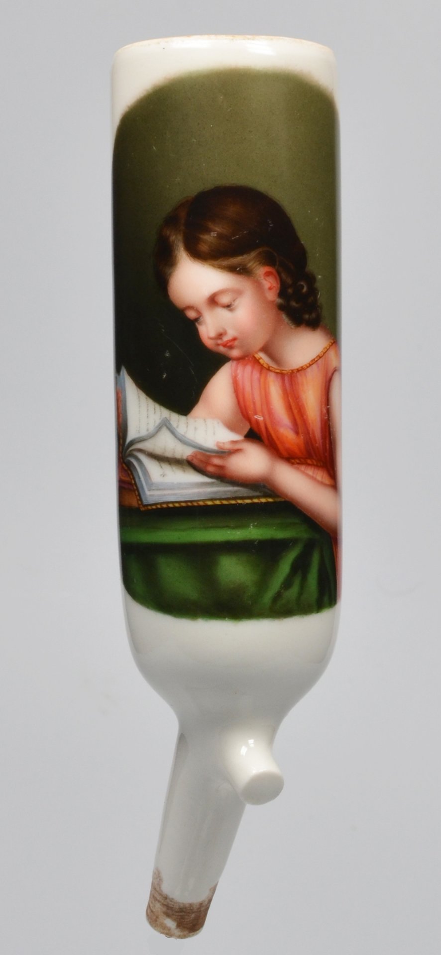 Pfeifenstummel aus Porzellan, zylindrischer Korpus, auf ovalem, grau-grünen Fond in feiner Lupenmalerei mit bunten Muffelfarben Darstellung eines Mädchens, das in ein Buch schaut und die Hand zwischen davor liegenden Seiten hält. H.: 13,1 cm (b=106; c=33,6mm)