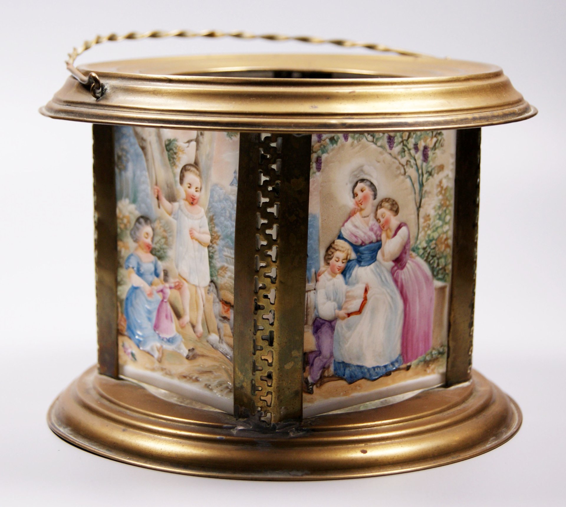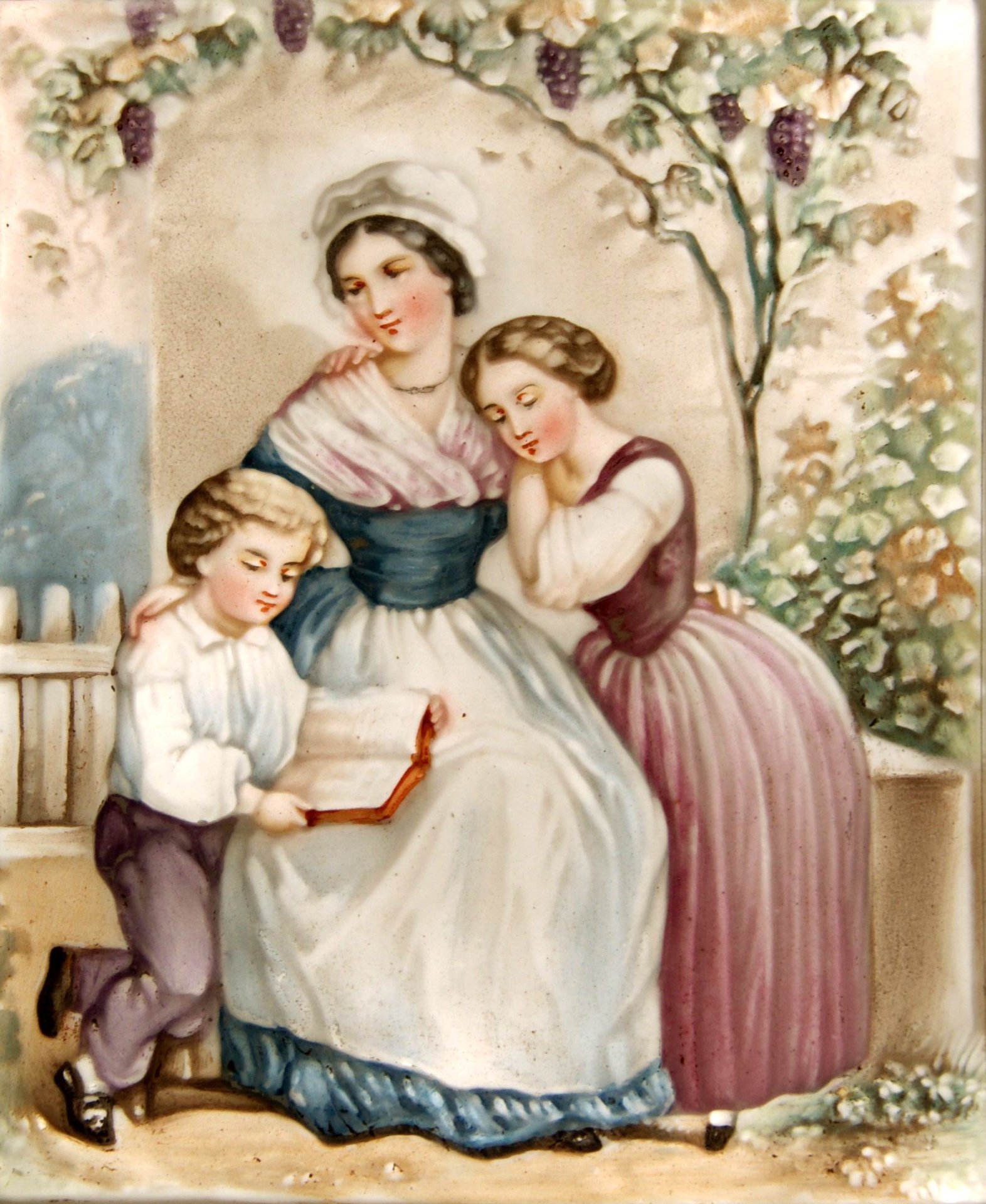 Kolorierte Lithophanie um 1850, Modell BPM 612 (lat. Großbuchstaben), Zwei Kinder lehnen sich an die sitzende Mutter, 8,7 x 7,4 cm