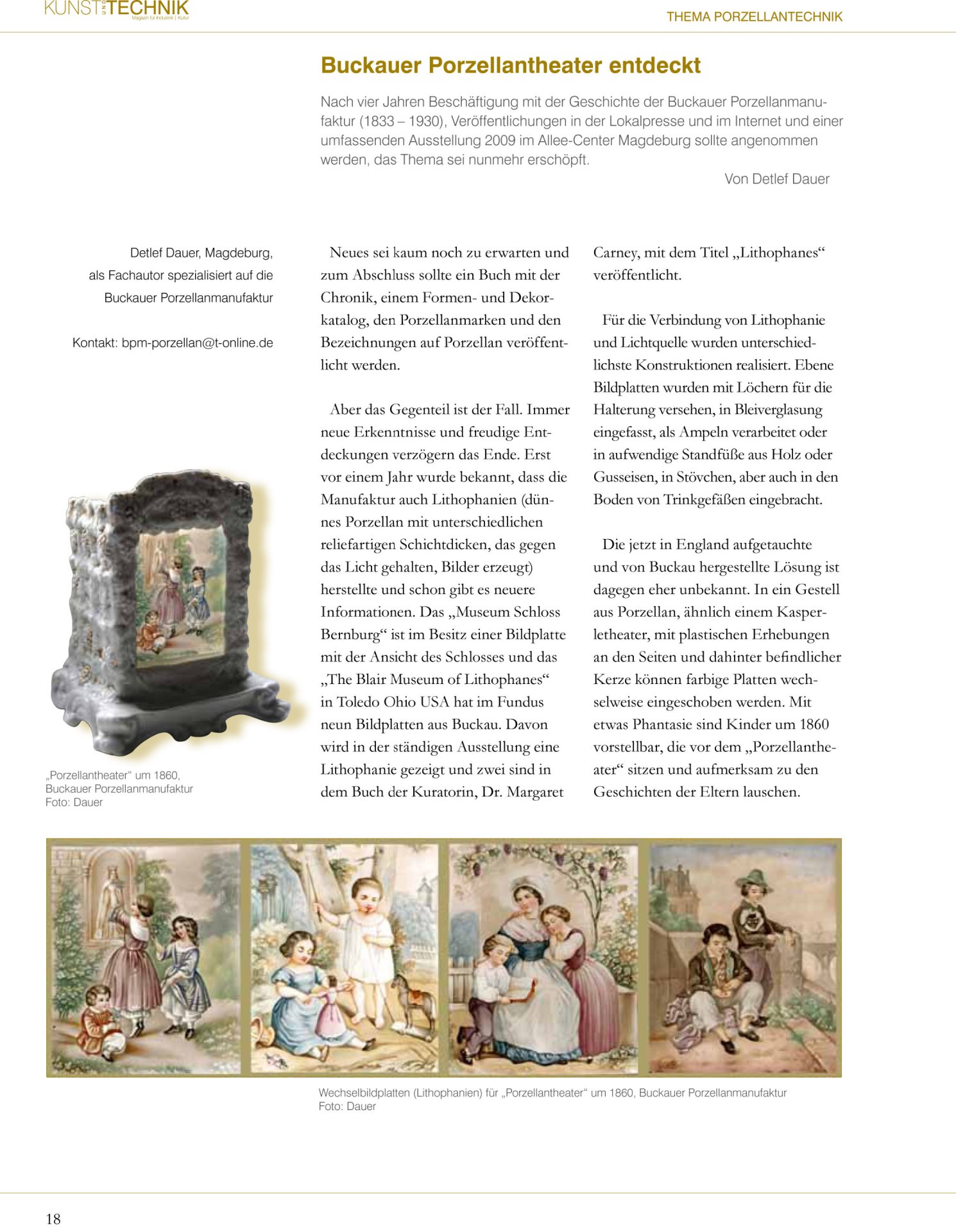 • 2010, Oktober - mit Foto veröffentlicht: Detlef Dauer, „Buckauer Porzellantheater  entdeckt“, Kunst und Technik, Magazin für Kunst und Kultur,  morizpress Leipzig, 2.Jg. Heft 3, Seite 18