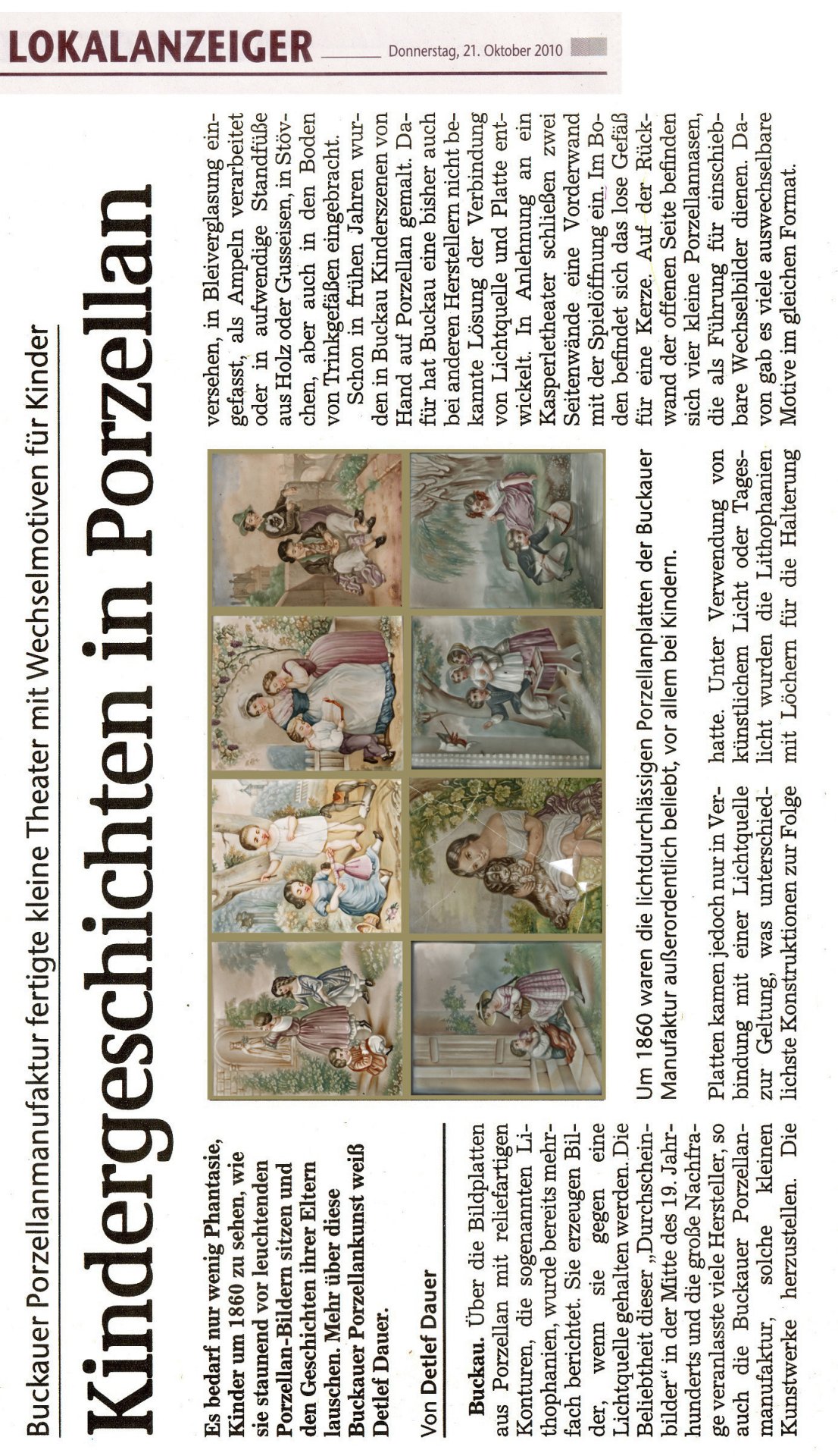 • 2010, 21.10. - veröffentlicht: Detlef Dauer, „Buckauer Porzellanmanufaktur  fertigte kleine Theater mit Wechselmotiven für Kinder – Kindergeschichten in Porzellan“, Volksstimme, Magdeburger Lokalanzeiger,