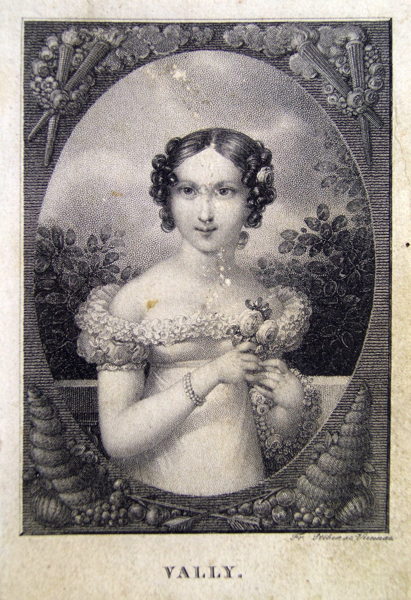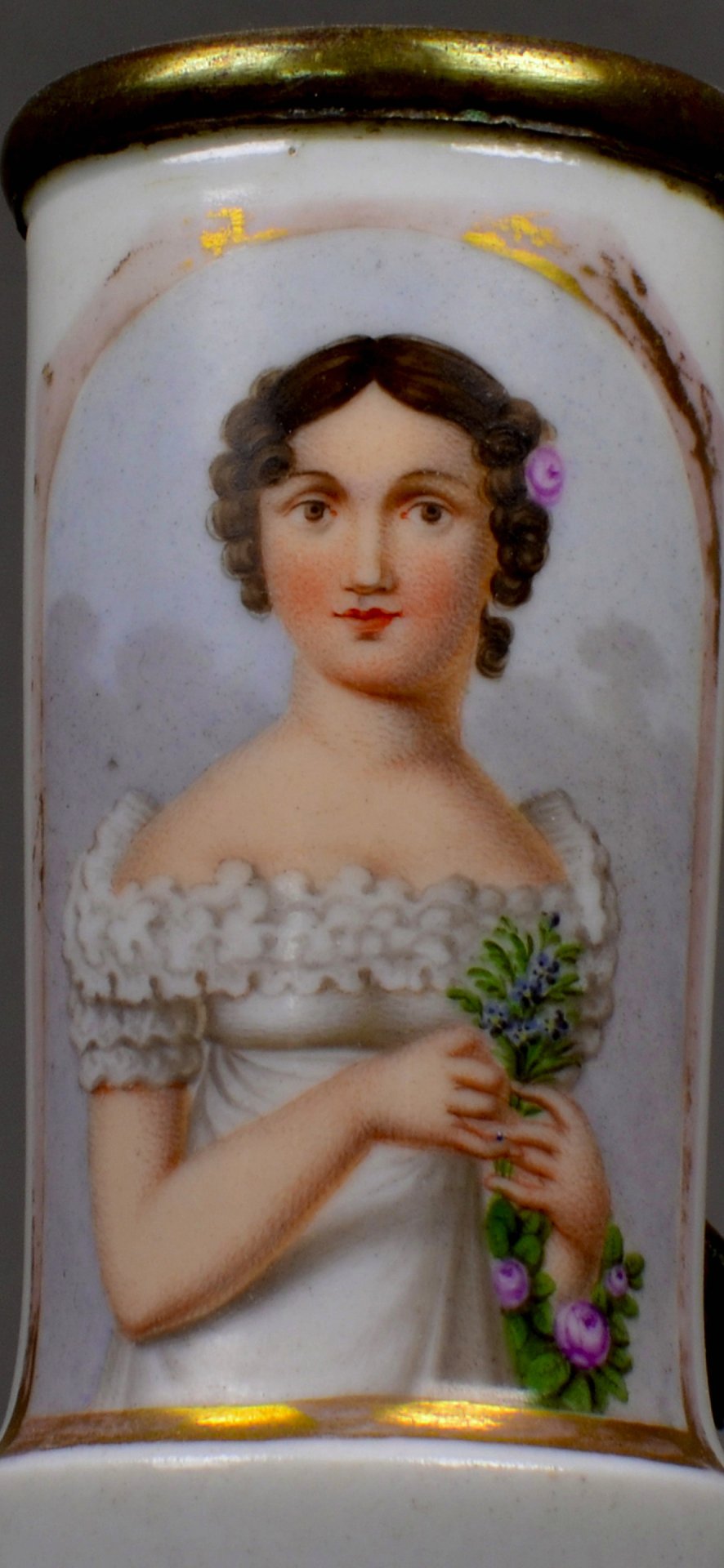 Pfeifenkopf aus Porzellan, zylindrisch, leicht geschnürter Korpus, Abguss von ungarischem Typ; auf der Schauseite in Gold umrahmtes Rechteck mit Rundbogen oben, darin in bunten Muffelfarben die Wiedergabe von „Vally“ nach einem Punktierstich von Franz Xaver Stöber (1795-1858); Gestecktülle und Montur: Messing; Deckel fehlt; H.: 8,5cm