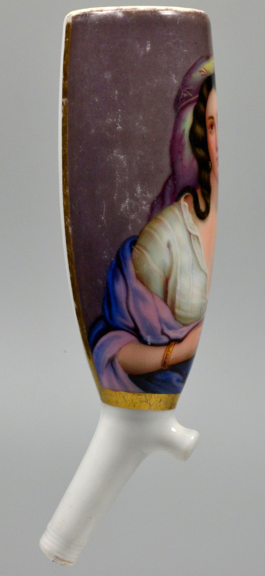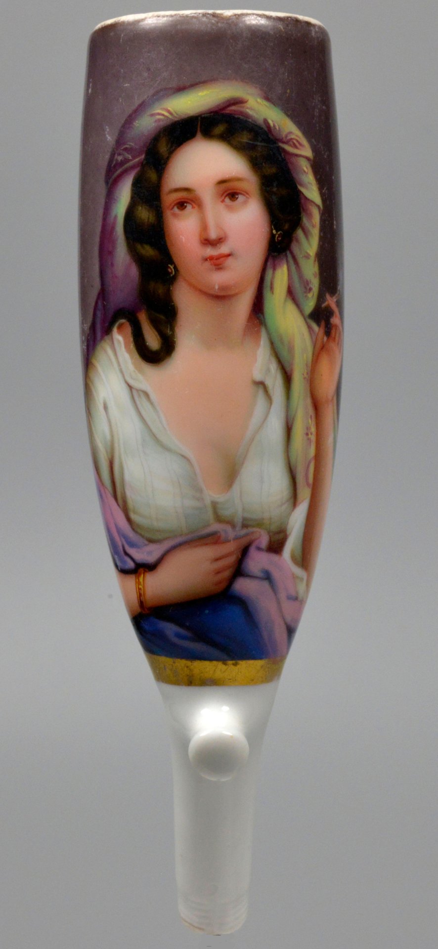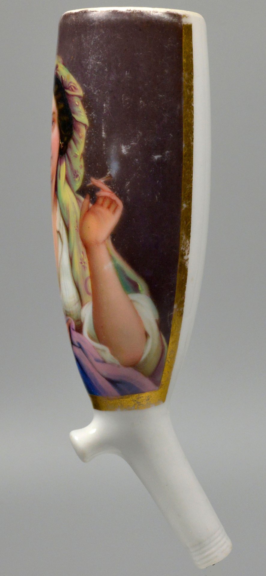 Pfeifenstummel aus Porzellan, Berliner Form, in einer zu 4/5 den Korpus umfassenden, mit Goldleisten an den Seiten und unten eingefassten Kartusche mit bunten Muffelfarben Darstellung einer jungen Frau, die in der linken Hand eine qualmende Zigarette hält. H.: 12,9cm (b=102; c=42,3mm; alpha=25)