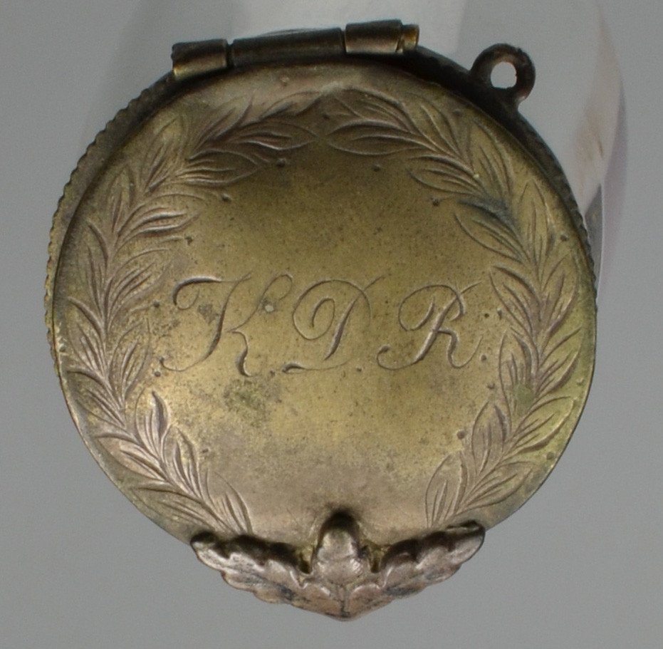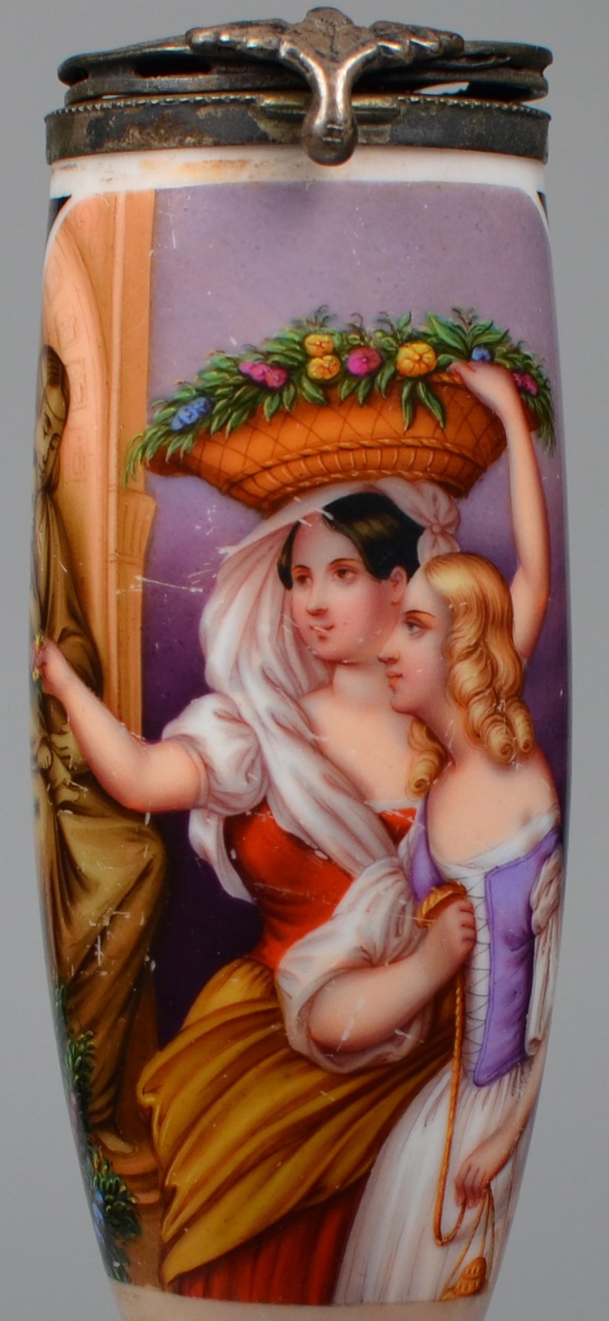 Pfeifenstummel aus Porzellan, Berliner Form; in der zur Hälfte den Korpus umfassenden, in Gold gerahmten Kartusche mit bunten Muffelfarben die Darstellung zweier junger Frauen, eine trägt einen Korb mit frischem Grün und Blumen auf dem Kopf und legt der Madonna mit Kind Grün auf die Plastik, die andere steht daneben und beobachtet den Vorgang. Ferse mit Presszahl 9, Montur: Messing, im Deckel die initialen: KDR. H.: 14,6 cm (a=139; b= 109; c=39,0 mm)