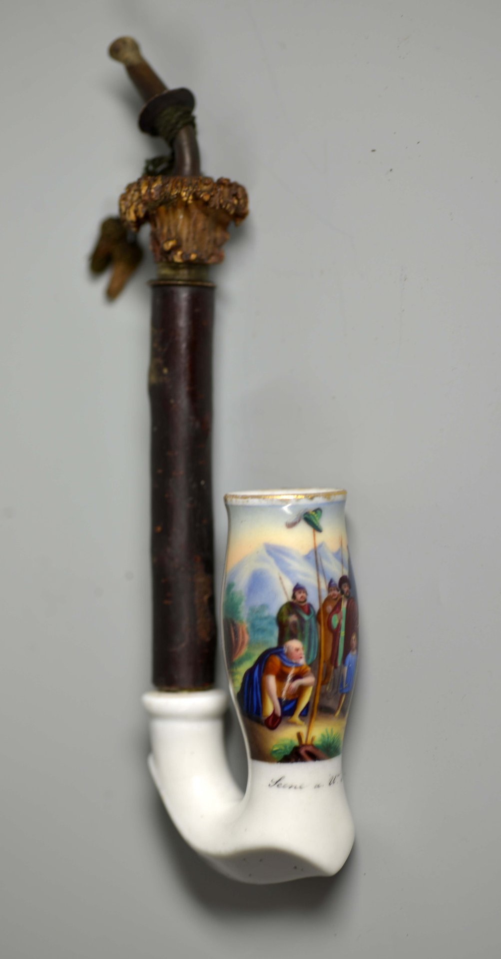 Pfeifenkopf aus Porzellan „mit festem Abzug“ (Preiss-Verzeichniss 1828) in geschwungener Grundform mit kielförmigen Pfeifenhals ; auf der Schauseite den Kessel zu 2/3 umfassendem Bildfeld mit bunten Muffelfarben die Abbildung mehrerer Personen in den Schweizer Bergen; darunter in schwarzer Schreibschrift: „Scene a. W. Tell“; der Pfeifenkessel ist nach oben geweitet; H.: 10,2cm,Gesteck: Nußbaumror, Messingmanschette, Hirschhorn, Hornmundstück, Trotteln; H=19,1 cm, GH = 22cmNachweis: D2628