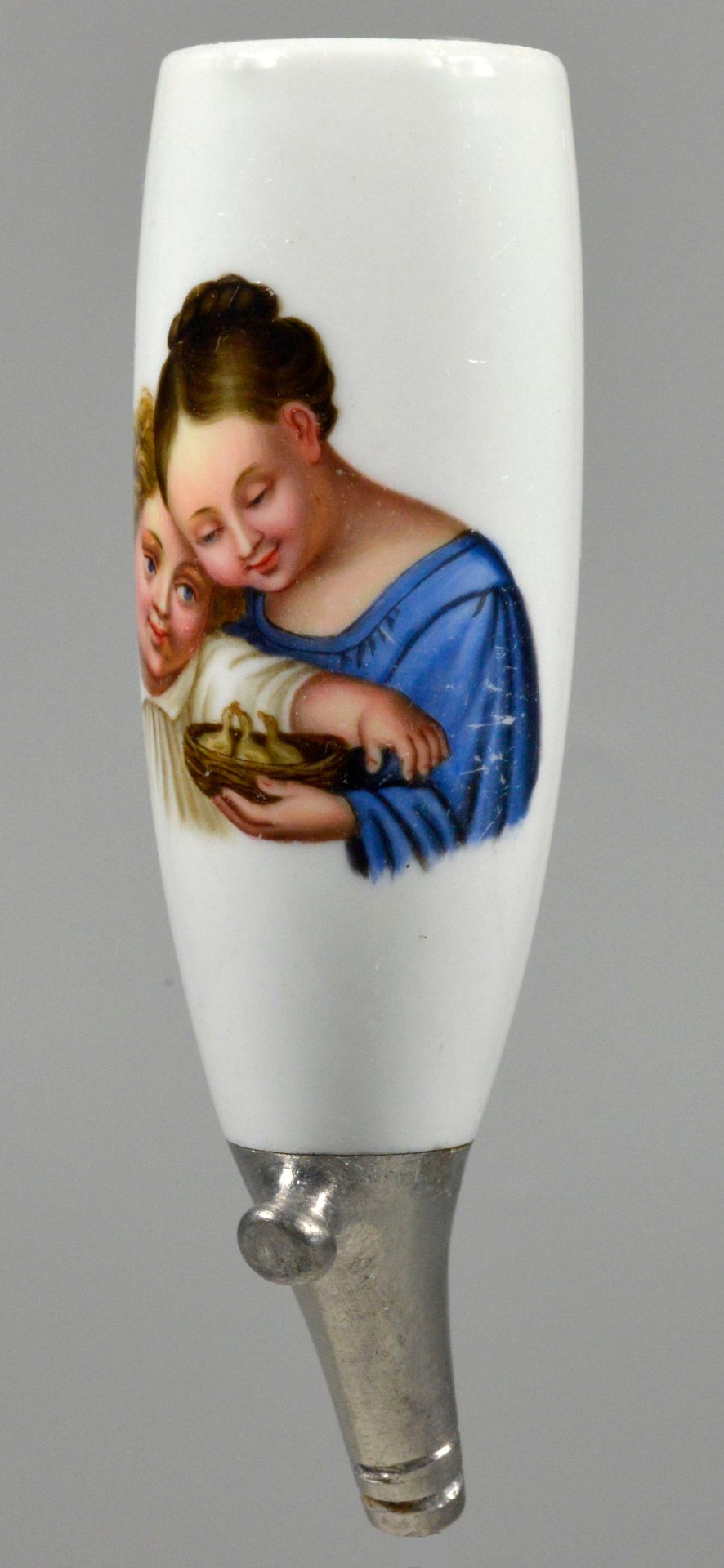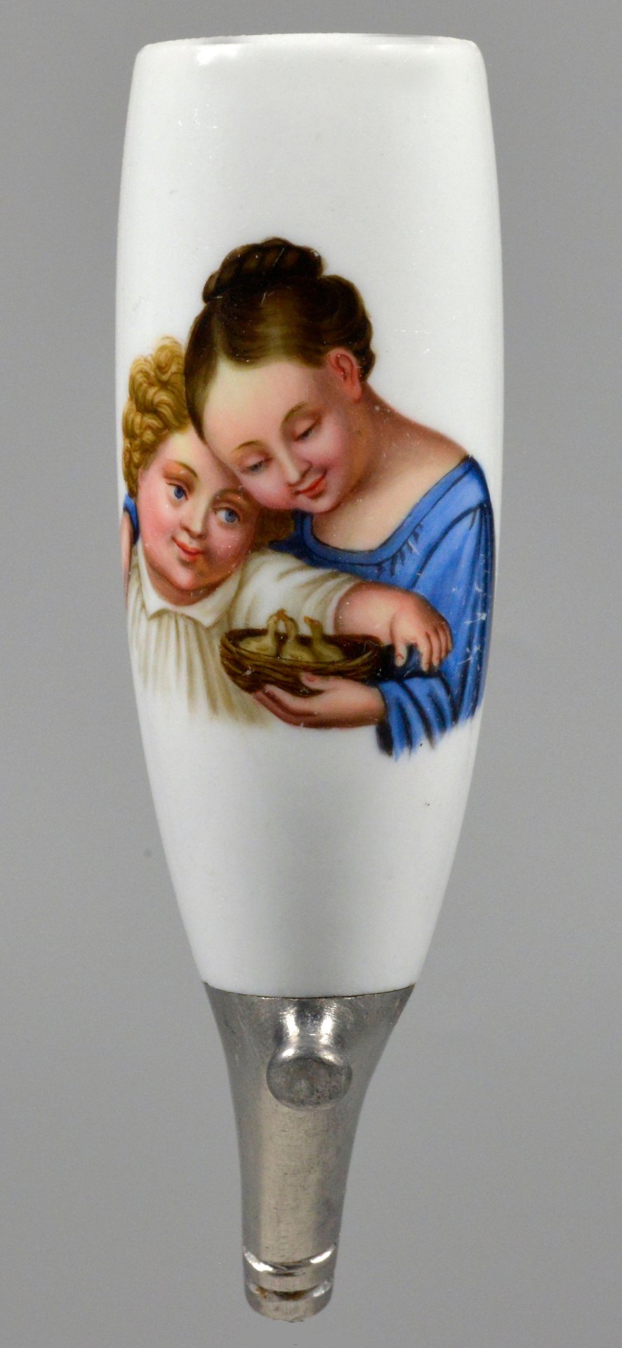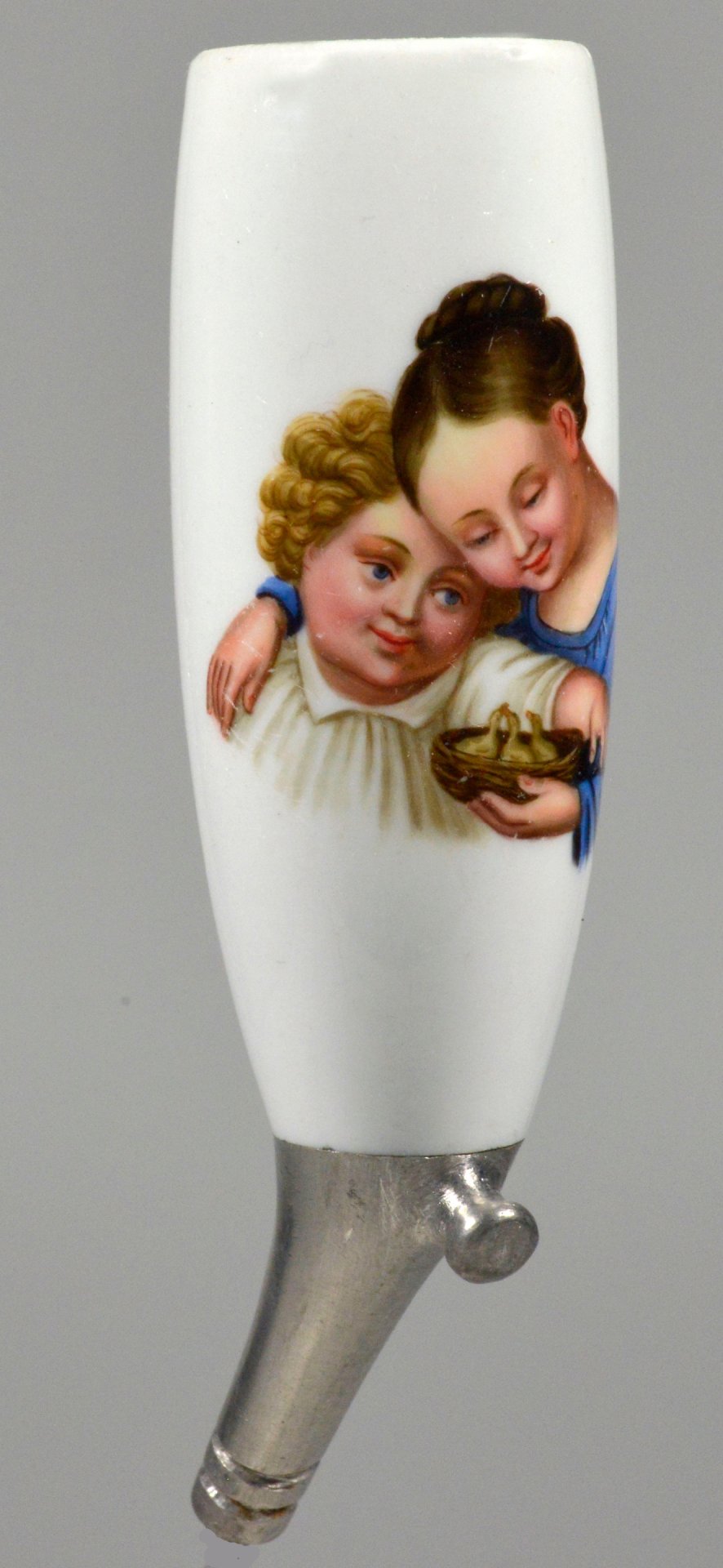 Pfeifenstummel aus Porzellan, Berliner Form, auf der Schauseite mit bunten Muffelfarben in feiner Lupenmalerei Darstellung zweier Kinder, die ein Vogelnest mit Küken in den Händen halten und diese freudig und neugierig betrachten. Der Stiel ist bis zur Ferse ersetzt durch eine Nachbildung aus Zinn. H=12,2cm