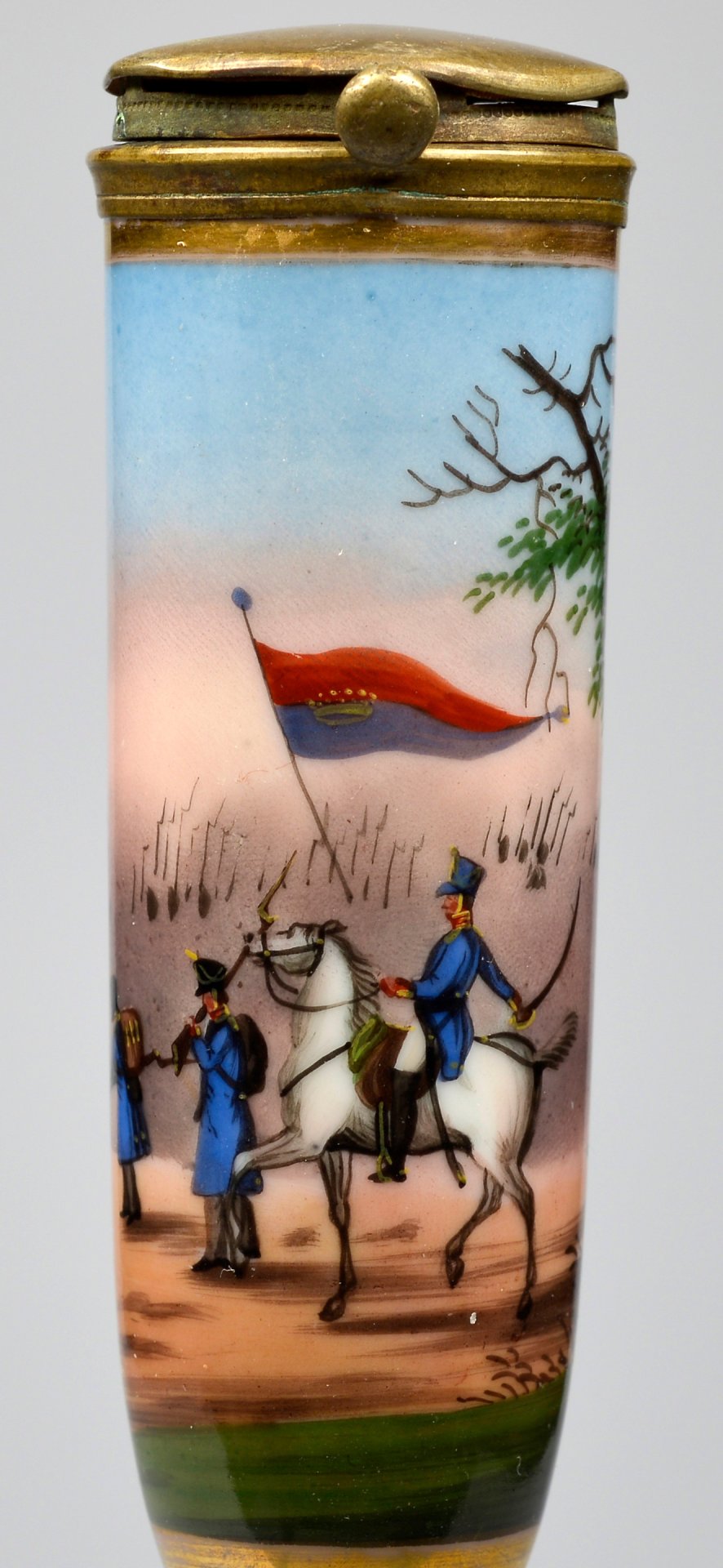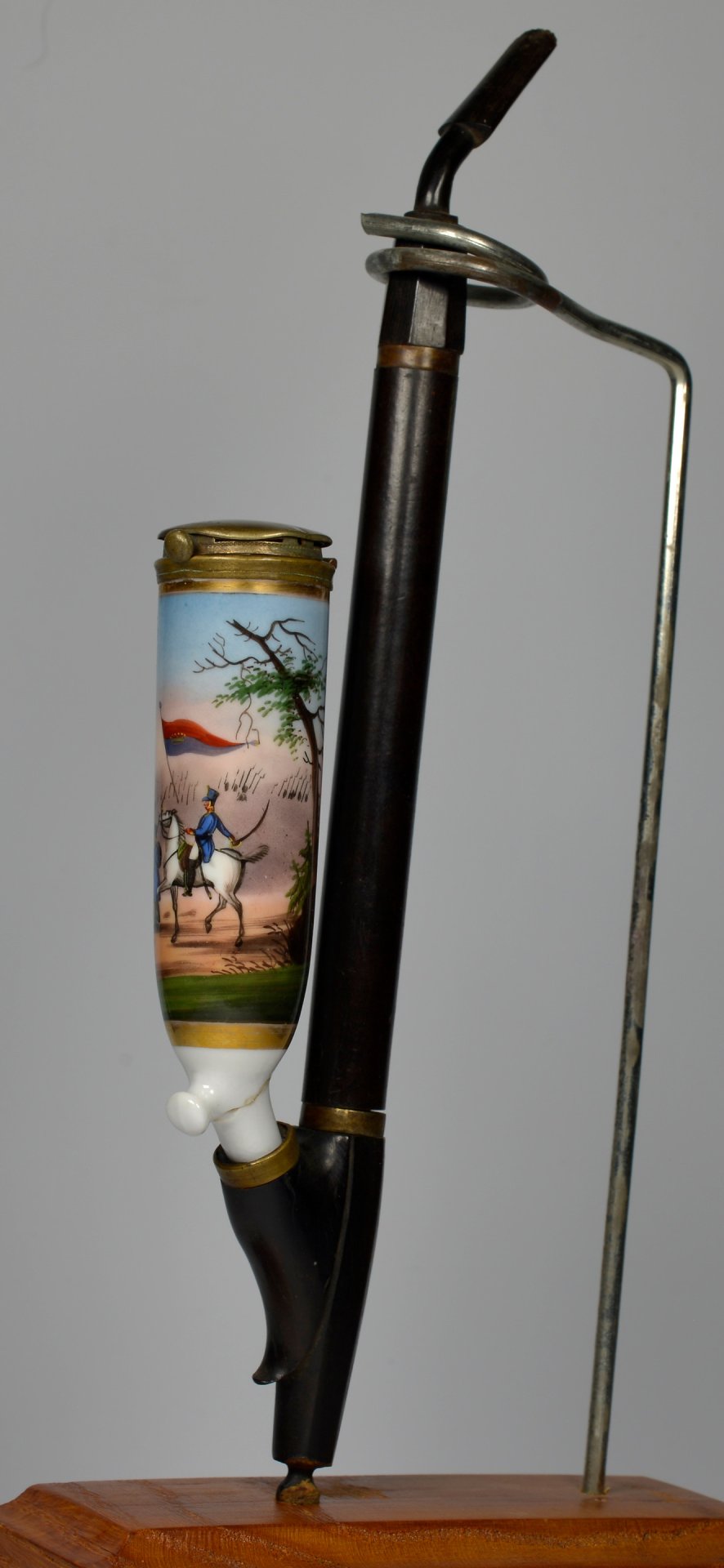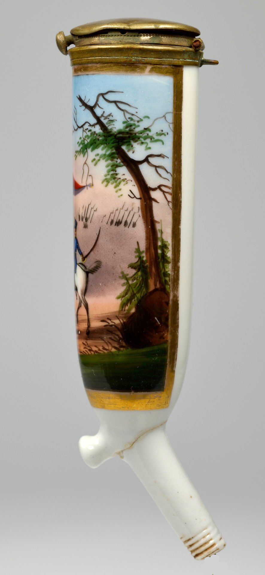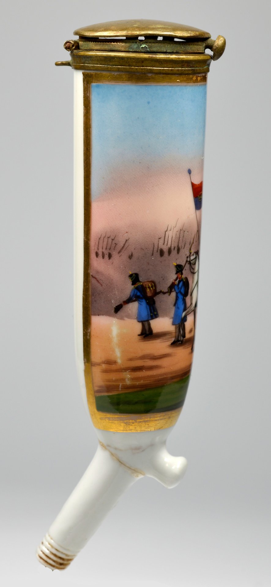 Pfeifenstummel aus Porzellan, zylindrischer Korpus; zu 2/3 umlaufend den Korpus umspannendes, goldgerahmtes Bildfeld; darin mit bunten Muffelfarben Darstellung von 2 Soldaten in blauen Uniformen und schwarzen Tschakos und einem Offizier auf einem Schimmel reitend. Über der Szene weht eine rot-blaue Fahne mit goldener Krone und Zierpunkten, deutlicher Hinweis auf das Königreich Hannover in zeittypischer hannoverscher Kavallerie- oder Infanteriebekleidung der ersten Hälfte des 19. Jahrhunderts. Im Hintergrund mehrere aufgerichtete Gewehre, vermutlich Teil einer Paradeaufstellung; ohne Marken; Montur: Messing, H=12,8cm (a=122; b=96,1; c=28,4mm)