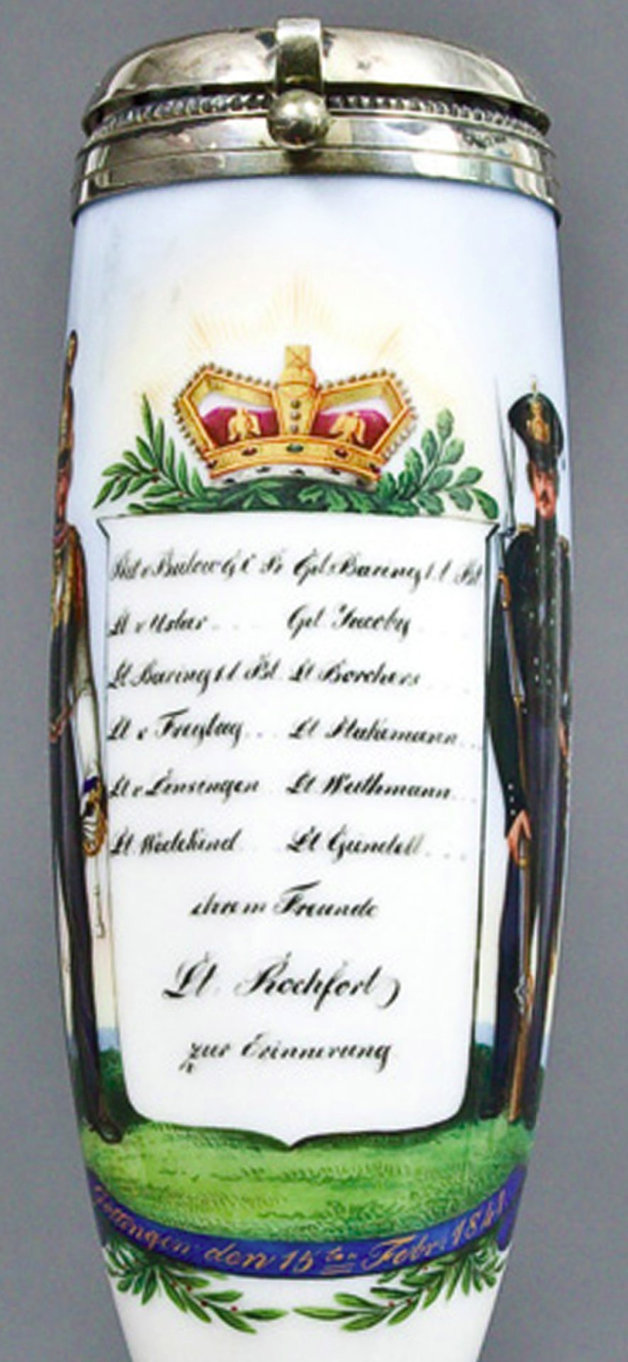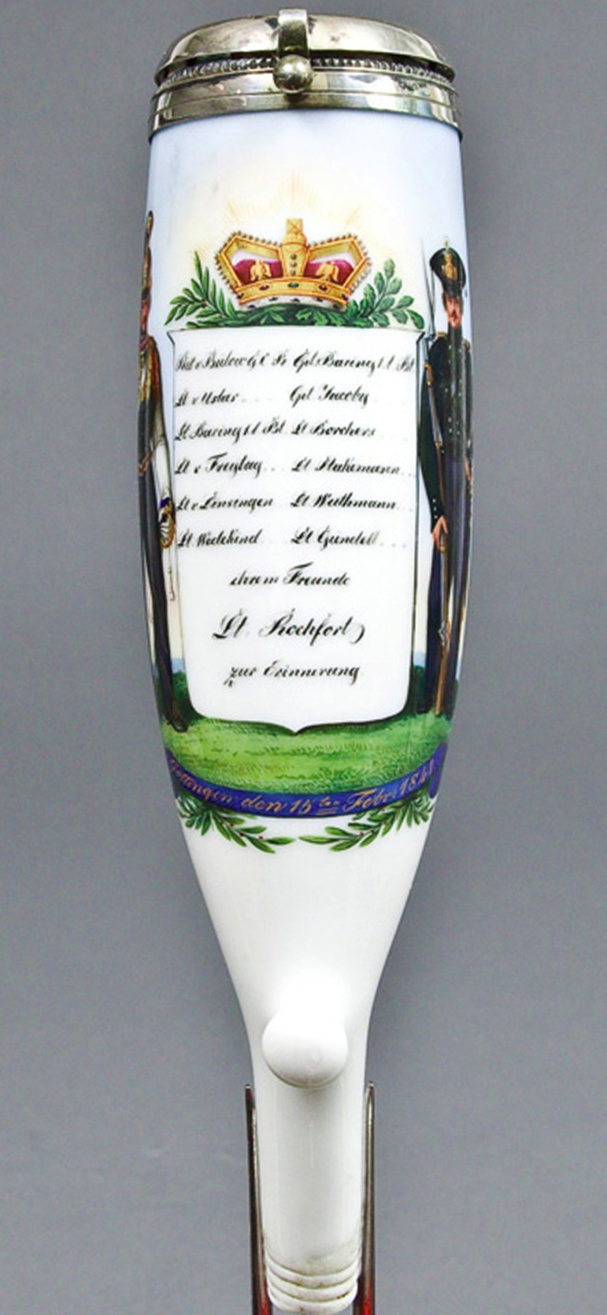 Pfeifenstummel aus Porzellan, Berliner Form; in bunten Muffelfarben auf hellblauem Fond eine in Form eines Wappenschildes ausgesparte weiße Kartusche; in schwarzer Schreibschrift in zwei Reihen nebeneinander je 6 Namen von Offizieren mit Rangbezeichnung, darunter Widmung: „ihrem Freunde Lt. Rochfort zur Erinnerung“. Links und rechts als Schildhalter je ein Soldat der Armee des Königreichs Hannover; wohl Größe 9, im Kessel unter Glasur senkrechter blauer Strich, Montur: Silber, H.: 15,0 cm.