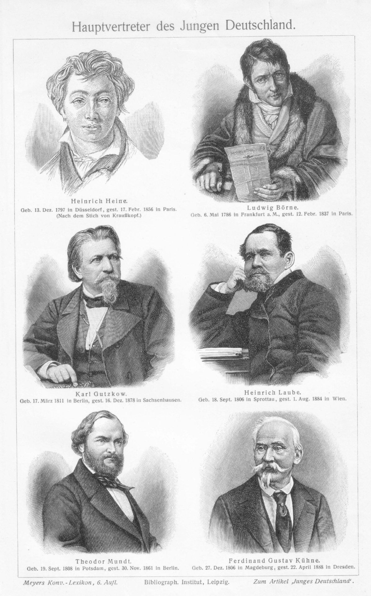 Holzstich aus Meyers Konv.-Lexikon, 6. Aufl., Bibliograph. Institut, Leipzig 1896, zum Artikel „Junges Deutschland“, nach einer Lithographie (siehe Lithografischen Anstalt von F. C. Vogel nach einem Gemälde von Moritz Oppenheim (zwischen 1827 und 1843). © Institut für Stadtgeschichte, Ffm.Sign. S7P Nr. 1495).7 x 6,5cm