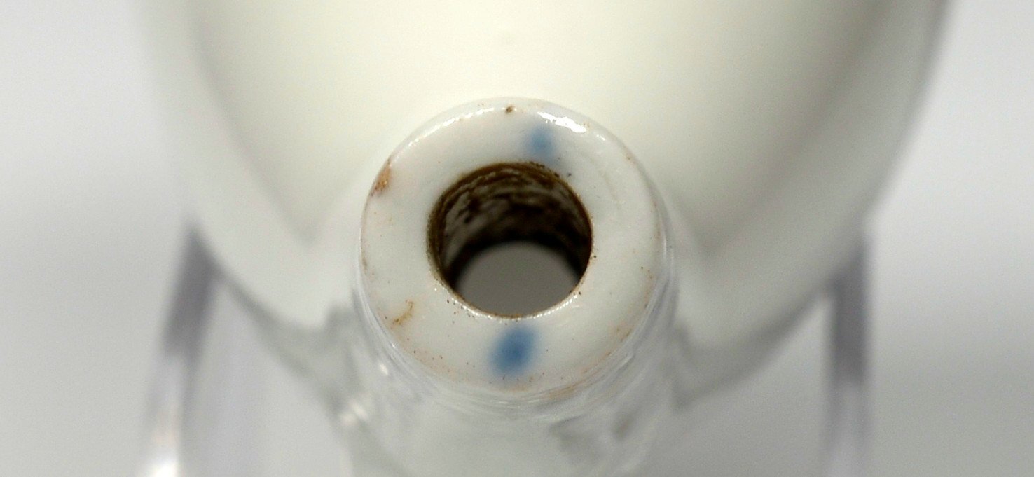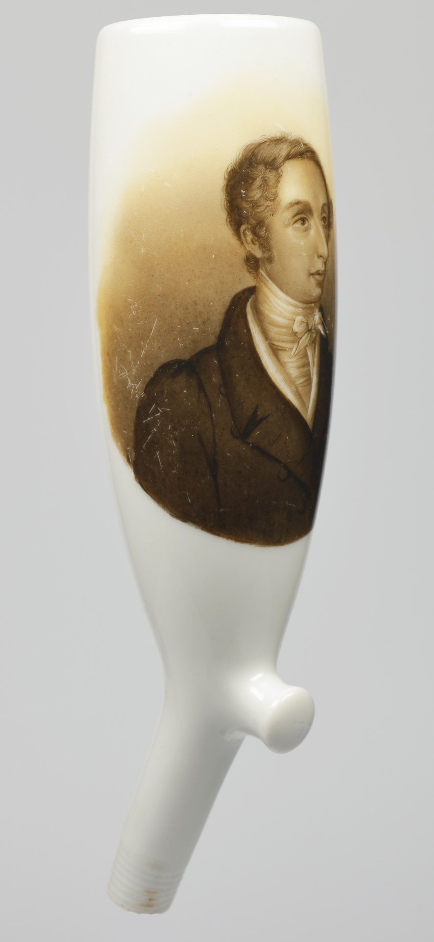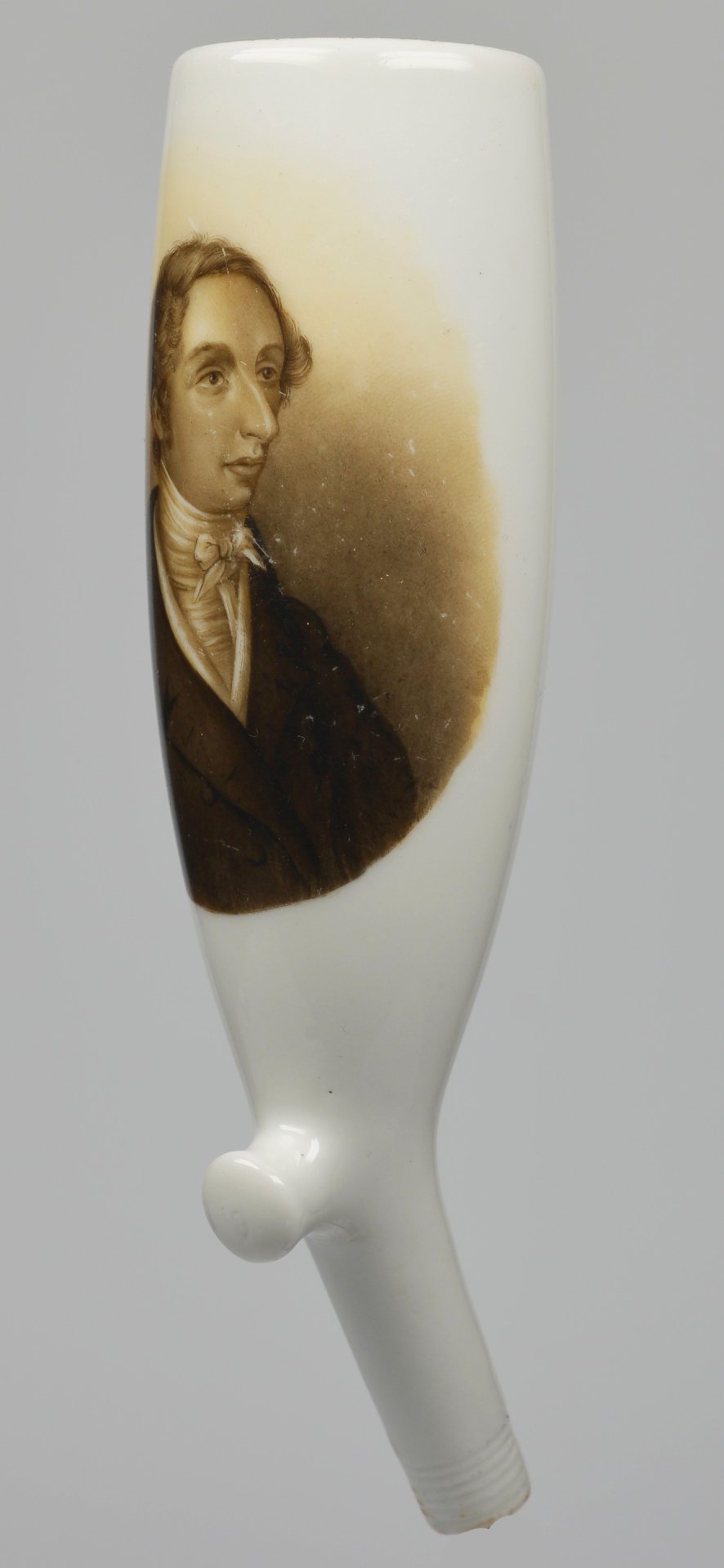 Pfeifenstummel aus Porzellan, Berliner Form; auf der Wandung zu Hälfte den Korpus umspannendes ovales Bildfeld; darin in Grisalemalerei das Halbportrait von Gottlob Nathusius (1760-1835) in jungen Jahren; blauer Querstrich am Stielende; Pressmarke 9 auf Stummelferse. H.: 13,86cm (b=107,5; c=37,9 mm)
