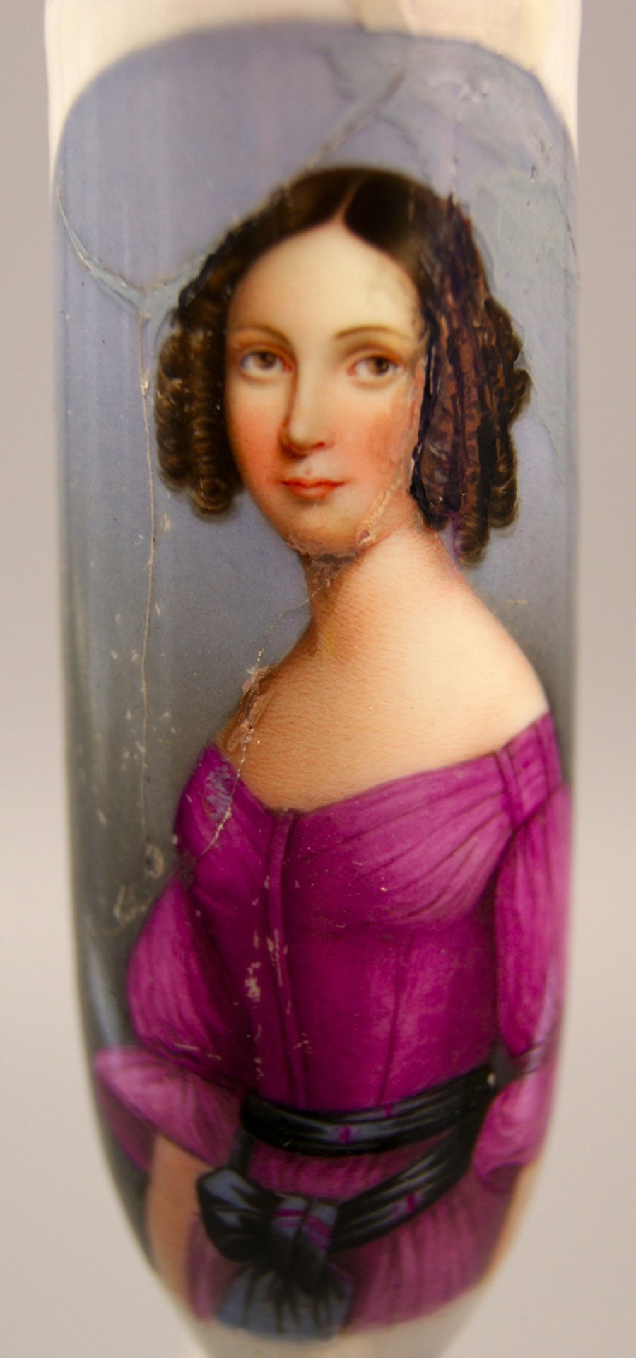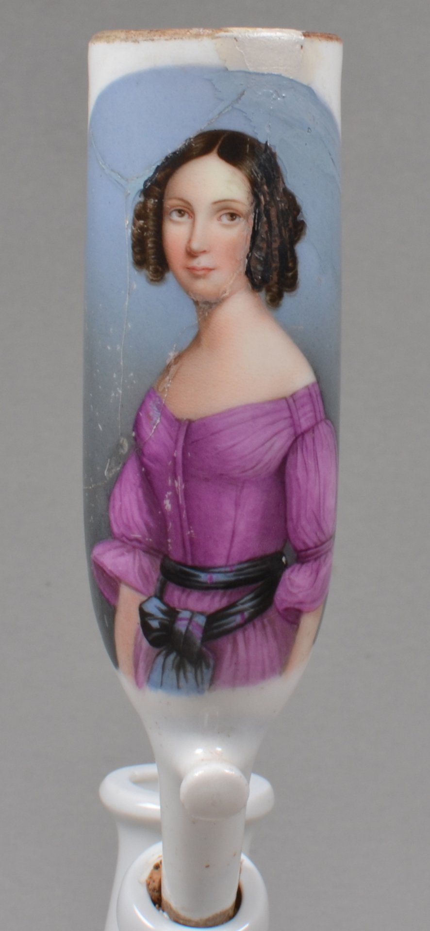 Pfeifenstummel aus Porzellan, zylindrischer Korpus; auf der Schauseite in bunten Muffelfarben das Halbportrait einer Dame mit losem Gürteltuch und Schleife um die Taille. Sehr starke Schäden restauriert; Stummelferse 8. Vorlage ist ein Stahlstich, bezeichnet „Magdalena“, Blatt: 25,8 x 19,5 cm; Darstellung: ca. 11 x 8,5 cm. Veröffentlichung mit freundlicher Genehmigung, Mai 2016, von Aurelio Fichter, Frankfurt