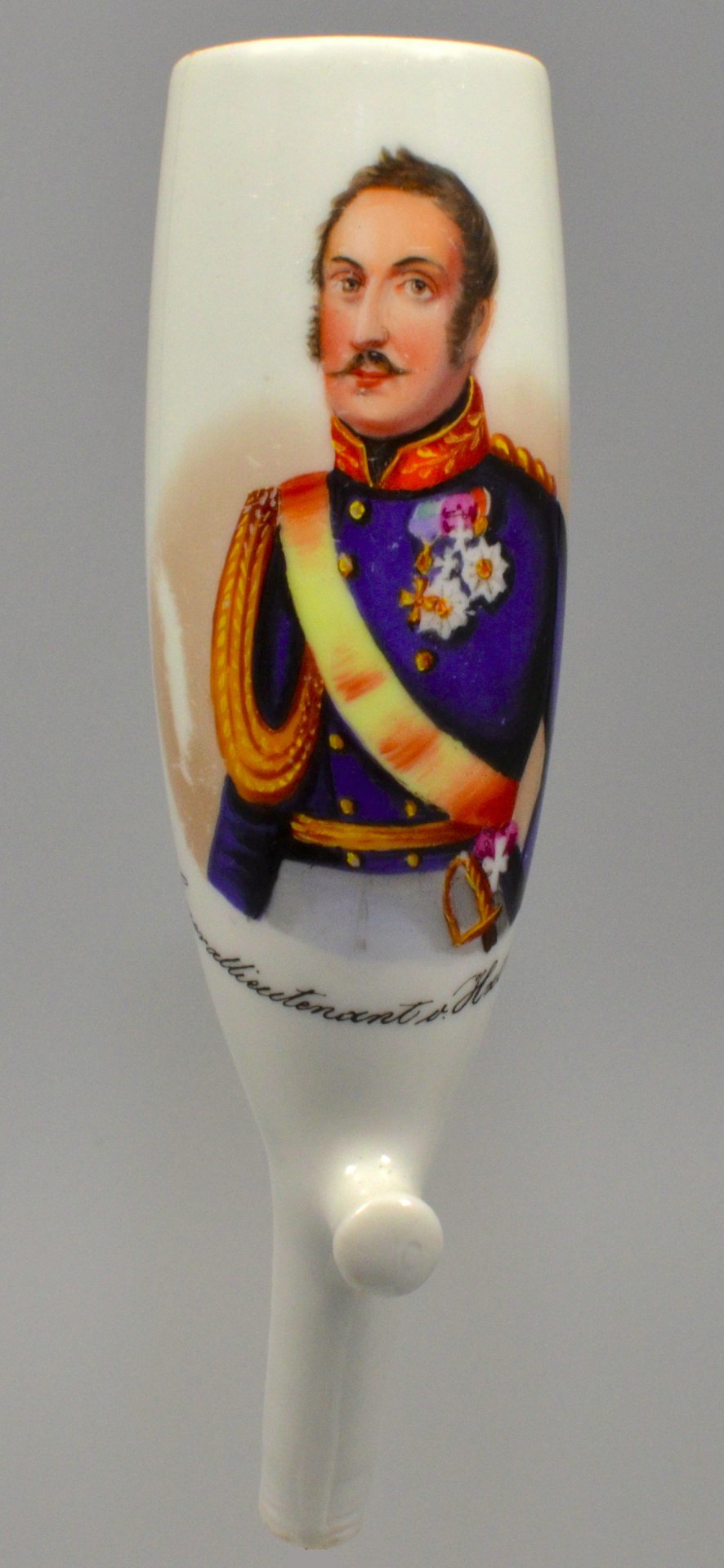 Pfeifenstummel aus Porzellan, Berliner Form, auf der Wandung mit bunten Muffelfarben zur Hälfte  den gesamten Korpus umspannende Darstellung von Generalleutnant von Halkett, Ferse mit Presszahl 10, H.: 14,7cm