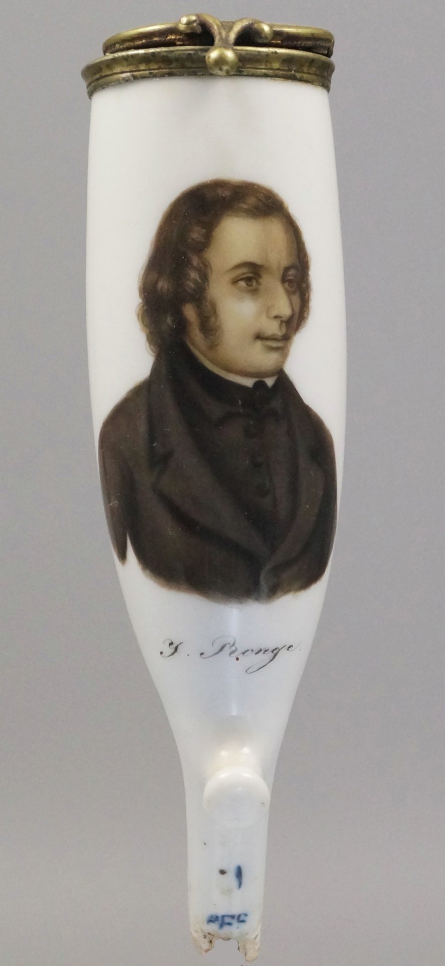 Pfeifenstummel aus Porzellan, Berliner Form, auf der Schauseite in brauner Sepia-Malerei das Brustportrait von Johannes Ronge (1813-1887), darunter in brauner Handschrift „J. Ronge“; auf dem Stiel unterglasurblau PFS unter Strich; Ferse mit Presszahl 8; Montur: Neusilber; H.: 13,5 cm (a=131; b=103; c=36 mm)