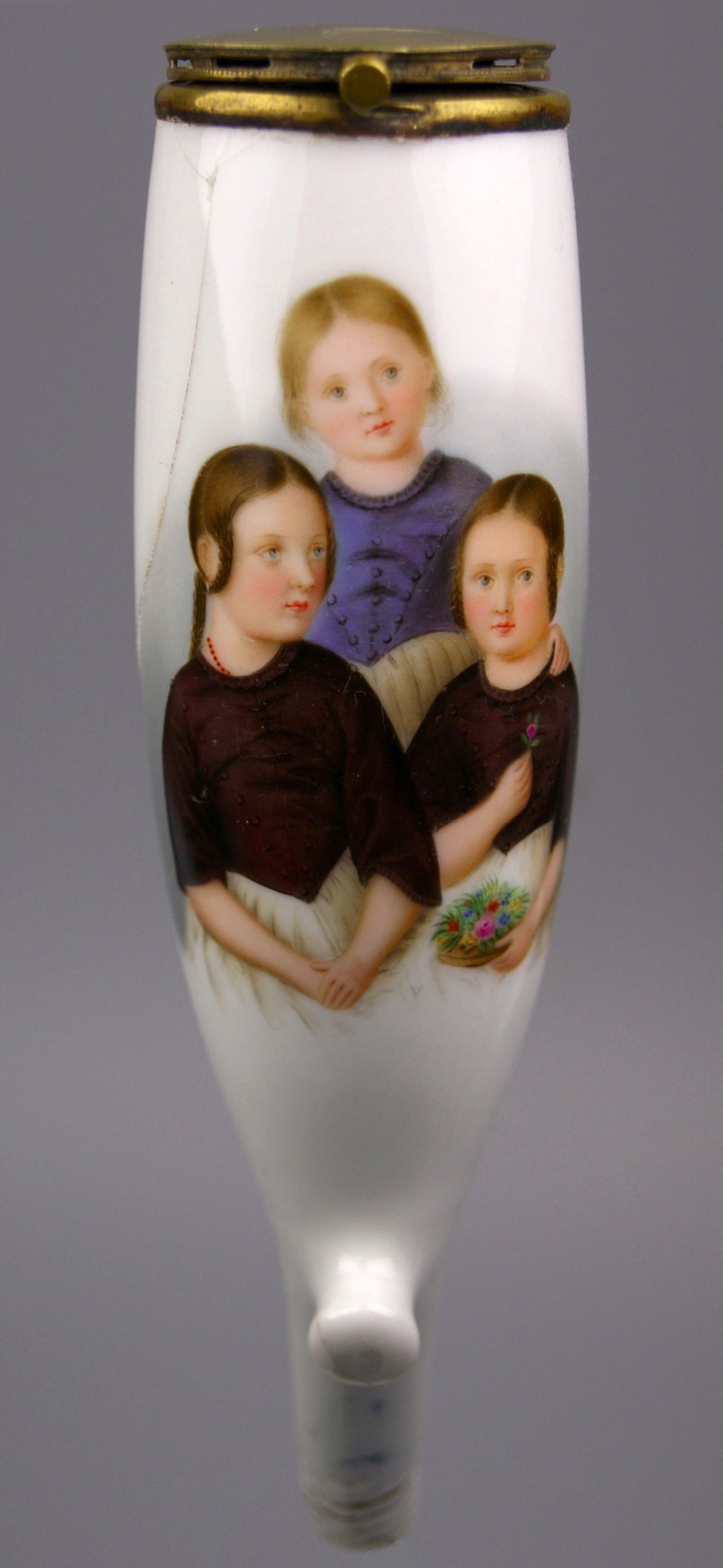 Pfeifenstummel aus Porzellan, Berliner Form; auf der Schauseite in bunten Muffelfarben drei Geschwister der Familie Sies. Auf dem Stiel unter Glasur leicht eingepresst in Blau die Buchstaben PFS unter senkrechtem Strich, Innenraum authentisch mit Schamotte ausgekleidet; Seitlich loser Ausplatzer; Montur Messing, Ferse Presszahl 10. H.: 15,5cm