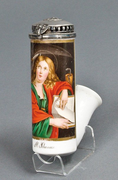 Pfeifenstummel aus Porzellan, „Zylindrischer Korpus, Abguss vom ungarischen Typ (Morgenrorh Nr. 19); in bunten Muffelfarben Darstellung des Apostel Johannes beim Abfassen der Offenbarung nach einem Gemälde von Domenico Zampieri, gen. Domenichino (1581-1641), vermutlich nach einem Stich von Christian Friedrich Müller (1783-1816). Montierung: Silber; auf dem Deckel eine Rosette; Schnapper als Blüte geformt. H=10,5 cm