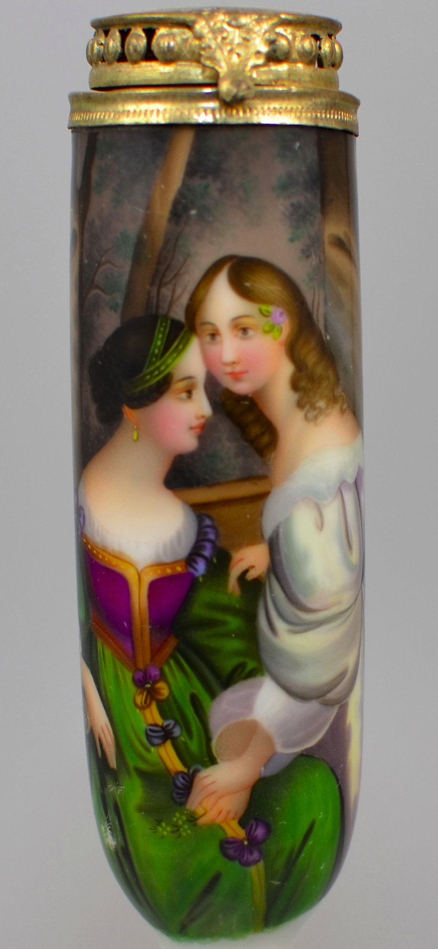 Pfeifenstummel aus Porzellan, zylindrische Form; auf der Schauseite in bunten Muffelfarben die Darstellung eines zugewandten Geschwisterpaares, sich gegenseitig die Hände haltend; nach dem Gemälde von Fanny Corbaux (1812-1883). Am Stielboden unterglasurblauer Querstrich, Ferse mit Presszahl 8, Silbermontur. H.: 13,6 cm (a=133; b=105; c=33 mm)