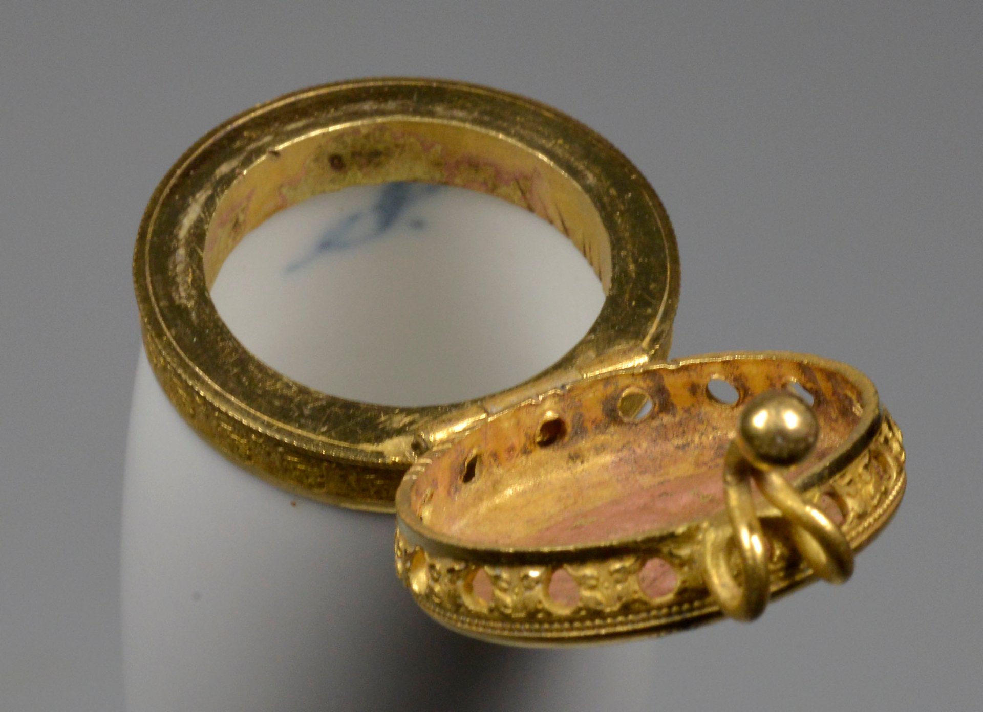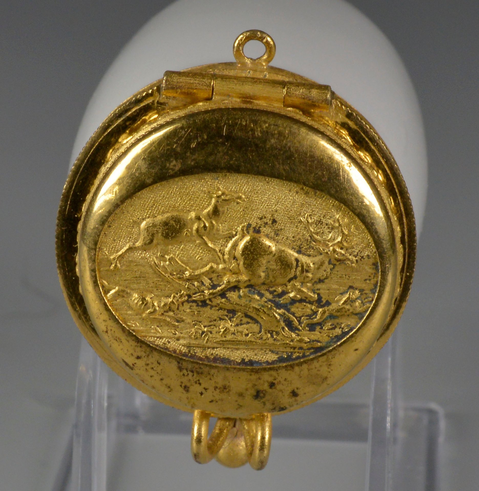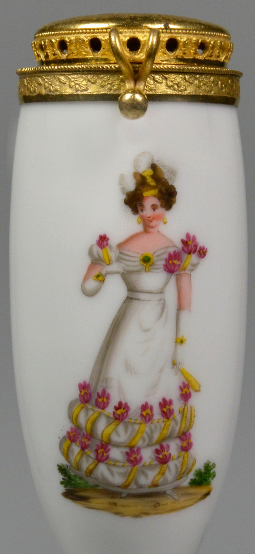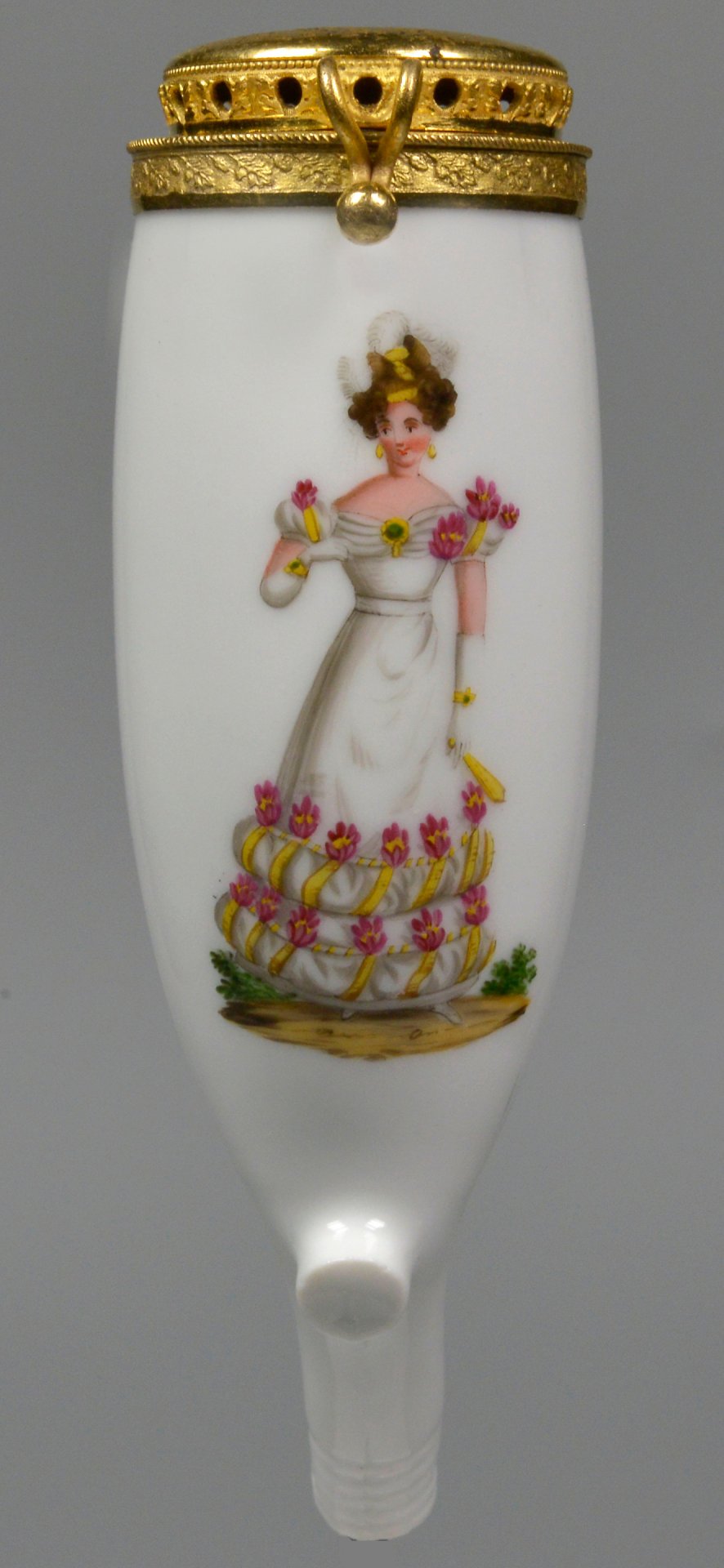Pfeifenstummel aus Porzellan, Meissner Form, mit bunten Muffelfarben auf der Schauseite Darstellung einer Frau mit roten Blumen zweireihig am unteren Saum und an den Puffärmeln ihres weißen Kleides, unterglasurblaue „geschwungene S-Marke mit Punkt“; Ferse mit Pressmarke I, Montierung: Messing, vergoldet; im Deckel eingeprägt: Rotwild von Jagdhund verfolgt. H.: 11cm (a=103: b=83; c=34,7mm; alpha=40)