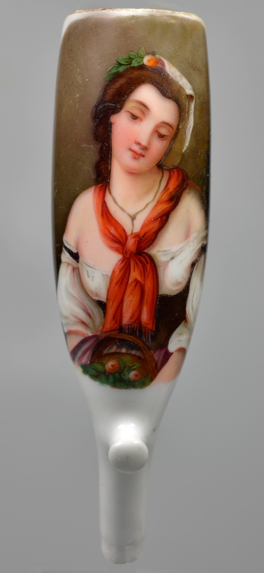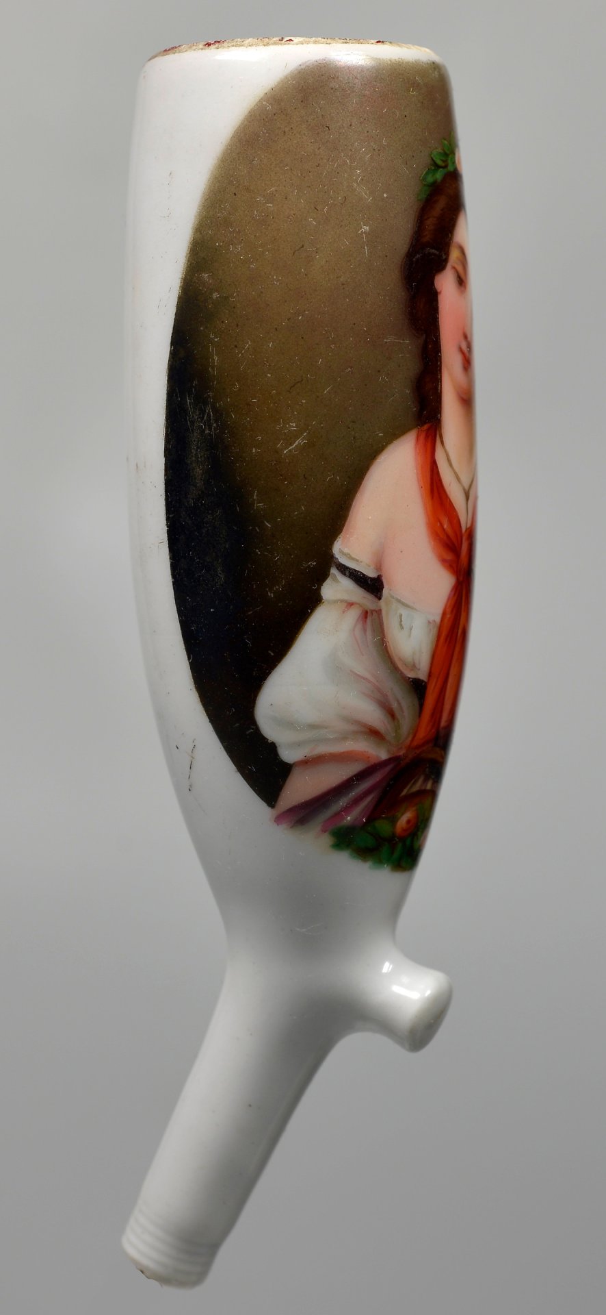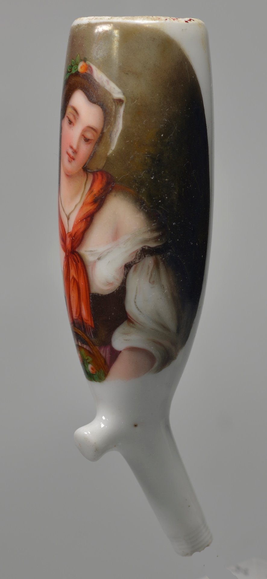 Pfeifenstummel aus Porzellan, auf der Schauseite ¾ den Korpus umfassendes Oval mit bräunlichem Fond, darauf in bunten Muffelfarben eine junge Römerin im Halbportrait, den Kopf träumend geneigt mit rotem Schal. H = 12,9 cm (b = 101; c = 36,4 mm)