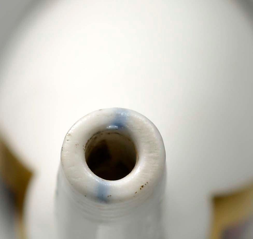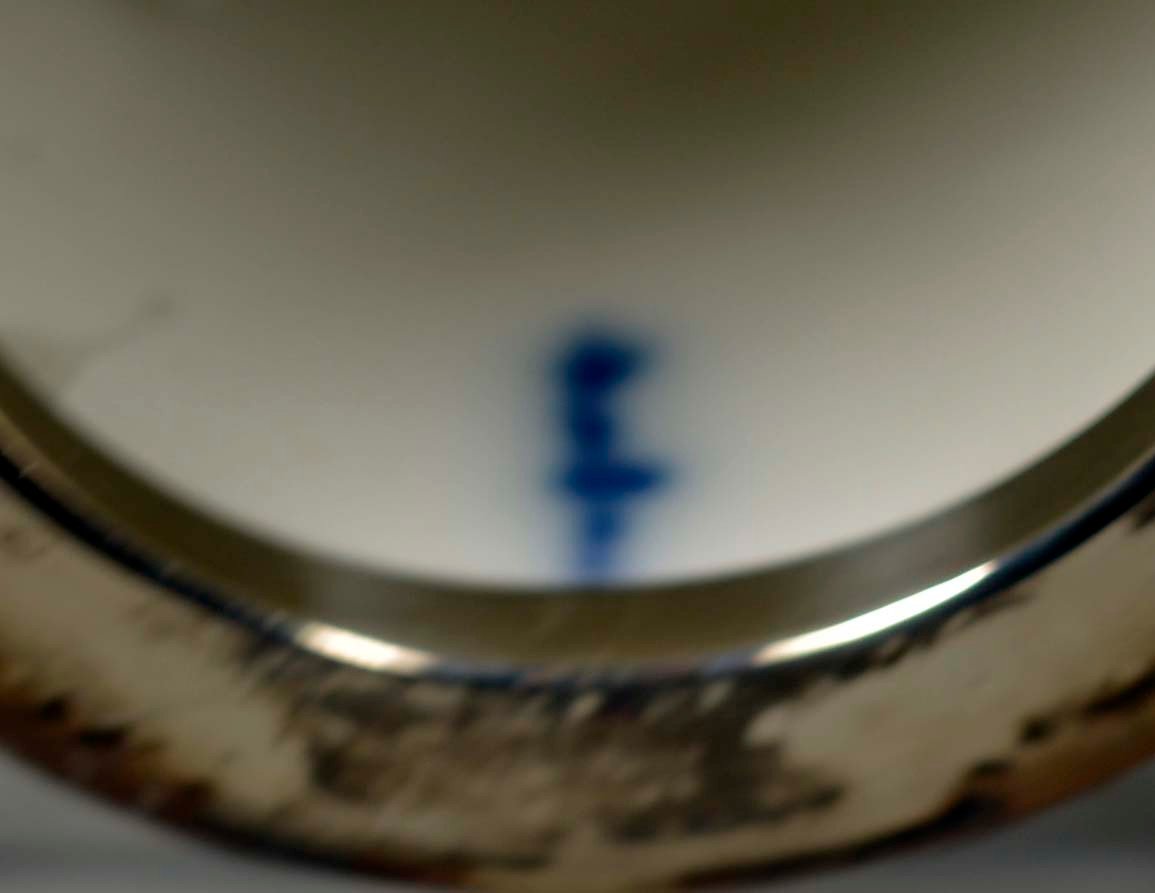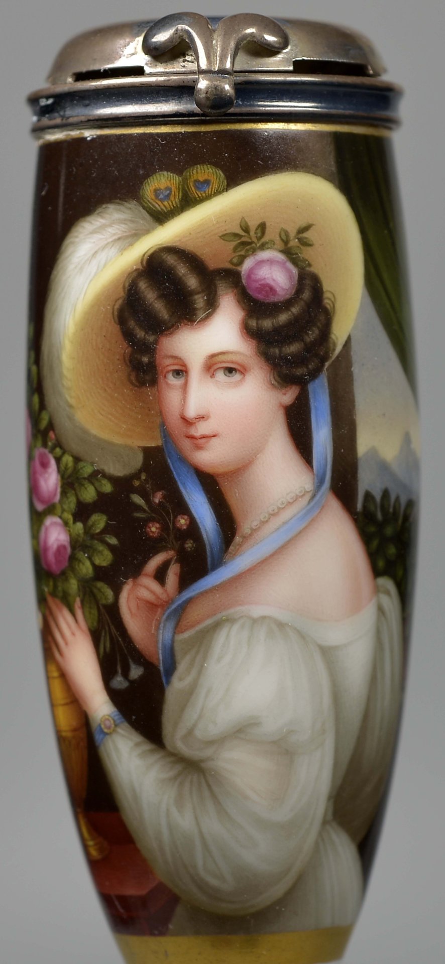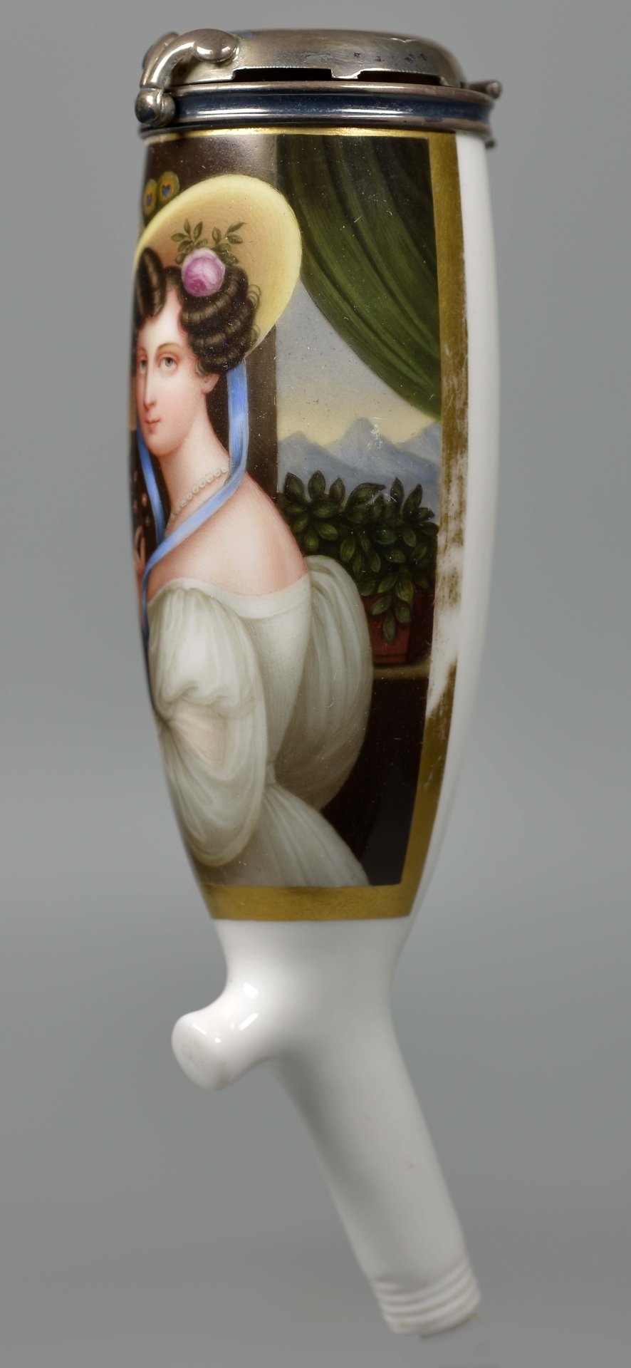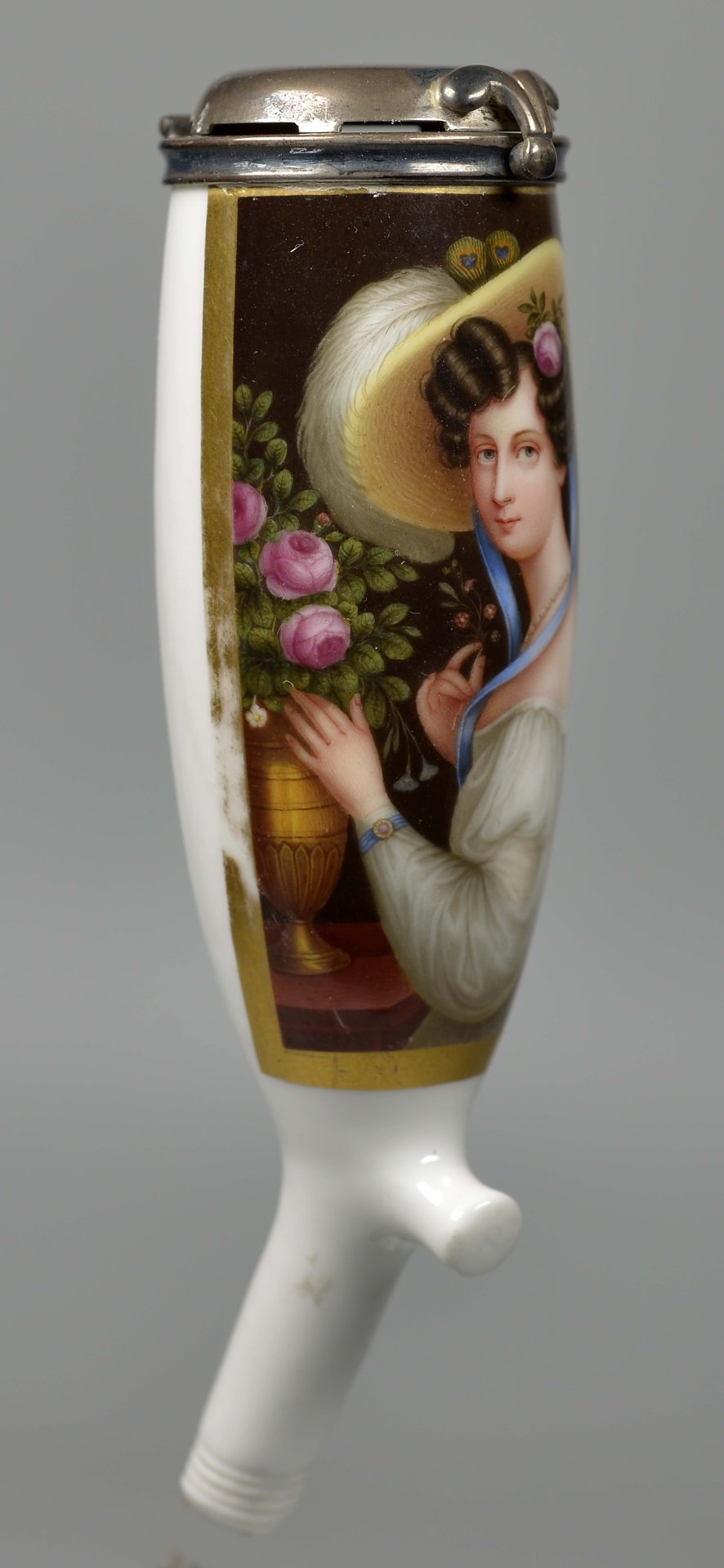 Pfeifenstummel aus Porzellan, Berliner Form, ¾ den Korpus umfassende Goldleiste, darin mit bunten Muffelfarben Halbporträt einer jungen Dame; sie steht seitlich zum Betrachter, dem sie ihr Gesicht zuwendet. Sie ist damit beschäftigt, einen Strauß Rosen zu ordnen, der in einer kostbaren goldenen Kratervase vor ihr steht. Sie trägt ein schulterfreies weißes Musselinkleid mit langen Ärmeln. Ihre schwarzen Haare sind in der Mitte gescheitelt und zu Locken aufgedreht. Im Haar trägt sie eine Rose; die Kopfbedeckung besteht aus einem gelben Hut mit breiter Krempe, der durch eine weiße Reiherfeder und dunkle Straußenfedern geschmückt ist. Die blauen Bänder, mit denen er festgebunden werden kann, hängen lose über Schultern und Dekollete herab. Als Schmuck trägt sie eine Perlenkette und am linken Arm ein Band aus blauem Stoff, an dem ein goldenes, mit Perlen eingefasstes Medaillon befestigt ist. Rechts im Hintergrund blickt man durch ein Fenster auf Beete und auf einen Kasten mit Grünpflanzen, der auf der Fensterbank steht. Im Kessel unter Glasur die blaue Szeptermarke, Stummelferse mit Pressmarke 8, am Stielende der unterglasurblaue Querstrich; Montierung: Silber (Nachbildung). H = 13,1 cm (a=125; b=96,3; c=36,9mm)