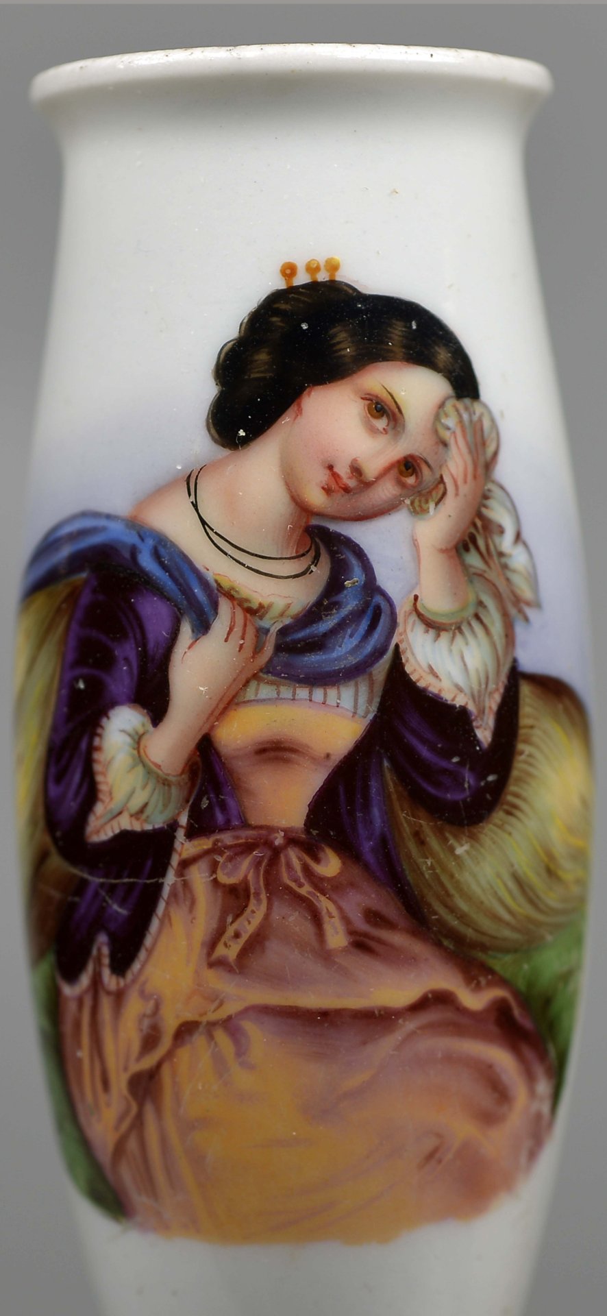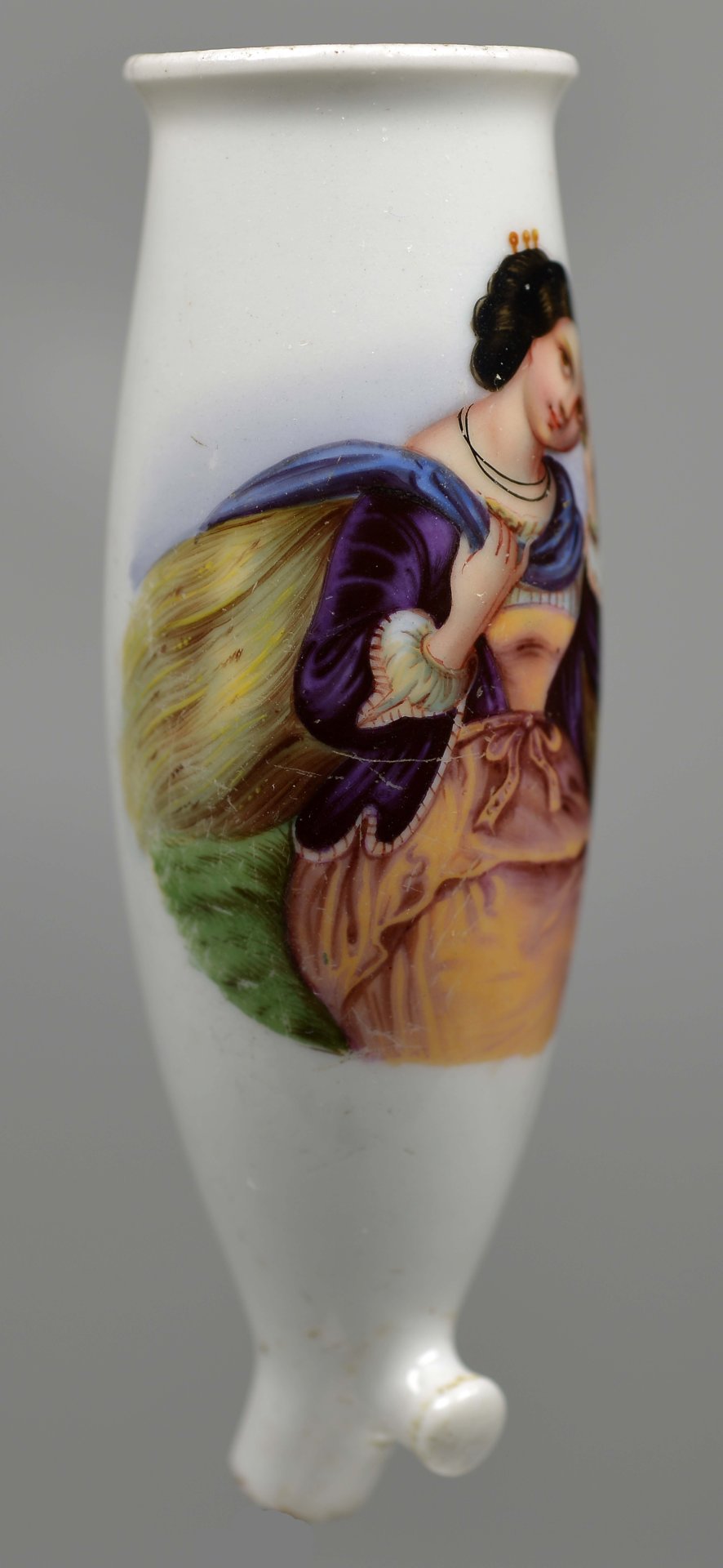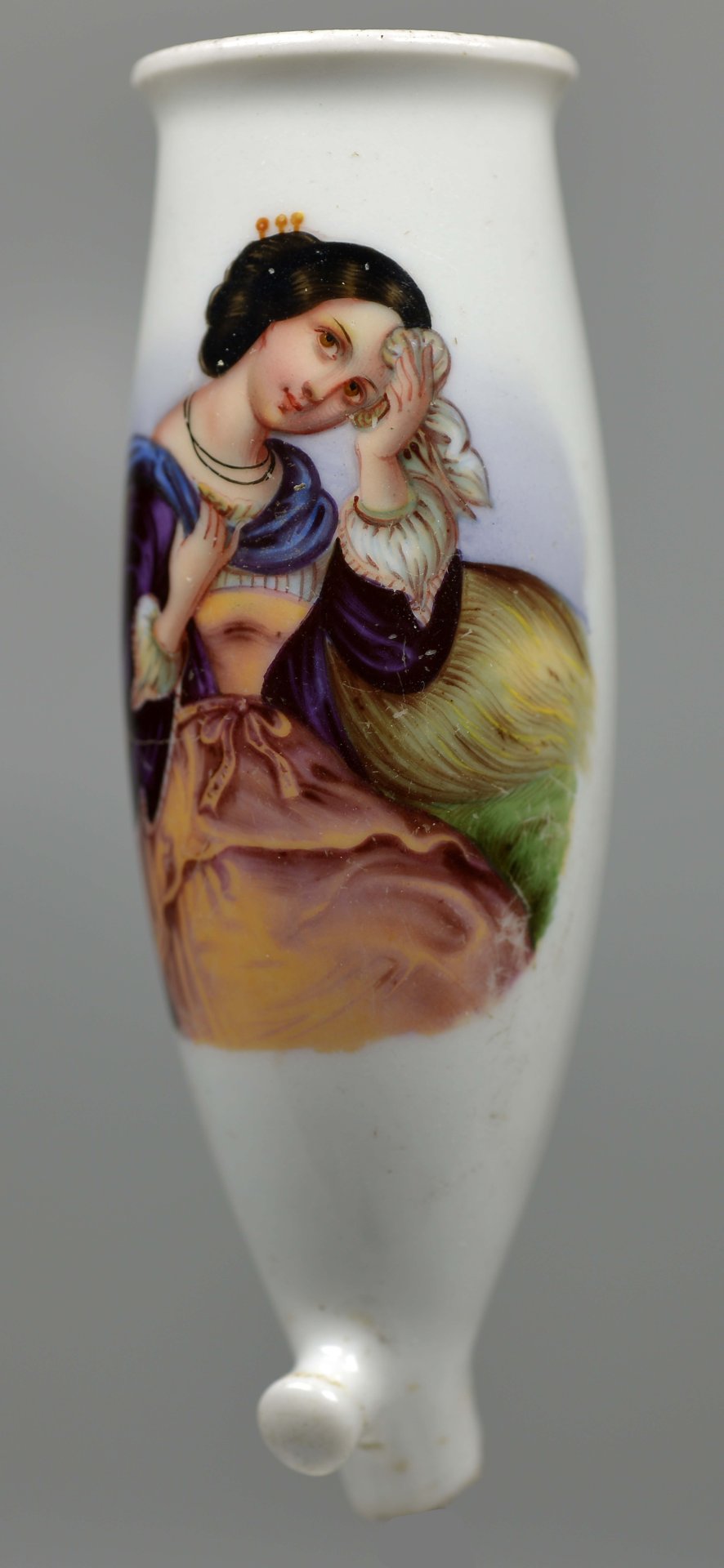 Pfeifenstummel aus Porzellan mit ovalem Korpus, oben ausgezogen; auf der Schauseite in bunten Muffelfarben Darstellung einer jungen Frau sitzend im Halbportrait; sie hält mit der rechten Hand einen um das Dekolletee geschlungenen blauen Schal; mit der linken tupft sie sich mit einem weißen Tuch die Stirn ab; um den Hals trägt sie ein doppeltes schwarzes dünnes Band. Stummelferse mit der Presszahl „7“; Stiel unterhalb der Ferse abgebrochen CF, wohl Christian Fischer, Pirkenhammer. (b=96,6; c=35,0mm=