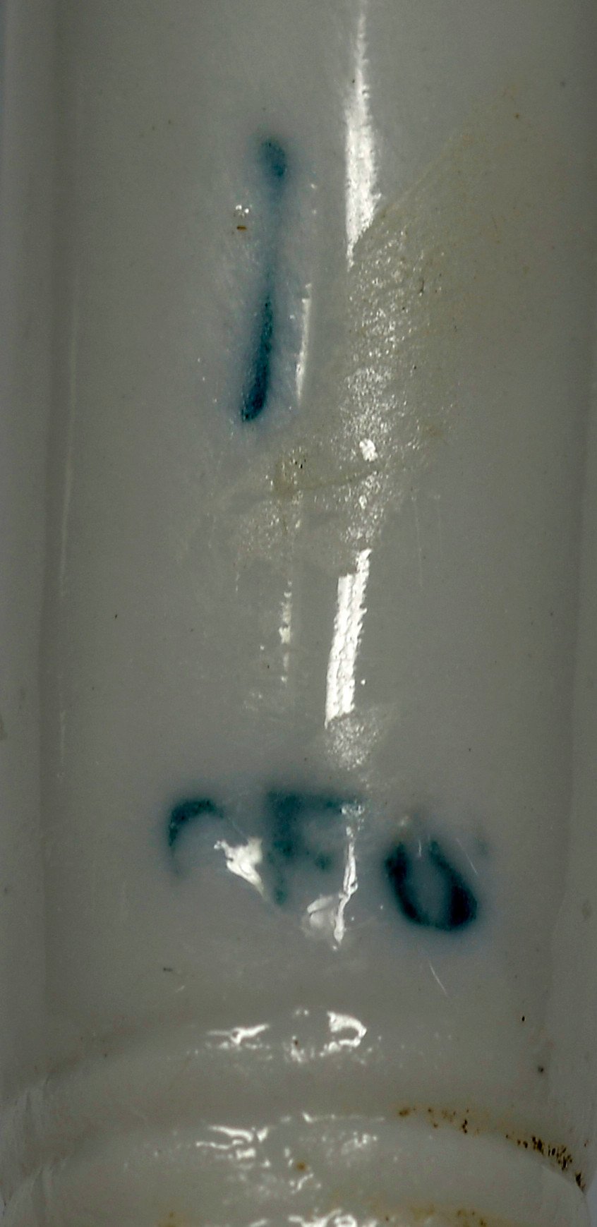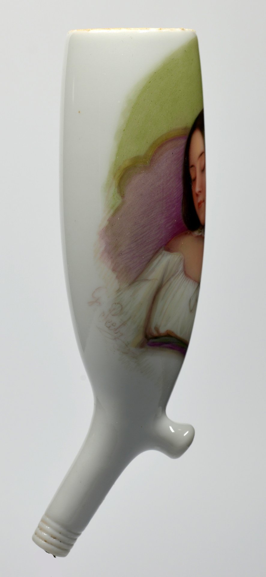 Pfeifenstummel aus Porzellan, Berliner Form, den Korpus zu 2/3 umfassend mit zarten Muffelfarben bemalte Darstellung eines älteren Kindes im Halbportrait; links neben der Abbildung eine Signatur „G. Peetry“; Stummelferse Pressmarke 8; am Stiel unter Strich Pressmarke PFS; H=13,8cm (b=108,8; c=38,2mm)