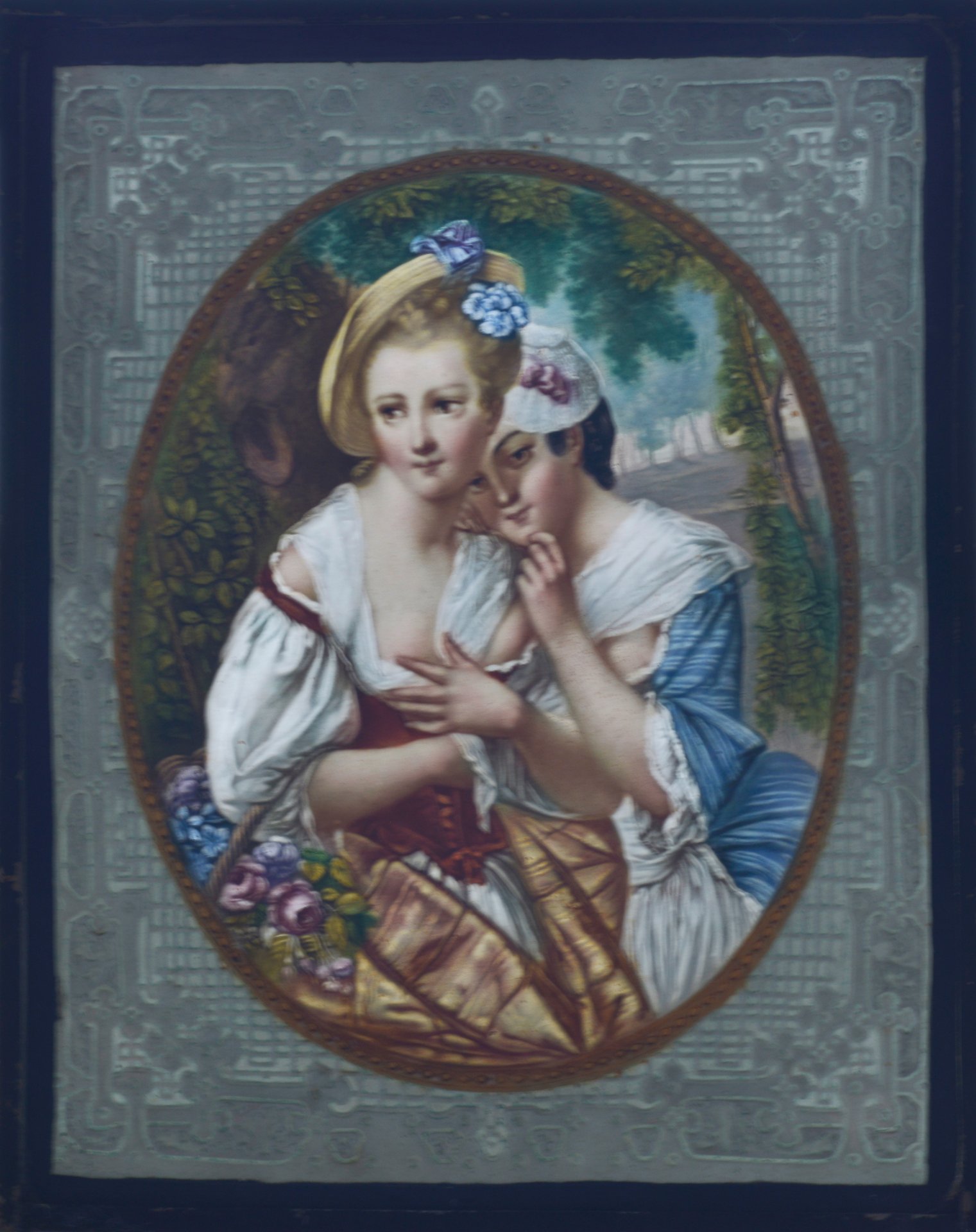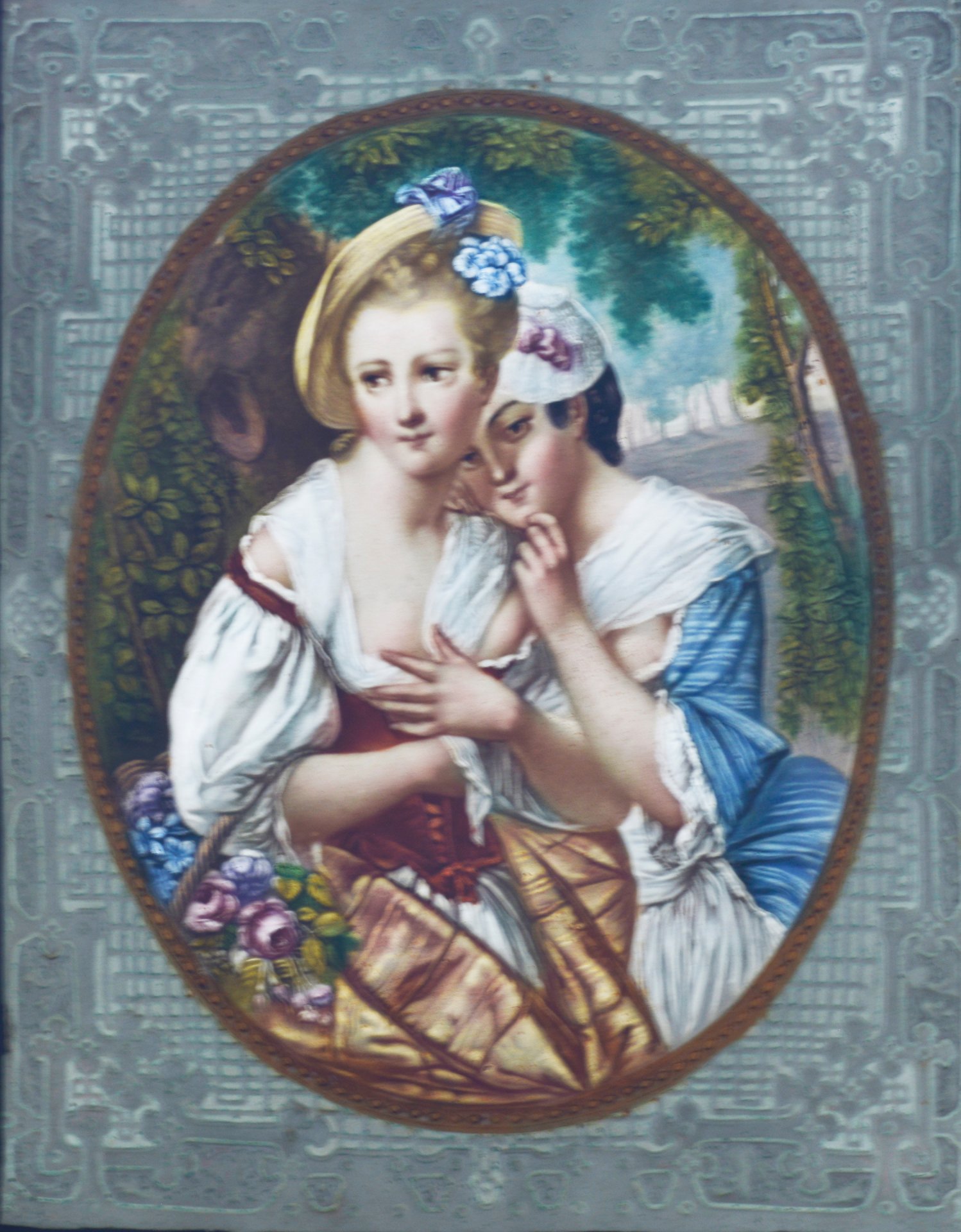 Lithophanie, außen mit einfarbigen Ornamenten und innen Oval von plastischem Perlfries umgeben, darin polychrome Porzellanmalerei mit Darstellung zweier eng aneinander geschmiegter Mädchen; Erstausformung um 1849, im Preis-Courant 1851/52 bezeichnet: „Zwei Mädchen in Roccoco Costüm“; Rückseite und Rand Vorderseite unten Mitte: Ritzmarke 226; oberhalb der Modellnummer mit Bleistift der Eintrag: Meissen 21.8.18 (wohl die Anmerkung des Vorbesitzers 1918); bleiverglaste Platte anschließend in Blechrahmen verbracht; Platte mit Blechrahmen = 25 x 19,5 cm.