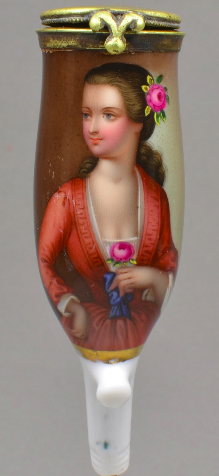 Pfeifenstummel, ovaler Korpus, sich oben erweiternd (Morgenroth Nr. 45); in bunten Muffelfarben ein junges Mädchen miteiner Rose vor dem tiefen Dekolletee haltend und eine weitere als Haarschmuck; undeutliche Presszahl auf der Ferse; wohl unterglasurblau PFS unter Strich, Montur: Messing. H.: 9,8 cm (a=94; b=72; c=30 mm)