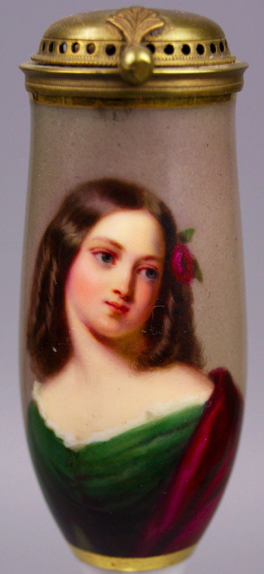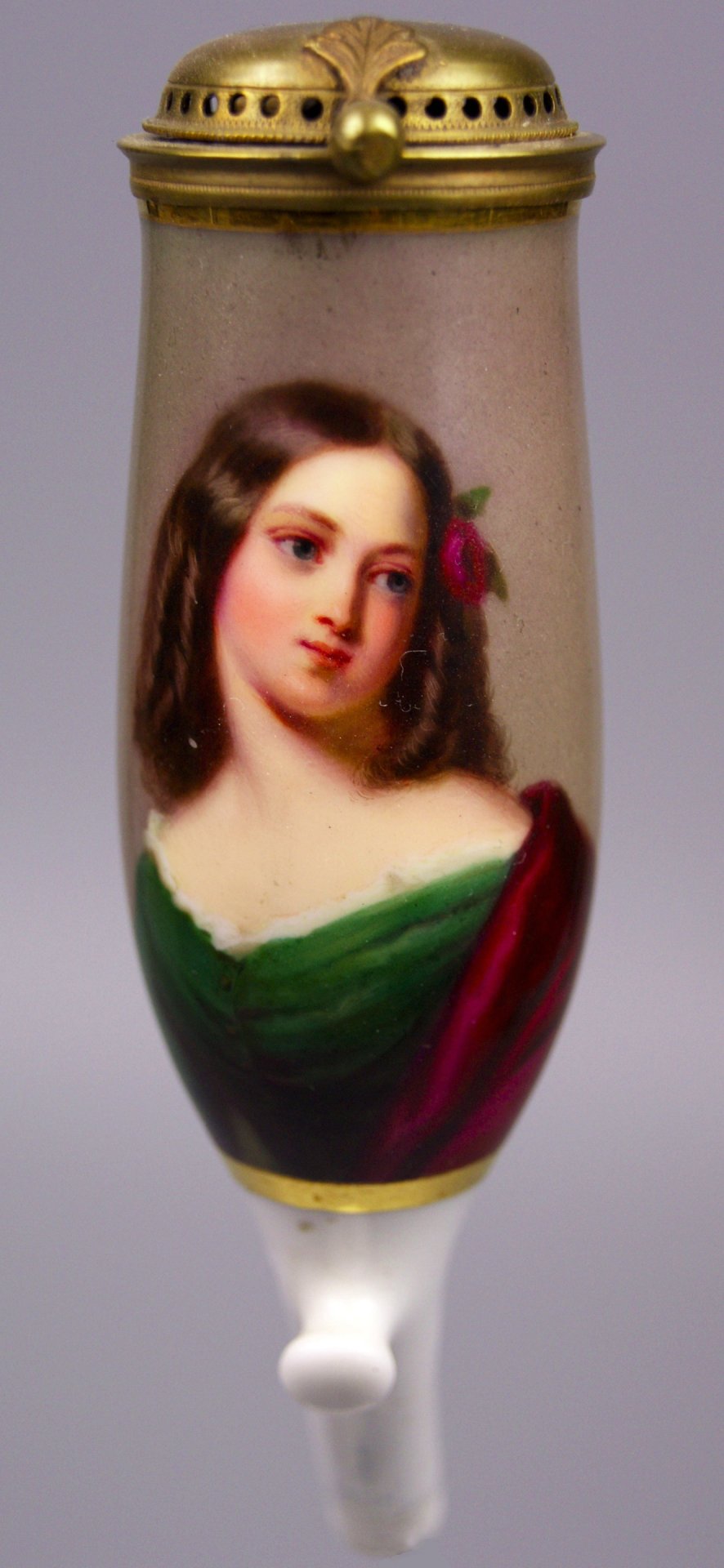 Pfeifenstummel aus Porzellan, ovaler Korpus, oben ausgezogen; auf der Wandung drei Viertel umlaufend, in Gold gerahmtes Bildfeld, in bunten Muffelfarben ein Halbportrait eines jungen Mädchens mit Rose im Haar und grüner Bluse auf monochromen ockerfarbigem Fond. Stummelferse Presszahl 8, auf dem Stiel Blaumarke PFS unter Strich; Montierung Messing (später ergänzt), H.: 11,6cm