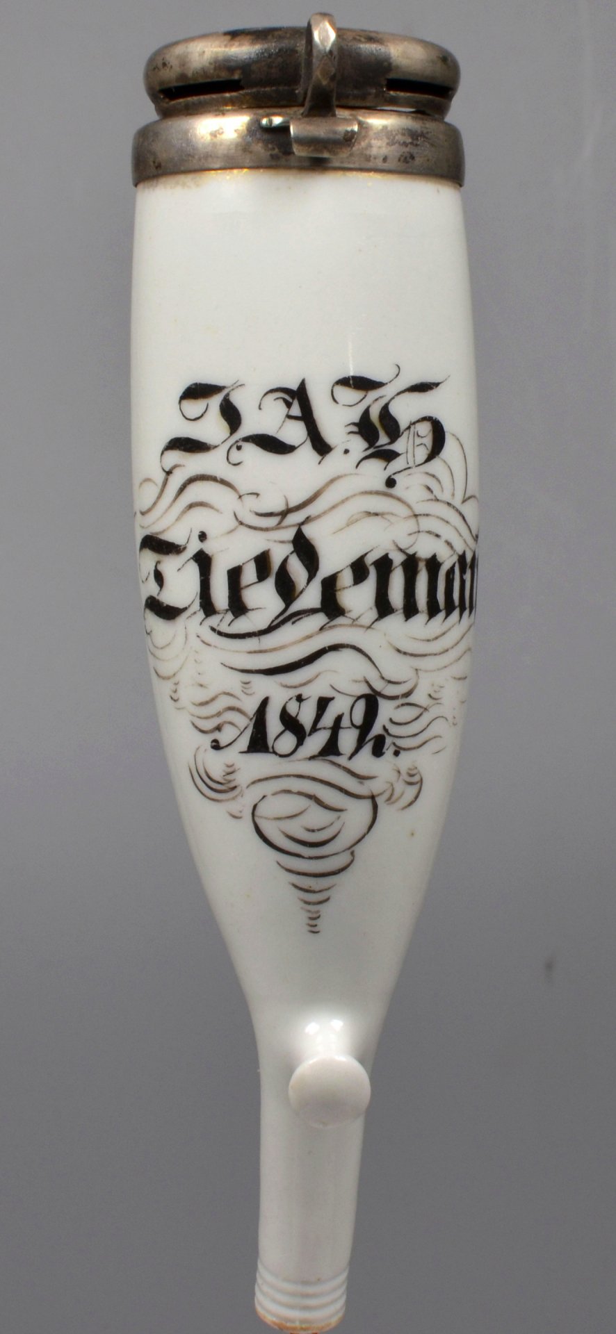 Pfeifenstummel aus Porzellan, Berliner Form, auf der Schauseite in Schwarz (Gold geränderte Konturen verwischt) der Namenszug „L.A.H.Tiedemann“ mit Jahresangabe 1842 od. 1849. Auf der Rückseite in schwarzer Schreibschrift: