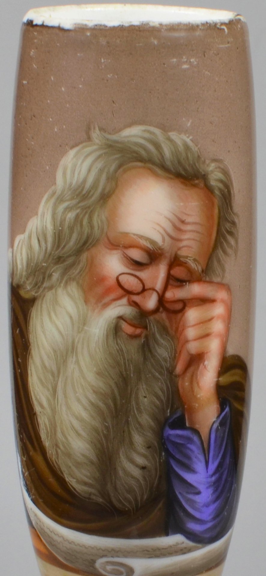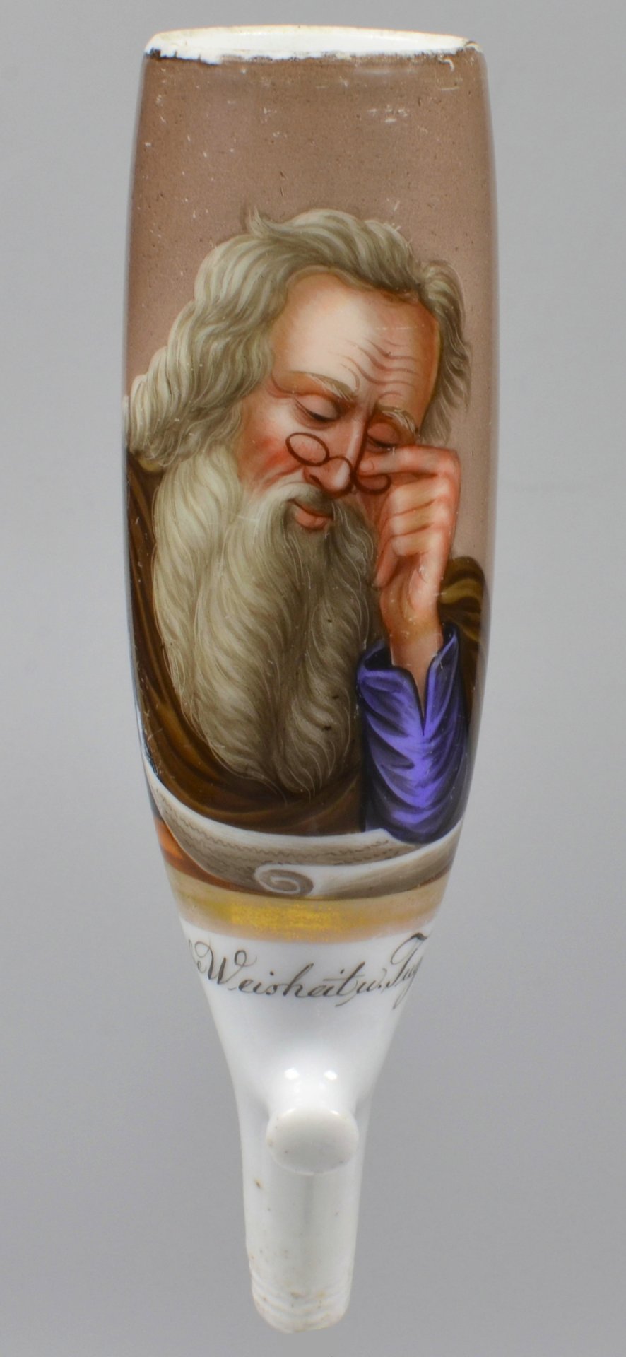 Pfeifenstummel aus Porzellan, Berliner Form, in rechteckiger, ¾ den Korpus umfassender, Gold gerahmter Kartusche mit bunten Muffelfarben die Darstellung eines bärtigen Gelehrten mit Brille und Blick auf eine Schriftenrolle; darunter in schwarzer Schreibschrift: „Uebe Weisheit u. Tugend.“; Ferse mit Presszahl 8; . H.:12,9 (a=129; b=100; c=34,3 mm)