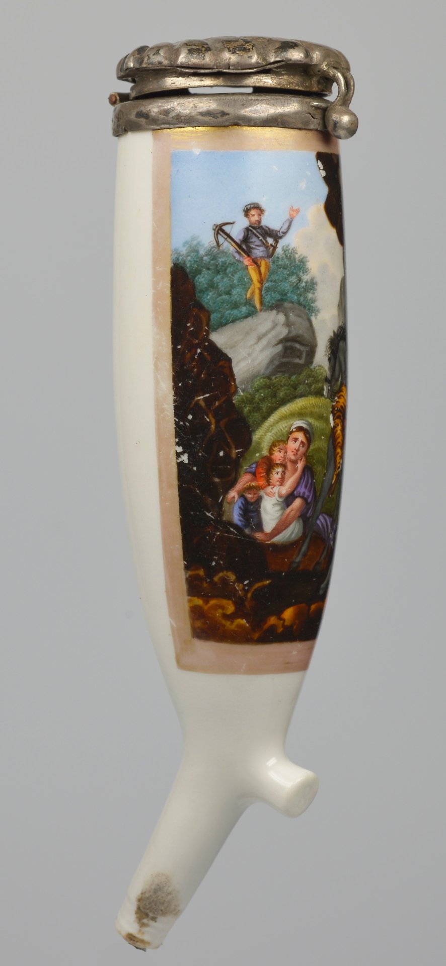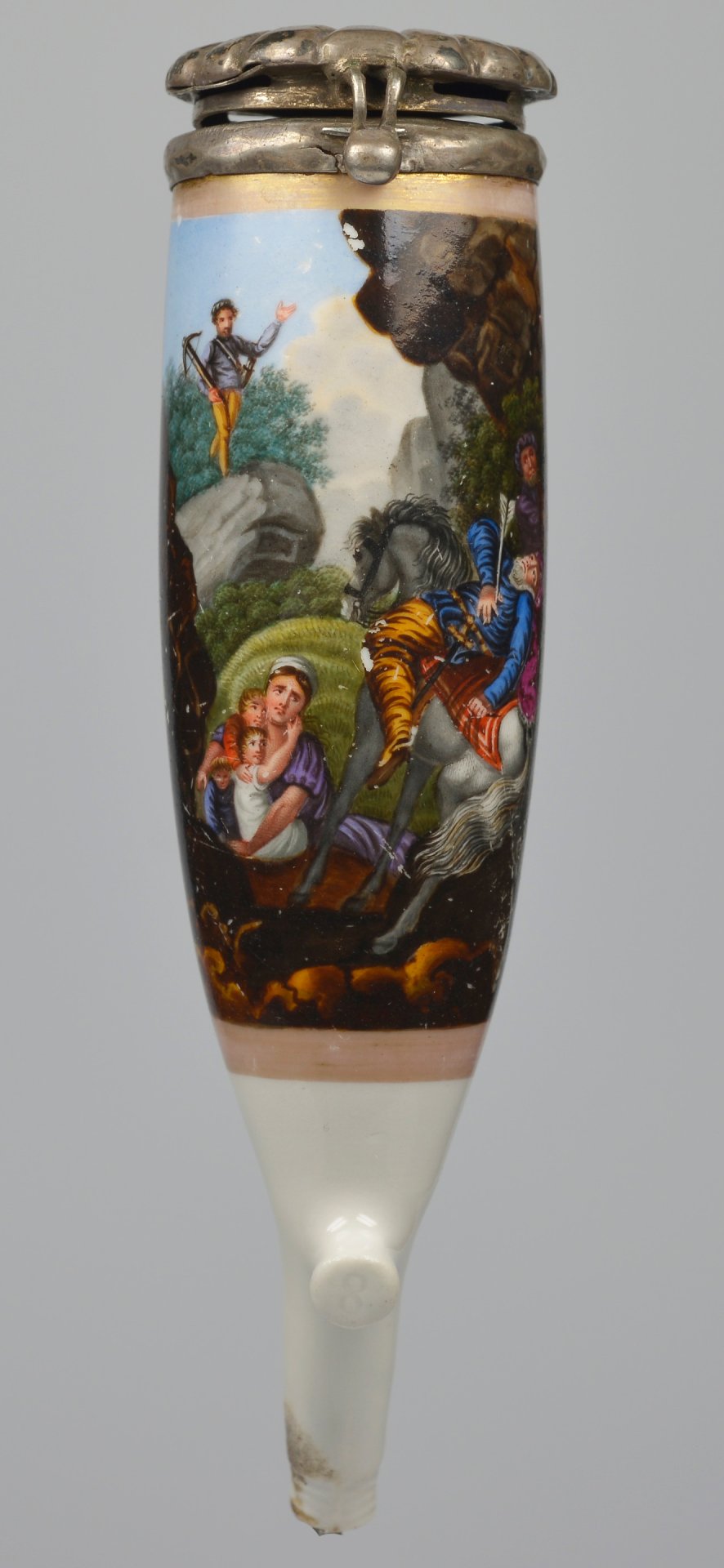 Porzellanpfeifenkopf, Berliner Form, zur Hälfte den Korpus umfassendes rechteckiges Bildfeld in stärker beriebener Goldleiste, darin mit bunten Muffelfarben Darstellung von Tell, der grade auf einer Anhöhe mit Bogen stehende Tell der zuvor Gessner auf seinem Pferd mit dem Pfeil Getroffen hat, eine Szene aus Friedrich Schillers Drama »Wilhelm Tell« erschien 1804 und wurde am Weimarer Hoftheater uraufgeführt. Stummelferse Presszahl 8, Montur: Silber Muschelform, H=14,3cm (a=136; b=110,4; c=37mm)