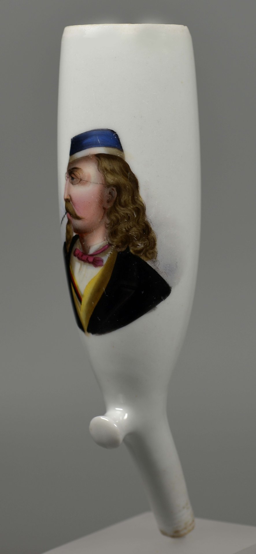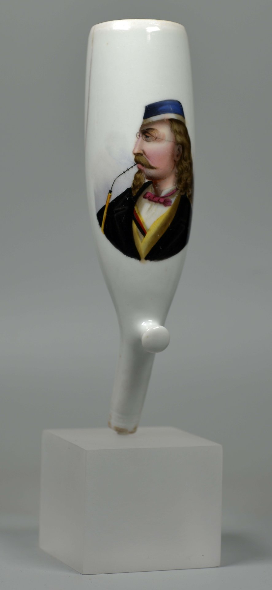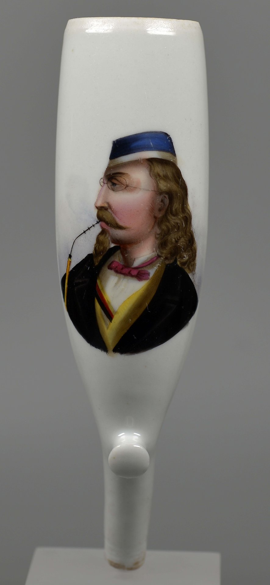 Pfeifenkopf, Berliner Form, auf der Schauseite mit bunten Muffelfarben die Seitenansicht im Brustportrait eines Studenten mit Spitzbart und langen Locken; auf dem Kopf ein Tönnchen in den Farben blau-weiß, im Mund das Mundstück einer Langpfeife und auf der Nase eine feingliedrige Metallbrille; er trägt eine Schärpe in den Farben schwarz-rot-gold und auf dem weißen Hemd am Kragen eine rote Fliege. Das Porzellan ist ohne Marke und ohne Presszahl auf der Ferse. H=16,8cm (b=132mm; c=46,1mm)