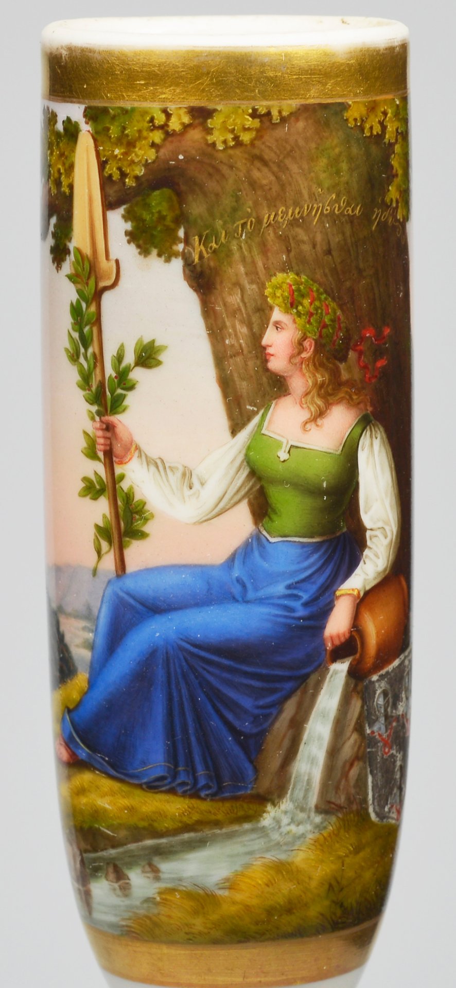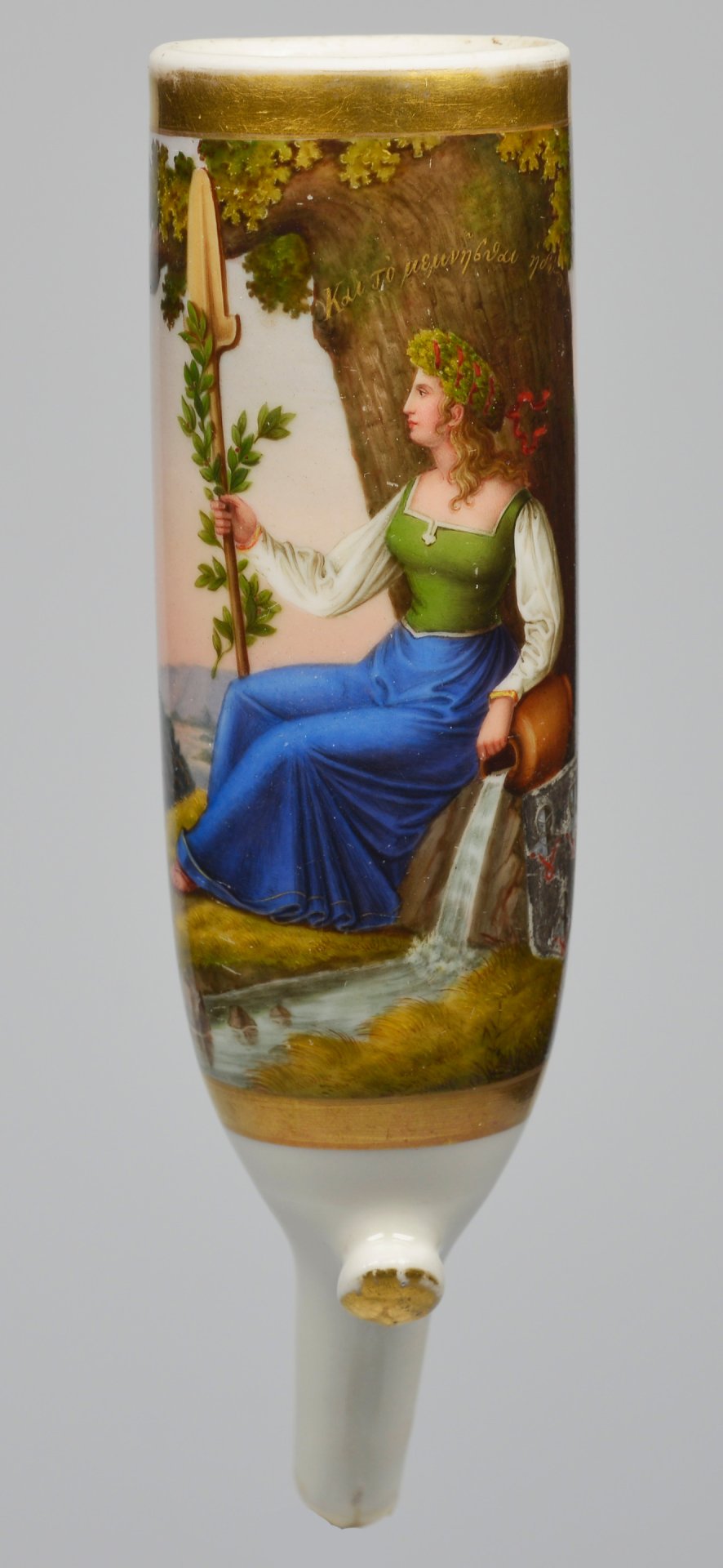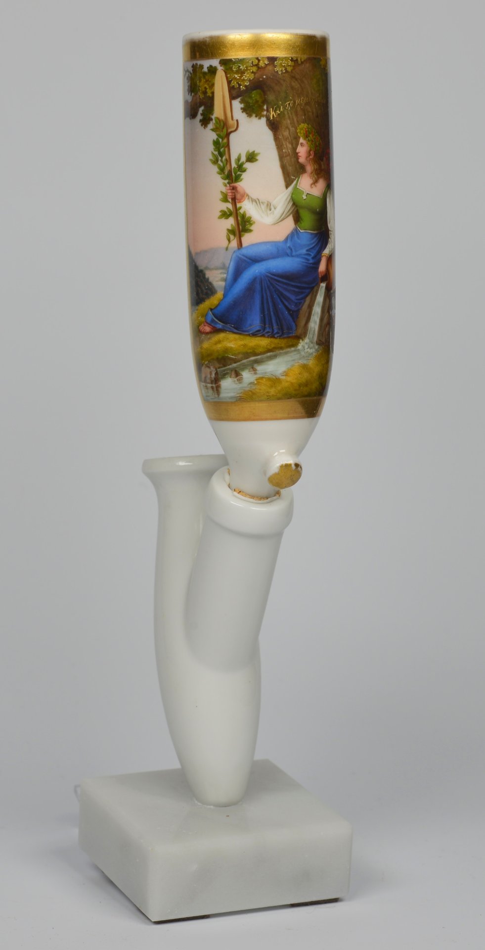 Pfeifenstummel aus Porzellan, zylindrischer Korpus, auf der Wandung 3/4 den gesamten Korpus umspannendes, golden gerahmtes Bildfeld; in bunten Muffelfarben