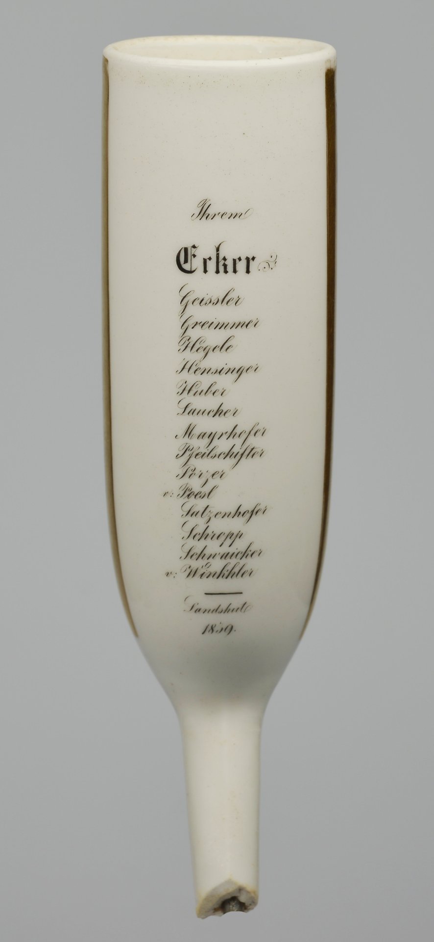 In der Zwischenzeit (1832/34 – 1844) gab es wohl mehrfach Bestrebungen, die Isaria zu rekonstituieren, was wohl immer wieder an den Universitätsbehörden scheiterte. In diesem Kontext muss auch die vorliegende Pfeife gesehen werden. Alle Namen waren Schüler am humanistischen Gymnasium in Landshut (heute Hans-Carossa-Gymnasium Landshut), die Mehrheit findet sich dann im Wintersemester 1839/40 an der Universität München immatrikuliert (siehe Matrikel der Universität München 1839/40). Zwei bzw. drei der Namen tauchen sogar beim Corps Bavaria München (KSCV) wieder auf. Aus Bavaria gründete sich die alte Isaria und auch die neue Isaria wurde 1844 von ehemaligen Bavaren wiedergegründet.