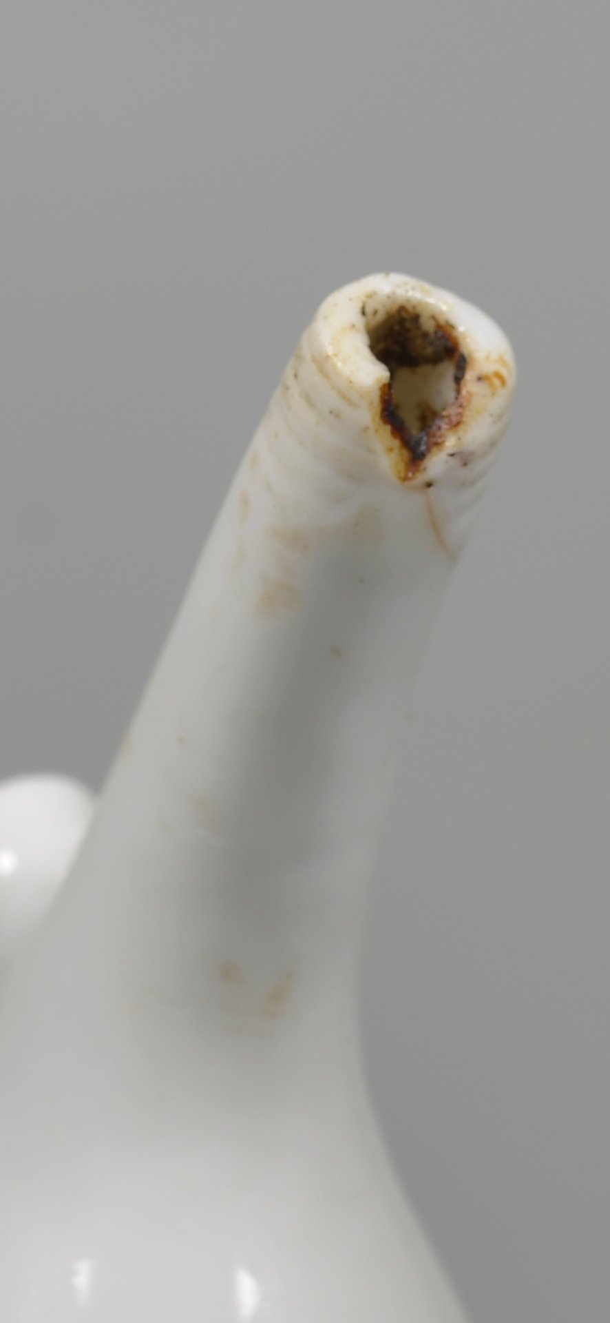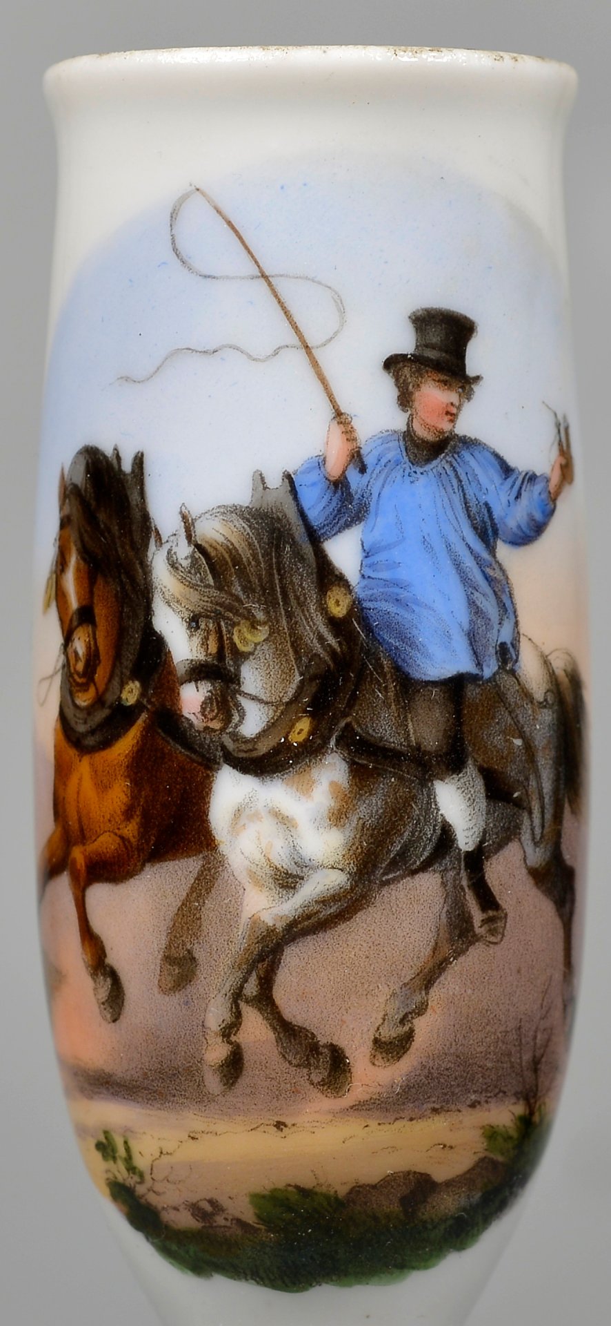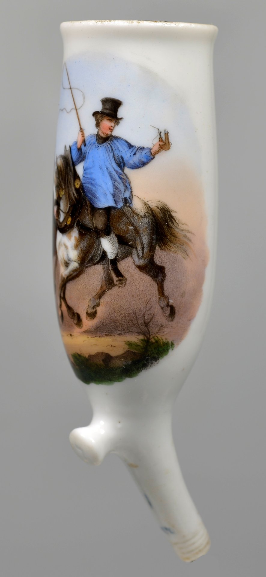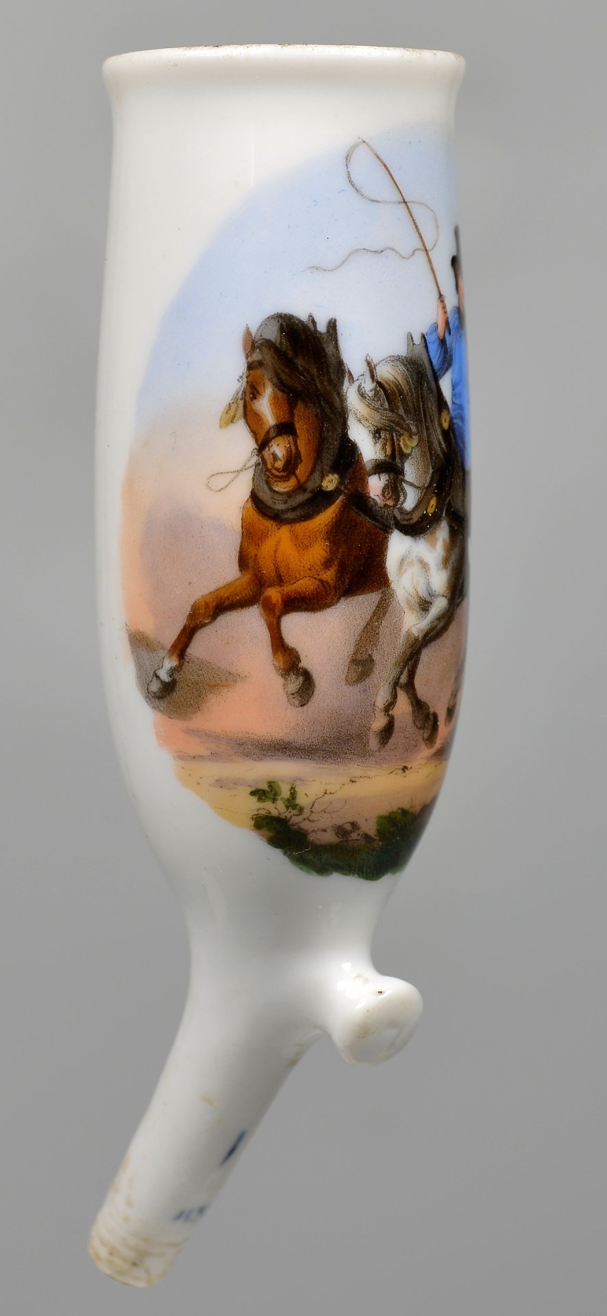 Pfeifenstummel, ovaler Korpus, sich oben erweiternd (Morgenroth Nr. 45); mit bunten Muffelfarben auf Glasur Darstellung eines Herren mit Zylinder, Peitsche und Ulmer Pfeife auf einem Schimmel reitend, neben sich ein weiteres Pferd; Auf dem Stiel unterglasurblau PFS unter Strich; Ferse mit Presszahl 7; H = 11,4cm (b=88,5; c=34,12mm)