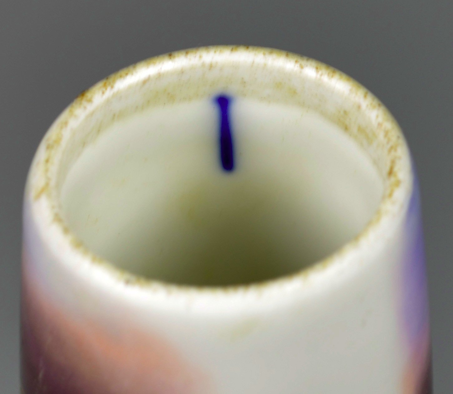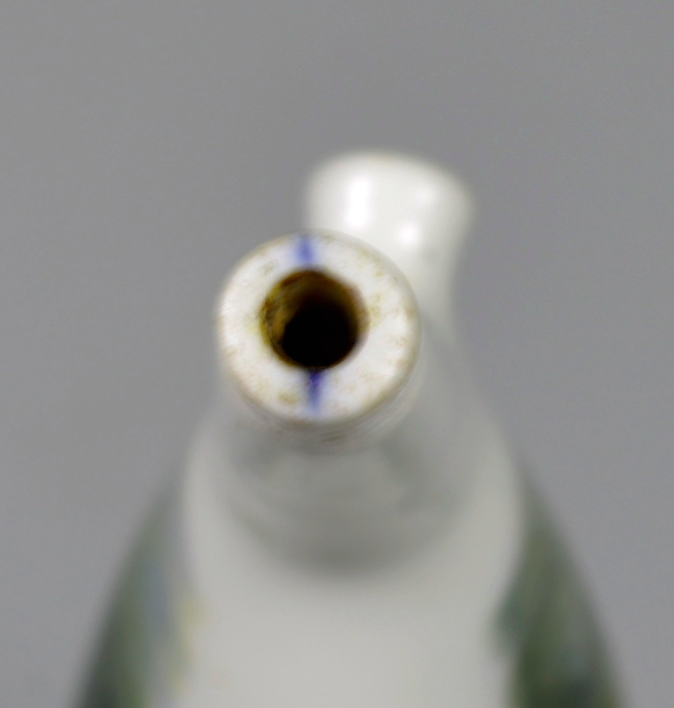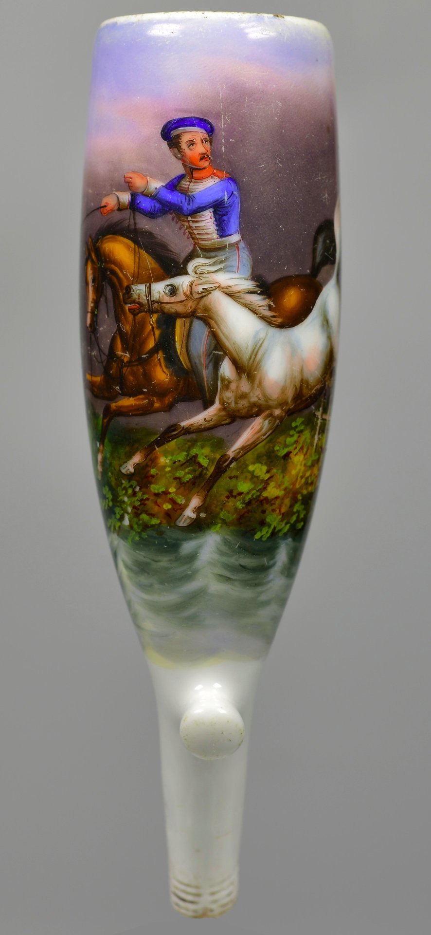 Pfeifenstummel aus Porzellan, Berliner Form, auf der Schauseite mit bunten Muffelfarben  Darstellung eines Soldaten zu Pferd im Galopp mit einem Schimmel; im Kessel unterglasurblauer Strich, am Stielboden unterglasurblauer Querstrich, seitlich am Stiel Presszahl 8; H = 12,7 cm (b=99; c=36,5 mm)