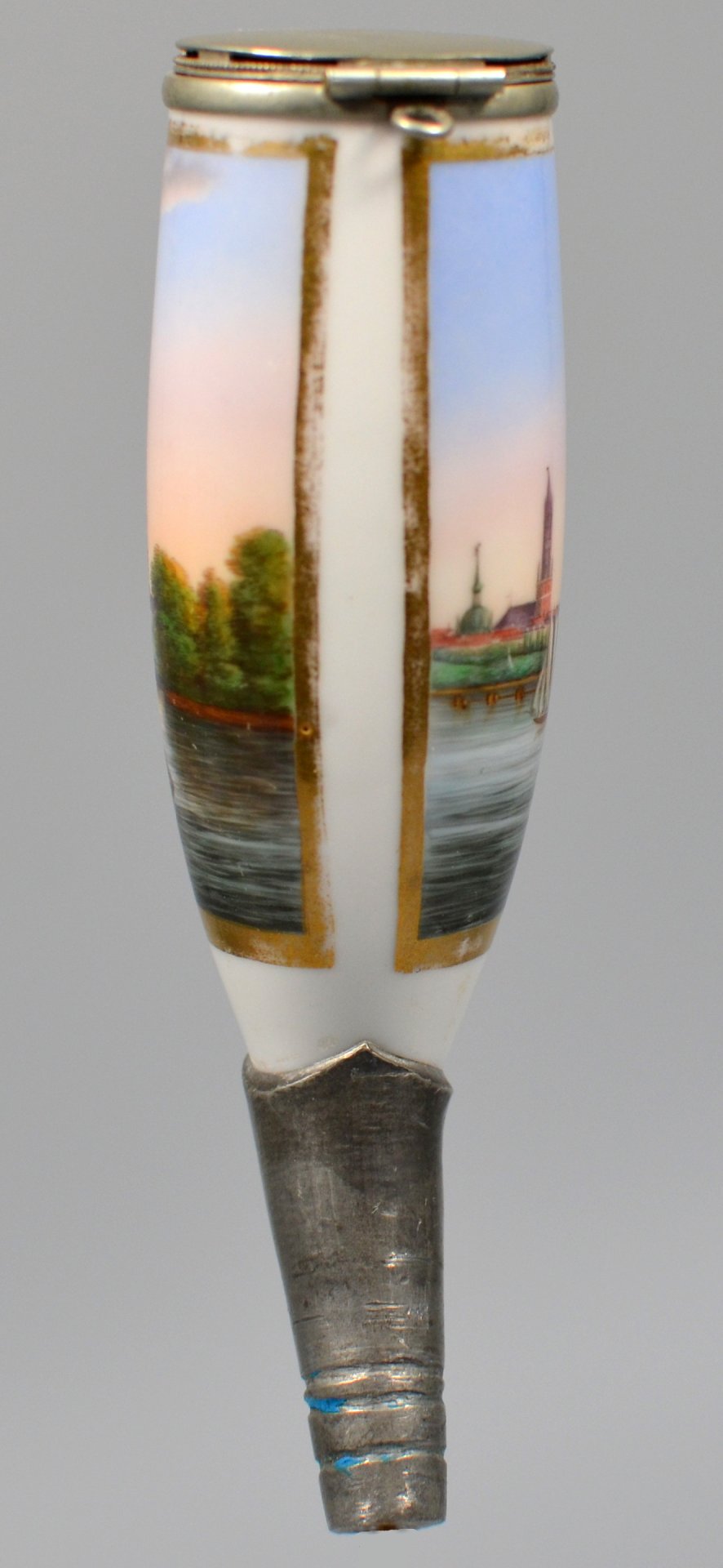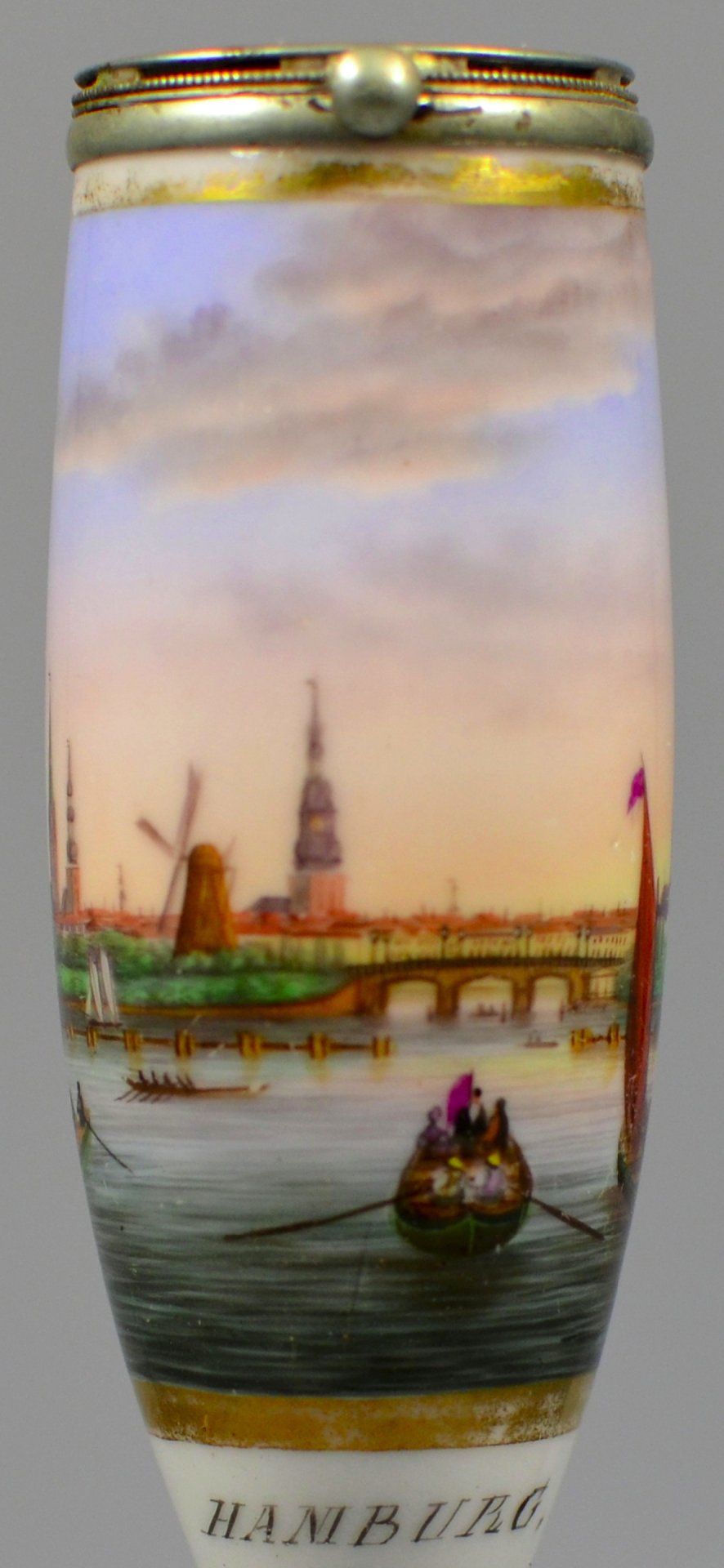 Nathusius, Althaldensleben, 1830 - 1840, Pfeifenstummel aus Porzellan, Berliner Form; auf der Wandung ein beinahe den gesamten Korpus umspannendes, golden gerahmtes Bildfeld; in bunten Muffelfarben die Darstellung der Stadtansicht von Hamburg; darunter in Großbuchstaben: HAMBURG; Blaue Strichmarke im Kessel; Reparatur mit einem bis zur Stummelferse reichenden Zinnschaft; Montierung: Neusilber. H.: 12,9 cm (b=99; c=36 mm)
