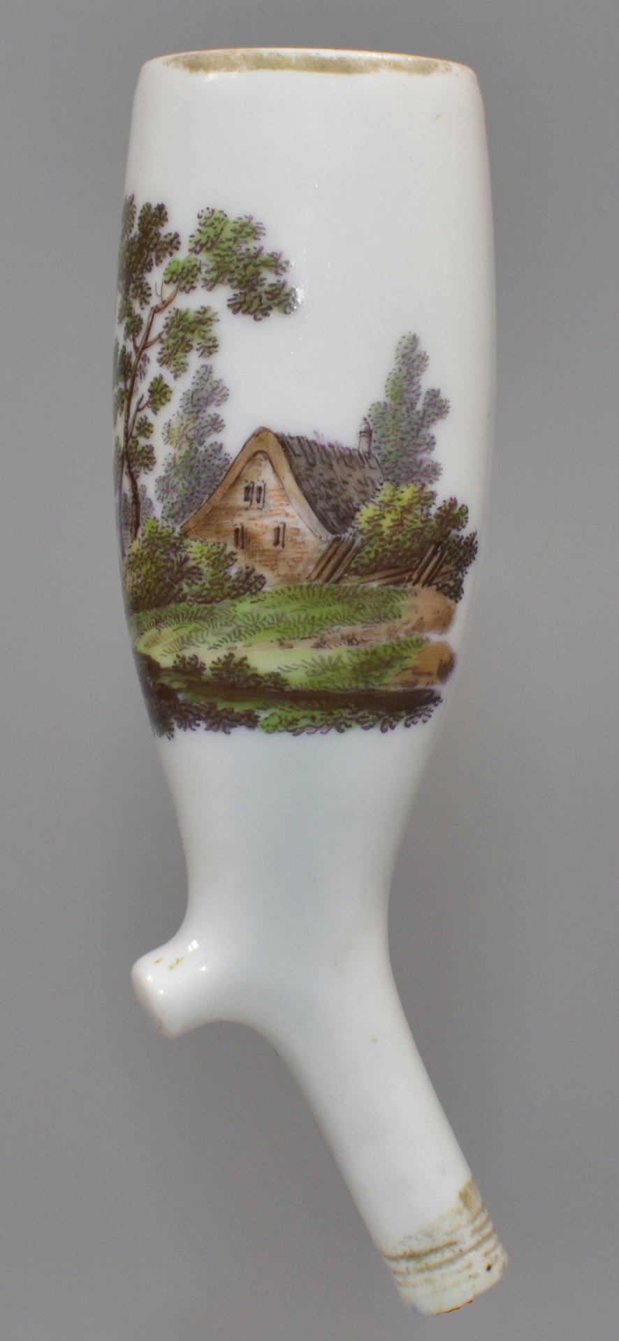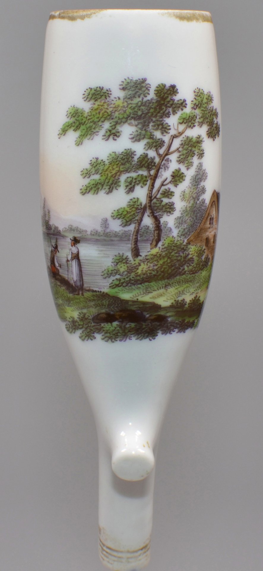 Pfeifenstummel aus Porzellan, Berliner Form, in bunten Muffelfarben die Darstellung zweier Personen neben einem kleinen Haus am Fluss mit Sicht auf ein Dorf gegenüber am anderen Ufer; Ferse mit Presszahl 6; unterglasurblauer Querstrich am Stielboden. H.: 10,3 cm (b=78; c=31,3 mm)