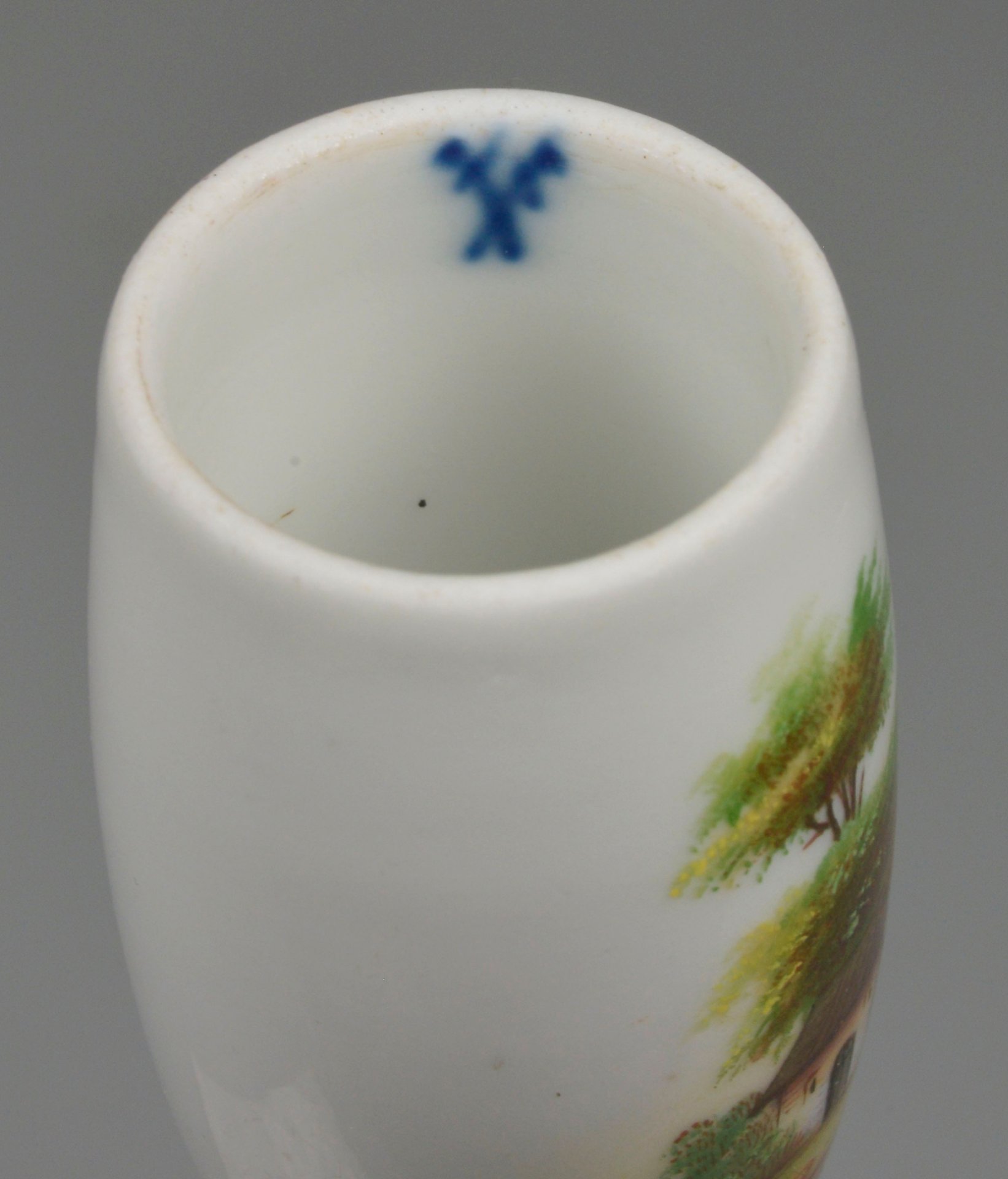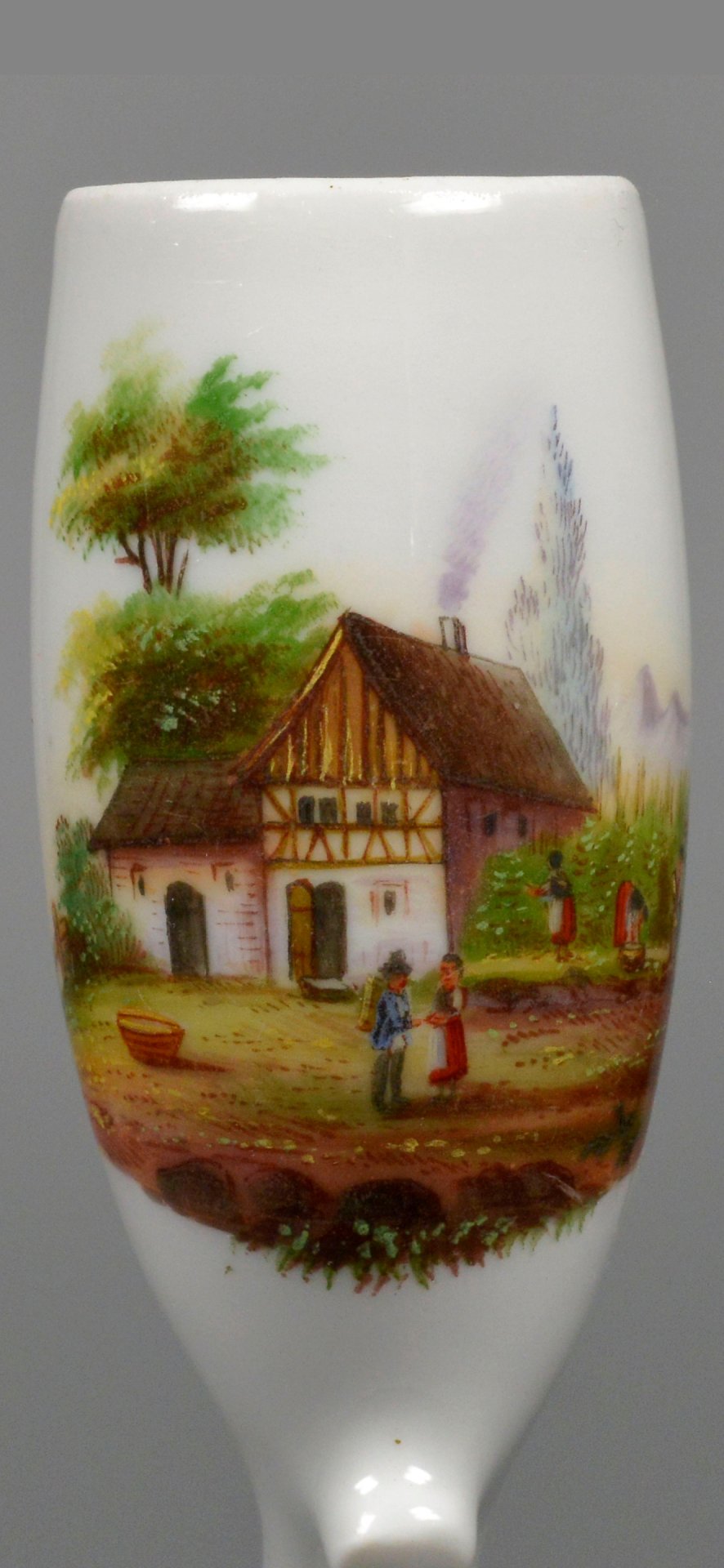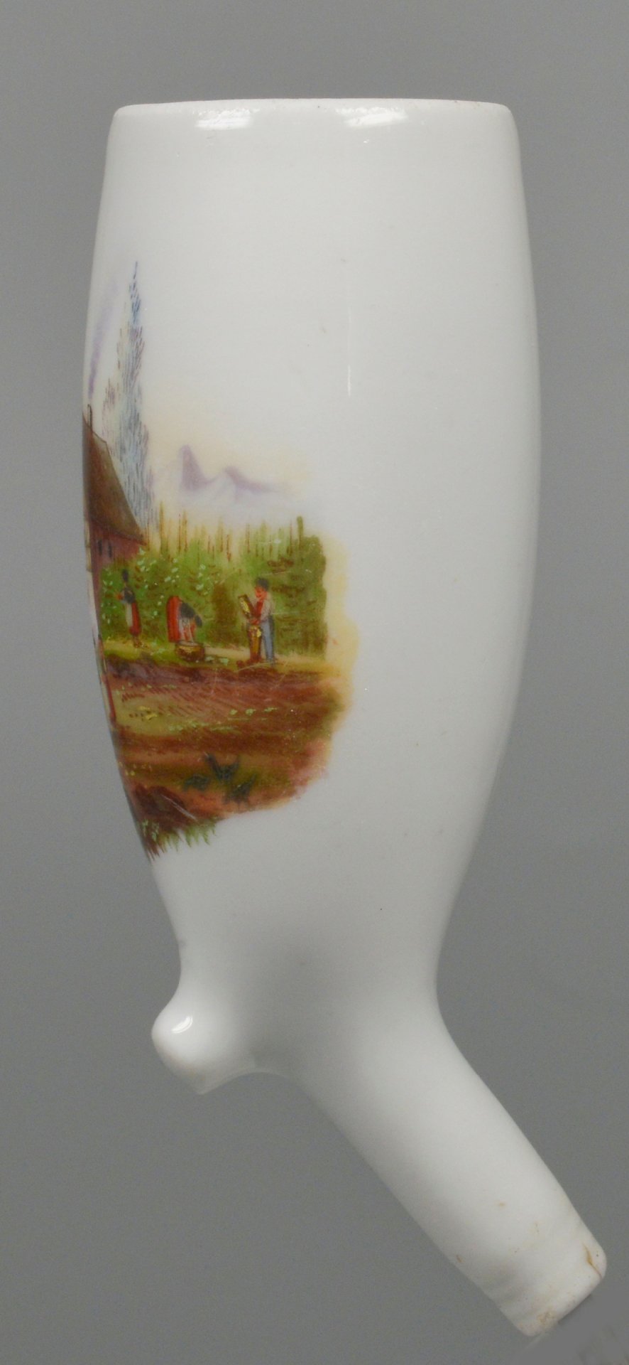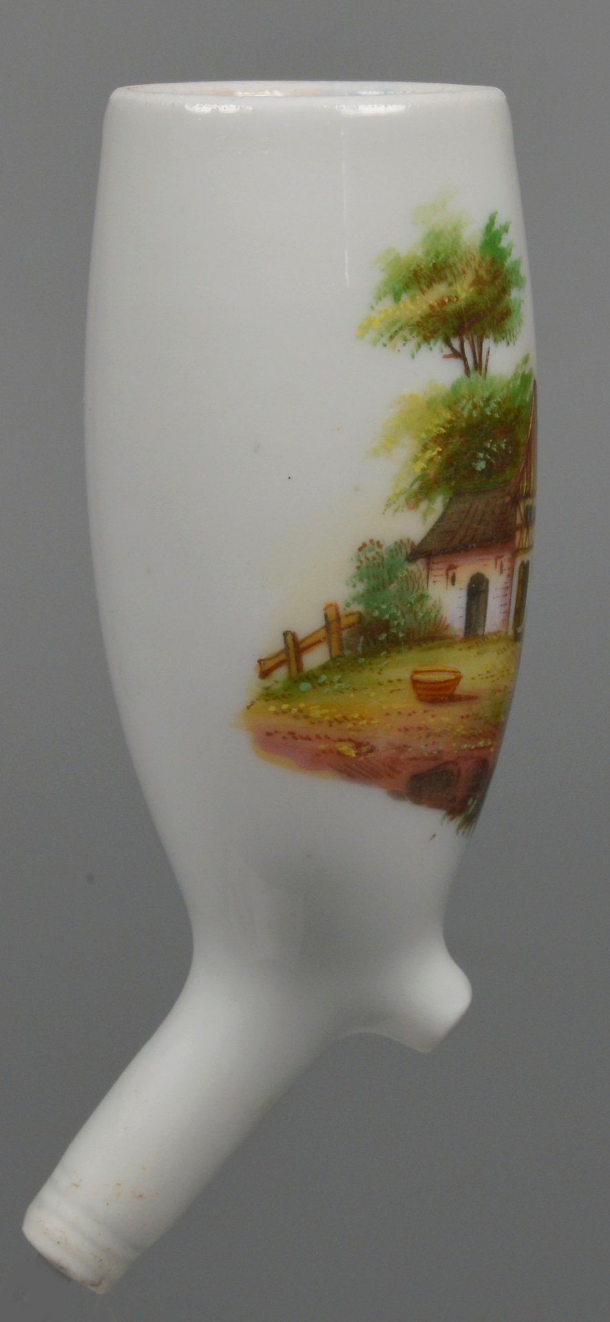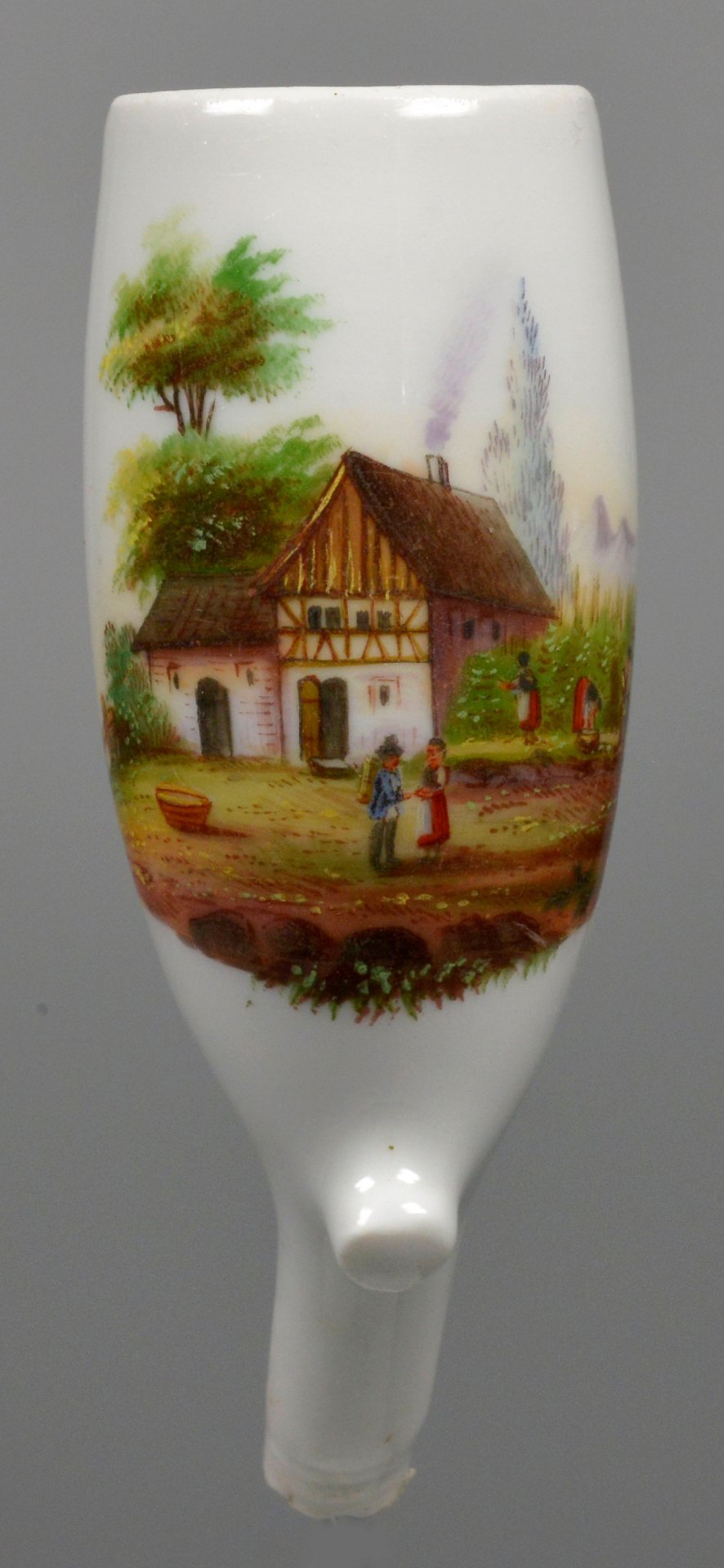 Pfeifenstummel aus Porzellan, auf der Schauseite mit bunten Muffelfarben in Lupenmalerei Darstellung einer Dorfidylle mit Personenstaffage, H=8,7cm