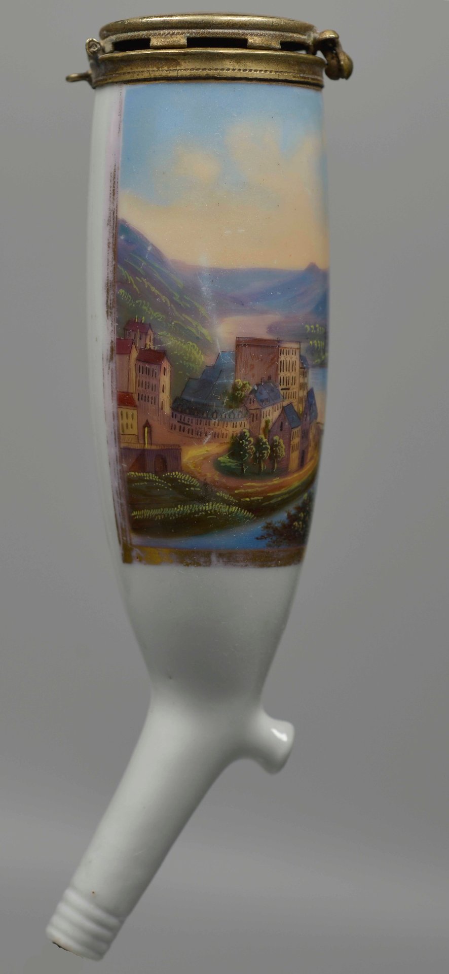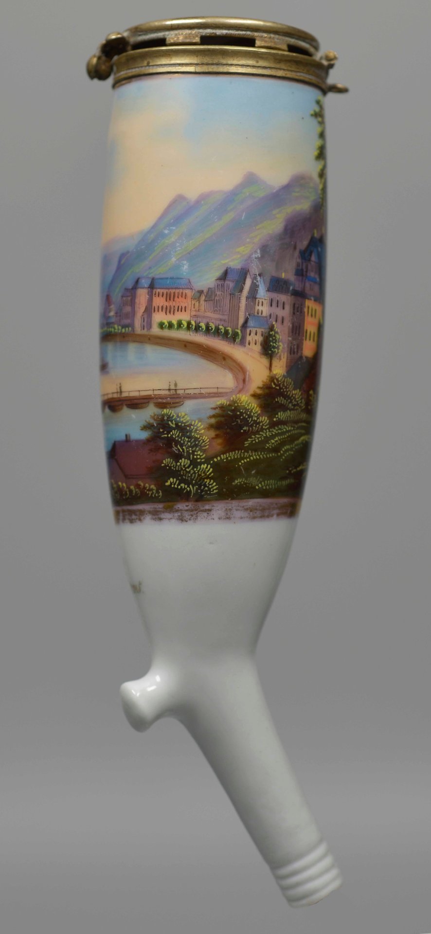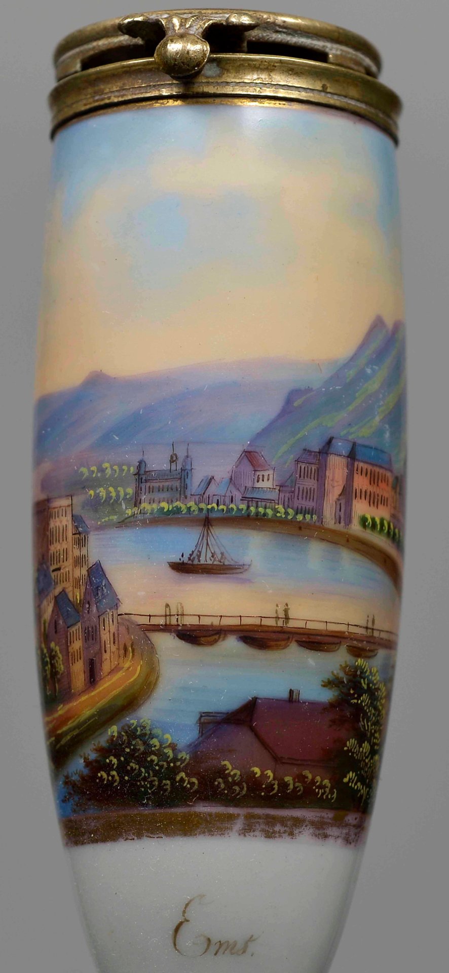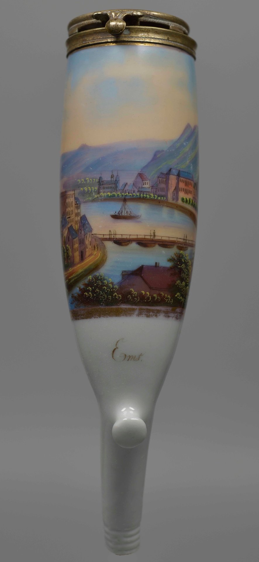 Pfeifenstummel aus Porzellan, Berliner Form, auf der Wandung mit bunten Muffelfarben beinahe vollständig den gesamten Korpus umspannende mit Gold gerahmte Kartusche, darin die Darstellung der Silhouette von Ems mit beidseitig der Lahn befindlichen Gebäuden und einem Brückenzug; unterhalb der Abbildung in schwarzer Schreibschrift „Ems“; Montierung: Neusilber; H.: 13,6cm (a=130; b=101; c=35,2mm)