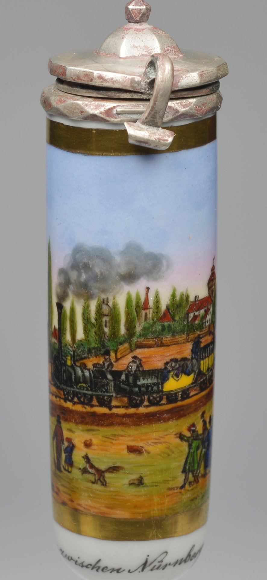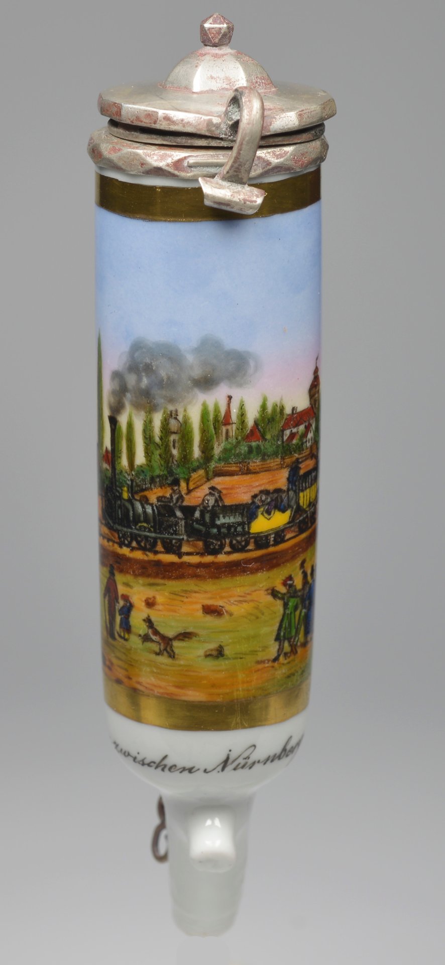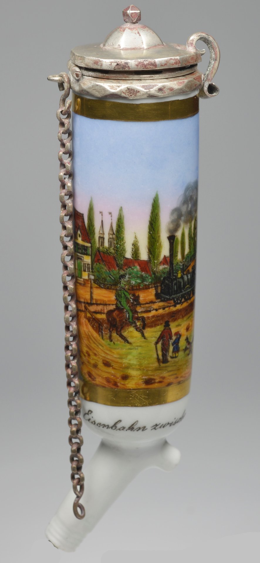 Pfeifenstummel aus Porzellan, zylindrische Grundform; vollständig den Korpus umspannendes, goldgerahmtes Bildfeld; darin in bunten Muffelfarben die Darstellung der ersten Eisenbahnfaht von Nürnberg nach Fürth am 07.12.1835 mit Personen und Umgebung von Nürnberg; Stummelferse Preßzahl unleserlich 2, Montierung: Silber; Perlkette; H.: 12,9 cm (a=113; b=92,7; c=28,1 mm).