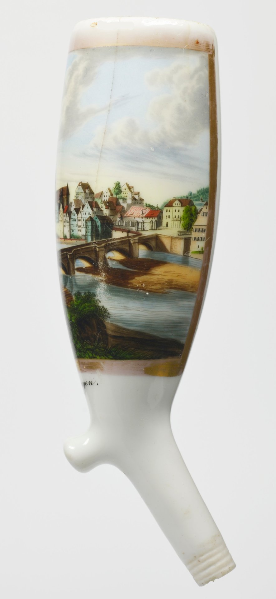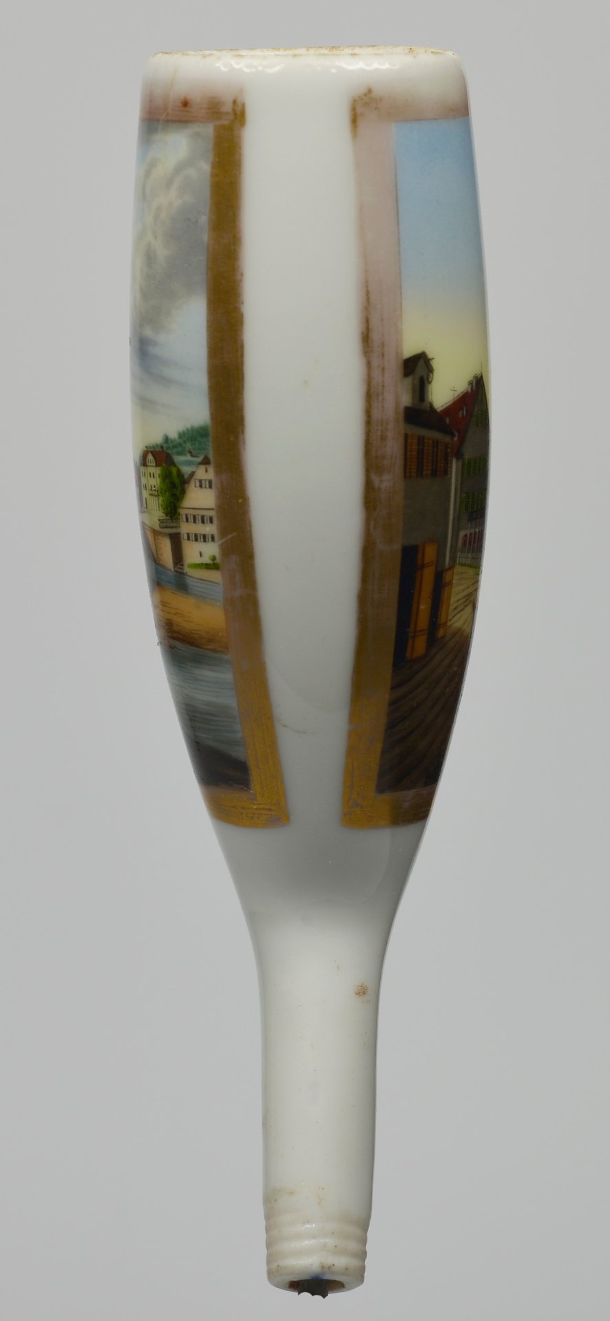 Pfeifenstummel aus Porzellan, Berliner Form, auf der Wandung 4/5 den gesamten Korpus umspannendes, golden gerahmtes Bildfeld; darin in bunten Muffelfarben das Panorama von Tübingen; unterhalb der Malerei in schwarzer Handschrift „Tübingen“: im Kessel unter Glasur senkrechter blauer Strich; blauer Querstrich am Stielende; Stummelferse Presszahl 8, H.: 12,4cm. (b=96,8; c=36,6 mm)