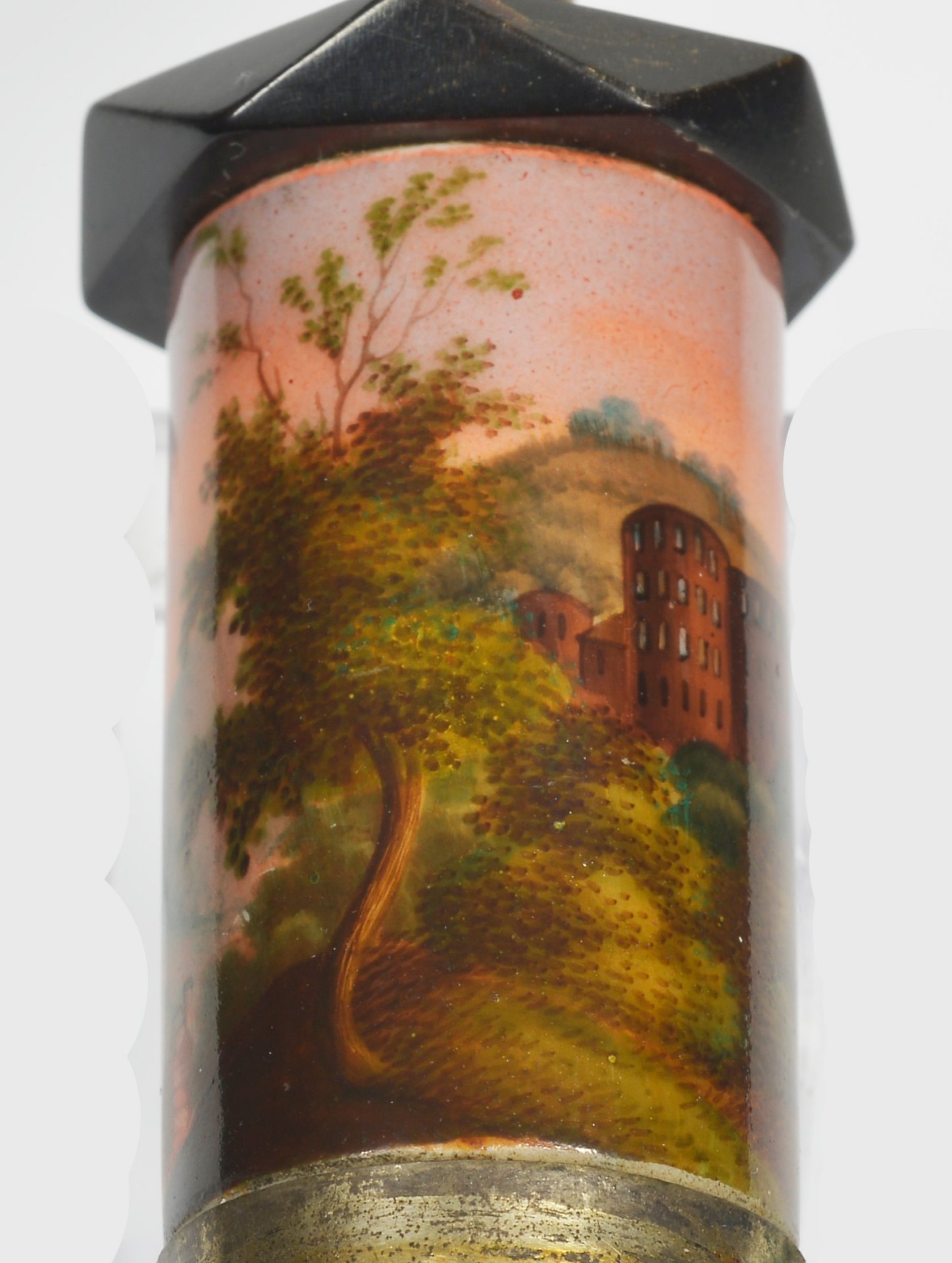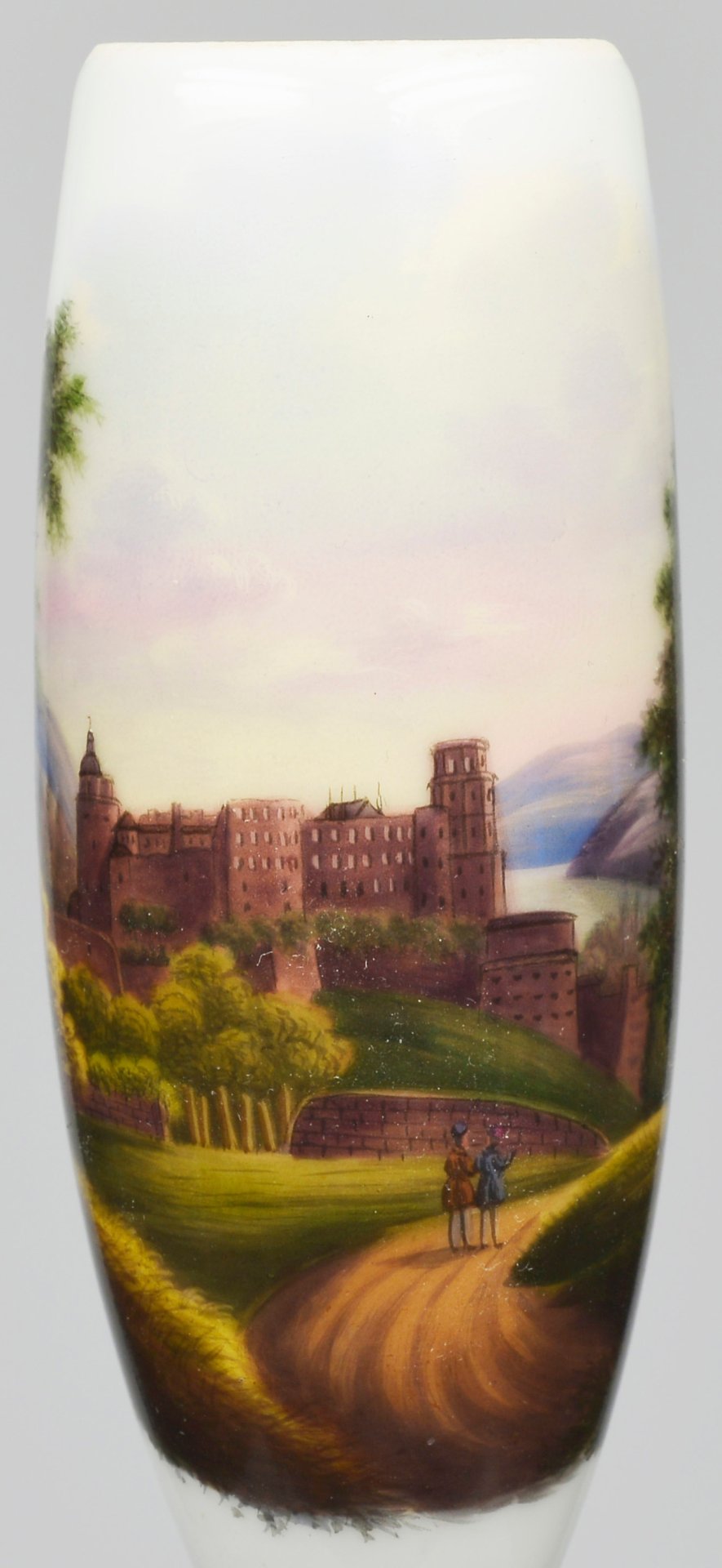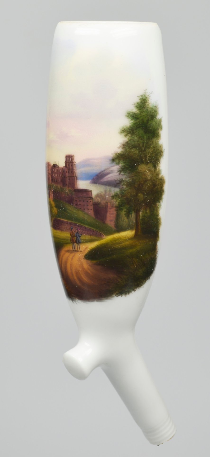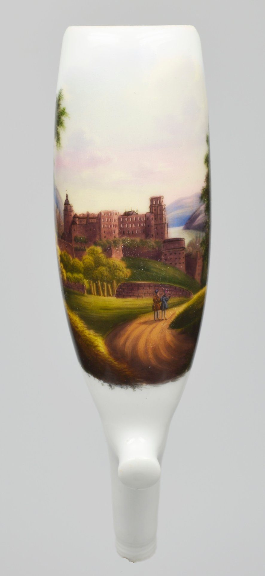Pfeifenstummel aus Porzellan, Holländische Form (vergl. S 12, Morgenroth, Nr. 10, KPM 1822); auf der Wandung zu 2/3 den Korpus umspannendes Bildfeld, darin mit bunten Muffelfarben der Blick auf den Hang des Königstuhls und die Schlossruine aus rotem Sandstein; im Vordergrund zwei Wanderer; im Hintergrund der Fluß Neckar; Stummelferse Pressmarke 9; H.= 13,9 cm (b=109,5; c=38,9mm)