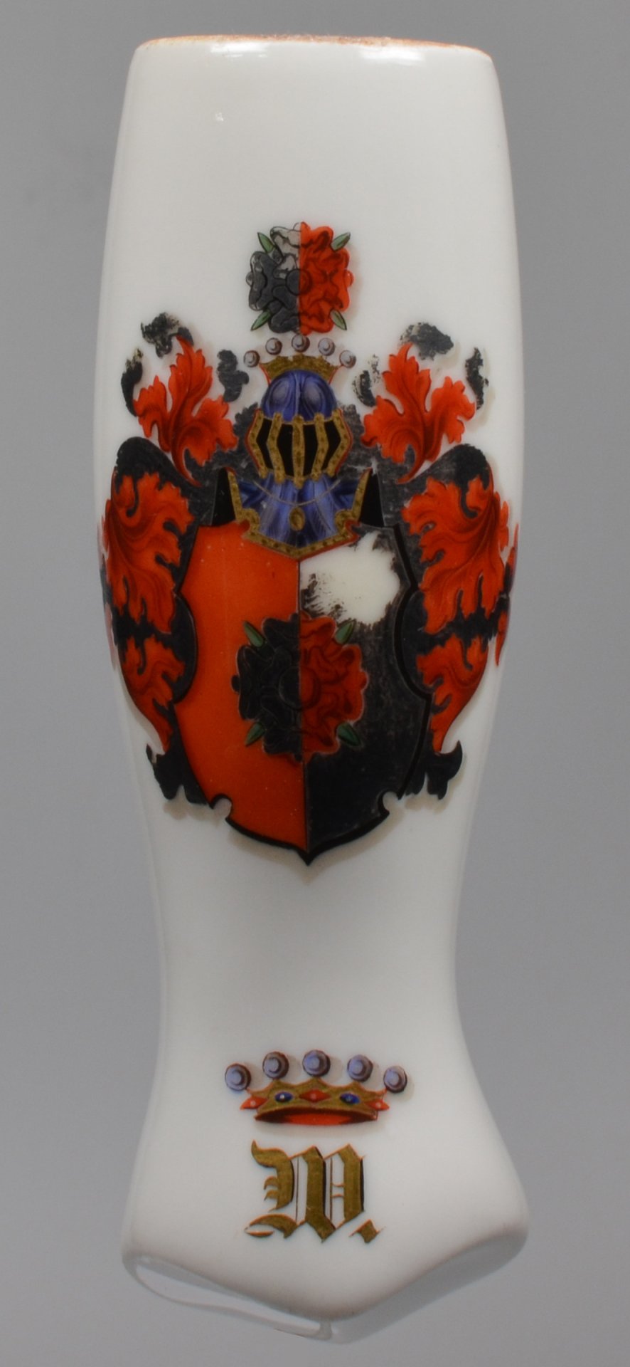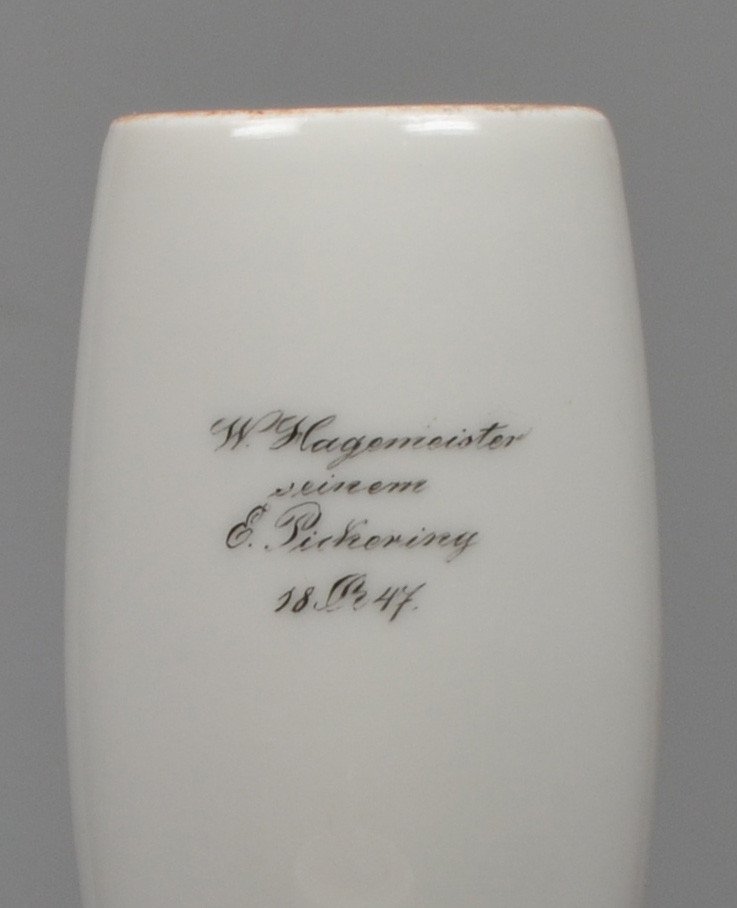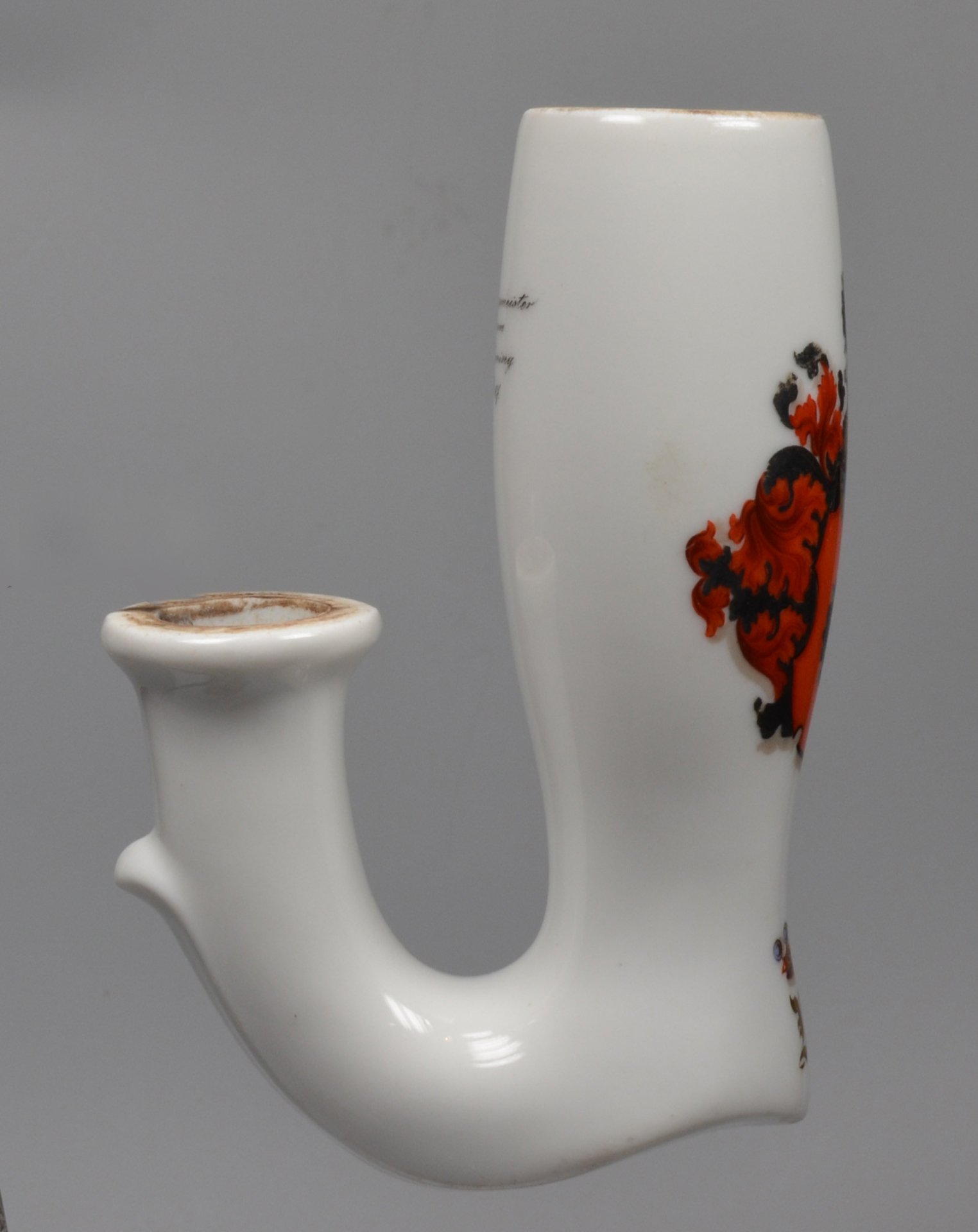 Pfeifenkopf aus Porzellan „mit festem Abzug“ (Preiss-Verzeichniss 1828) in geschwungener Grundform mit kielförmigen Pfeifenhals ; auf der Schauseite mit bunten Muffelfarben die Abbildung des Wappens von W.Hagemeister (wohl Adelsfamilie aus Mechlenburg-Vorpommern, u.a. Stralsund), auf der Rückseite in schwarzer Schreibschrift „W. Hagemeister seinem E. Pickering 18….47“, blauer Strich im Kessel und in der Gestecktülle; H.: 11,5 cm (a=115; b=65; c=37,2 mm) Nachweis: D2029
