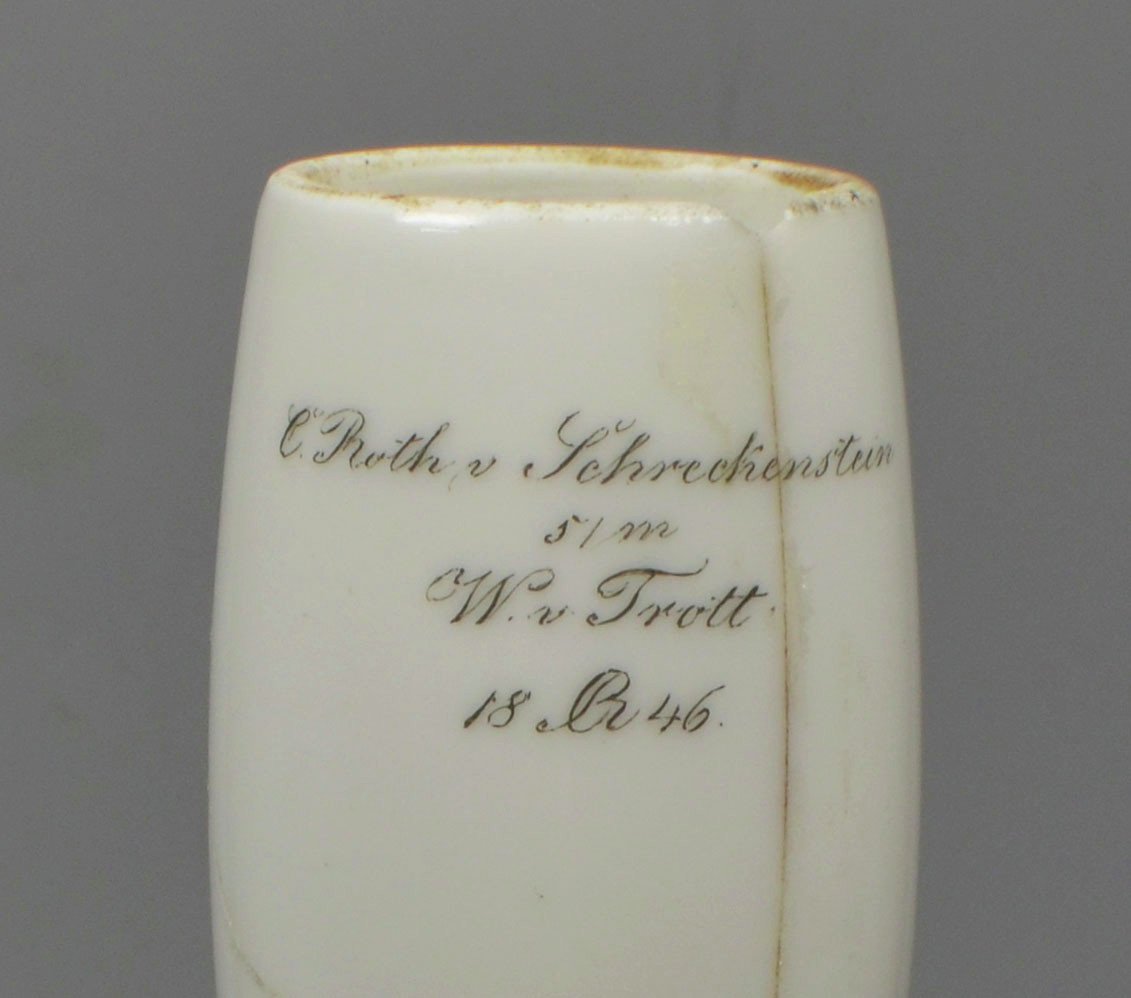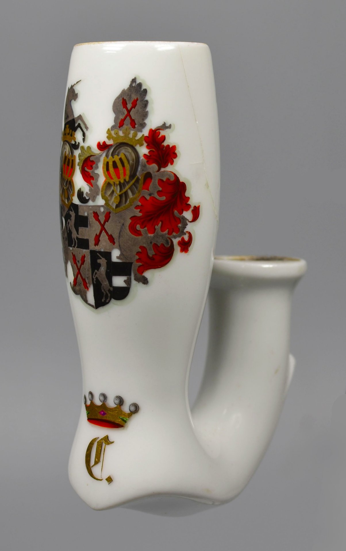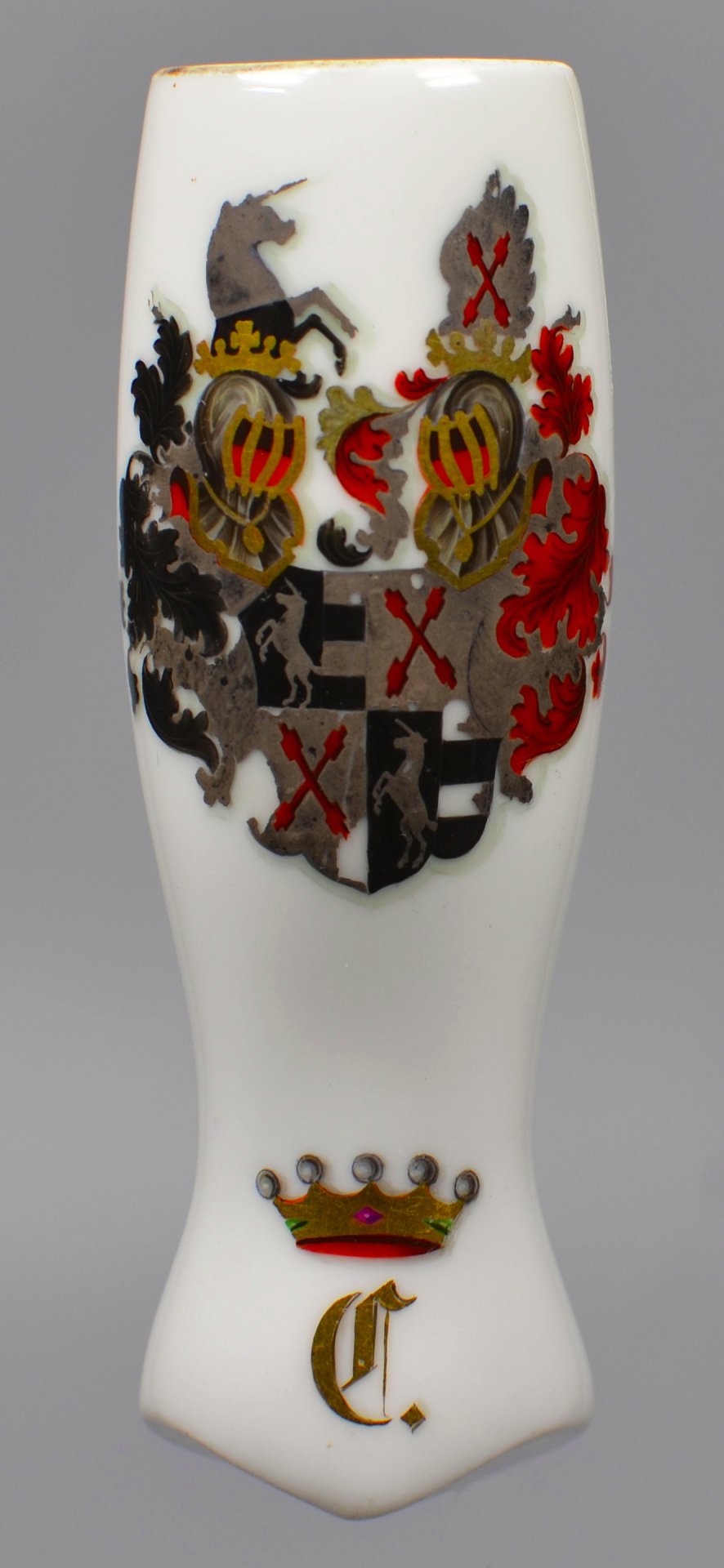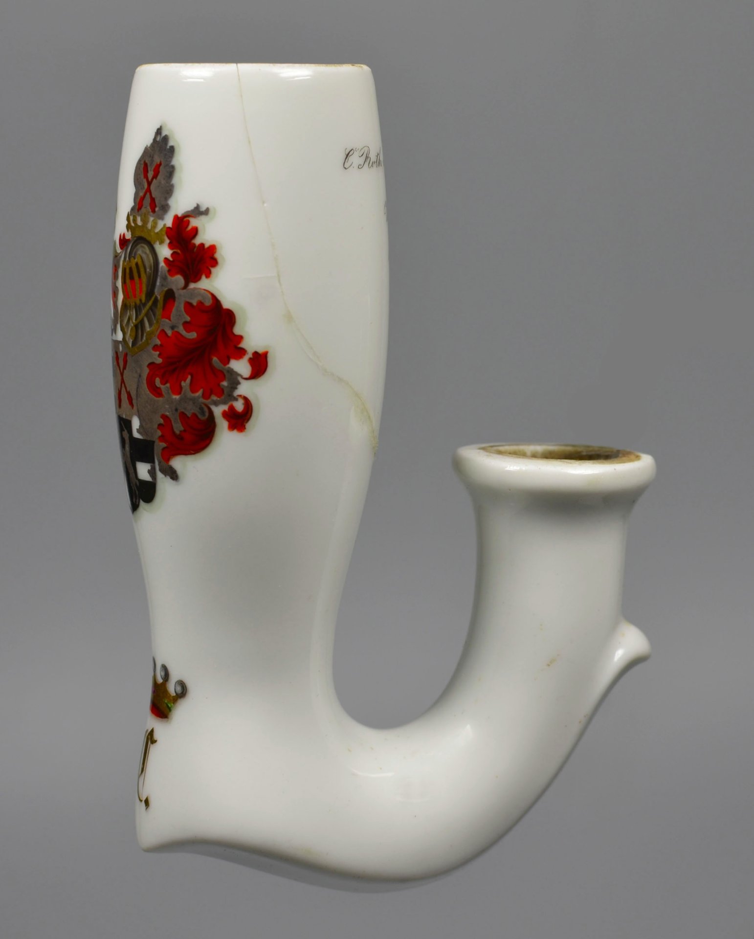 Pfeifenkopf aus Porzellan „mit festem Abzug“ (Preiss-Verzeichniss 1828) in geschwungener Grundform mit kielförmigen Pfeifenhals ; auf der Schauseite mit bunten Muffelfarben die Abbildung des Wappens von Karl Heinrich Leopold Freiherr Roth von Schreckenstein (* 31. Oktober 1823 in Donaueschingen; † 19. Juni 1894 in Karlsruhe), auf der Rückseite in schwarzer Schreibschrift „C. Roth v. Schreckenstein s/m W. v. Trott, 18RC46“, blauer Strich im Kessel und in der Gestecktülle; H.: 11,5 cm (a=115; b=64; c=37,4 mm)