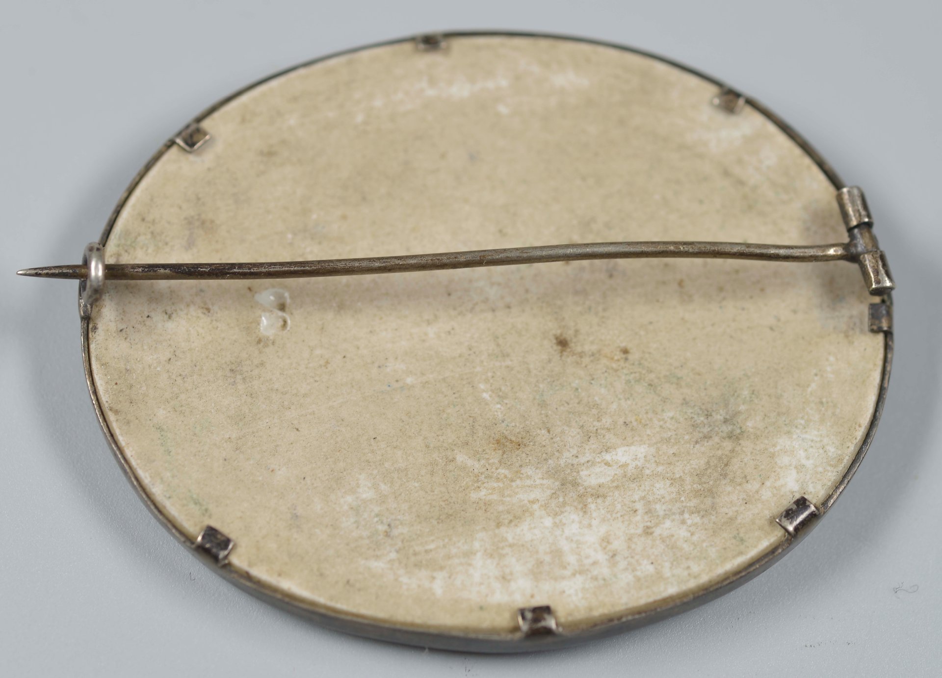 Querovaler Porzellanbrosche um 1850, leicht gewölbt, mit Muffelfarben in feiner Lupenmalerei zwei Freundinnen oder Geschwister, die sich umarmend und anschmiegend im Halbportrait den Betrachter anschauen; im Hintergrund eine Berglandschaft; auf der Rückseite unleserliche Presszahl; eingefasst in einen silbernen glatten Rahmen mit Klammern, an den Rahmen befestigt die Haltenadel. 47,8 x 59,3mm