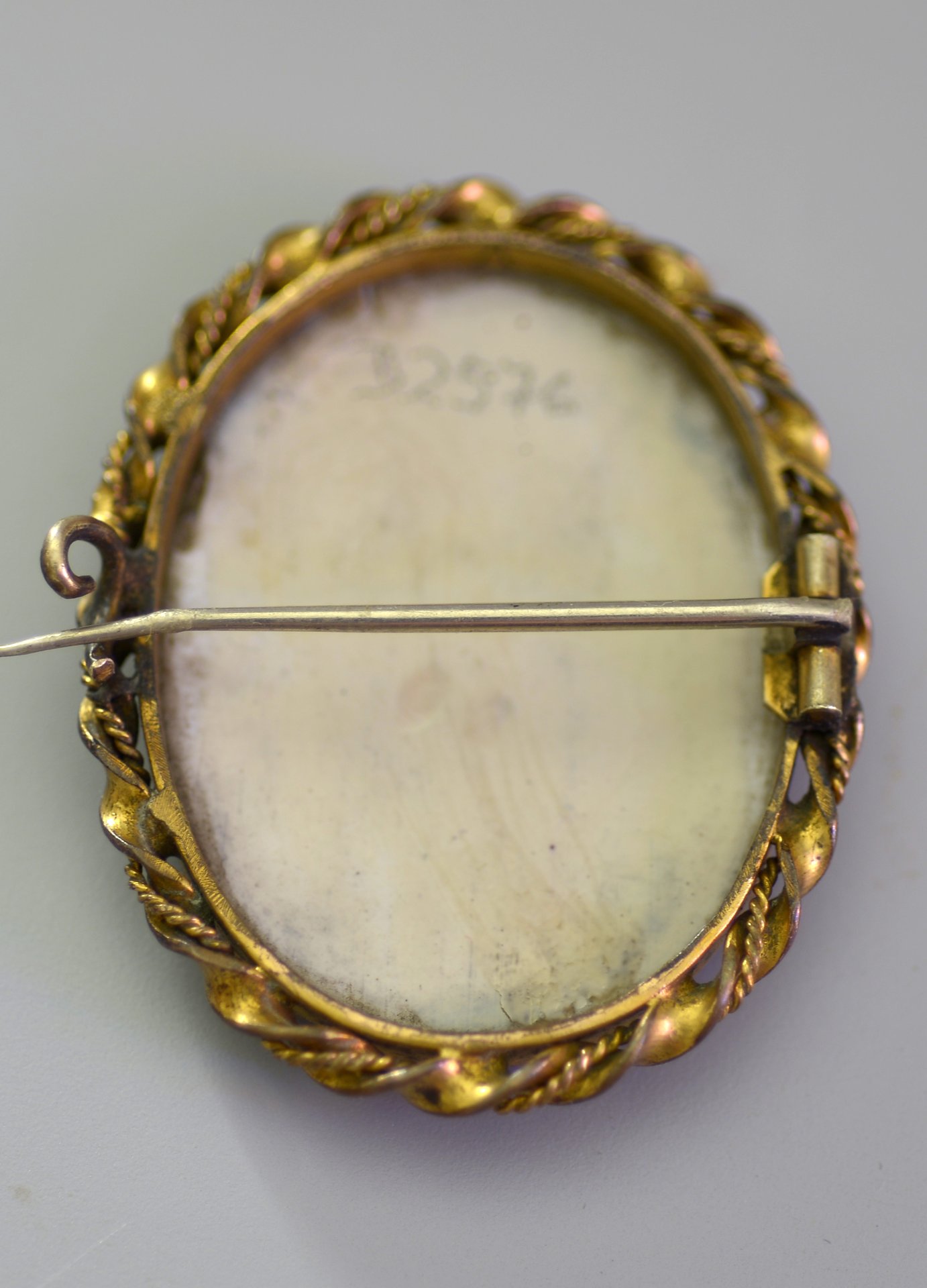 Hochovale Porzellanbrosche, um 1850, gewölbt, auf Glasur mit bunten Muffelfarben in feiner Lupenmalerei die Seitenansicht einer jungen Dame im Halbportrait im Stil des Rokoko mit orangefarbenem Gehrock, einem breitkrempigen Hut mit aufgesetzten Straußenfedern und einer Perücke mit Zopf; im Hintergrund eine bewaldete Landschaft; die Porzellanplatte ist umlaufend eingefasst in eine vergoldete gedrehte Metallleiste und auf der Rückseite mit einer Haltenadel versehen. Mit Fassung: 49,6 x 39,1mm