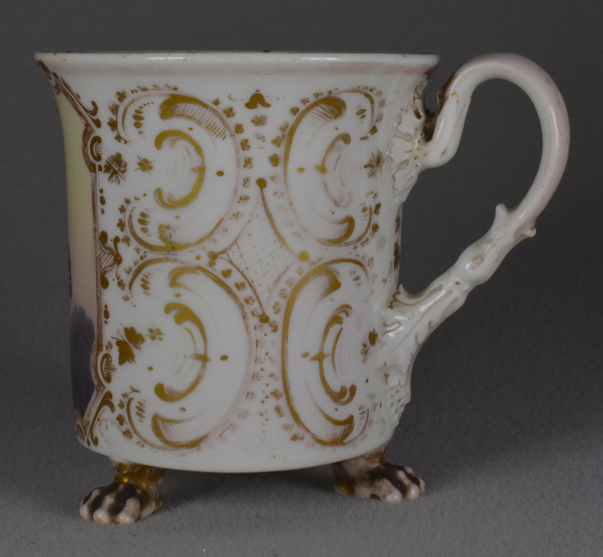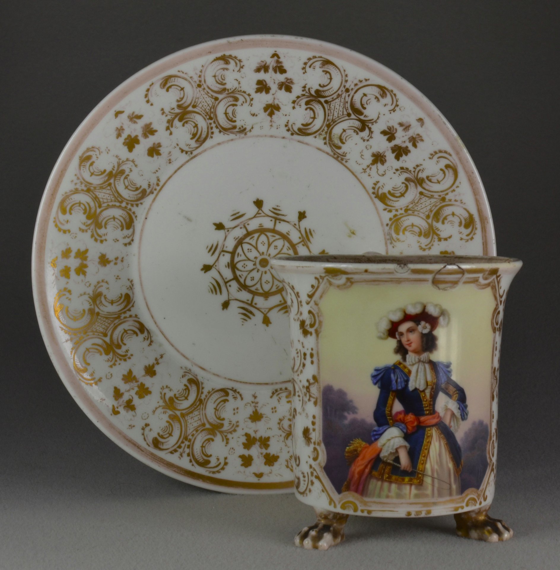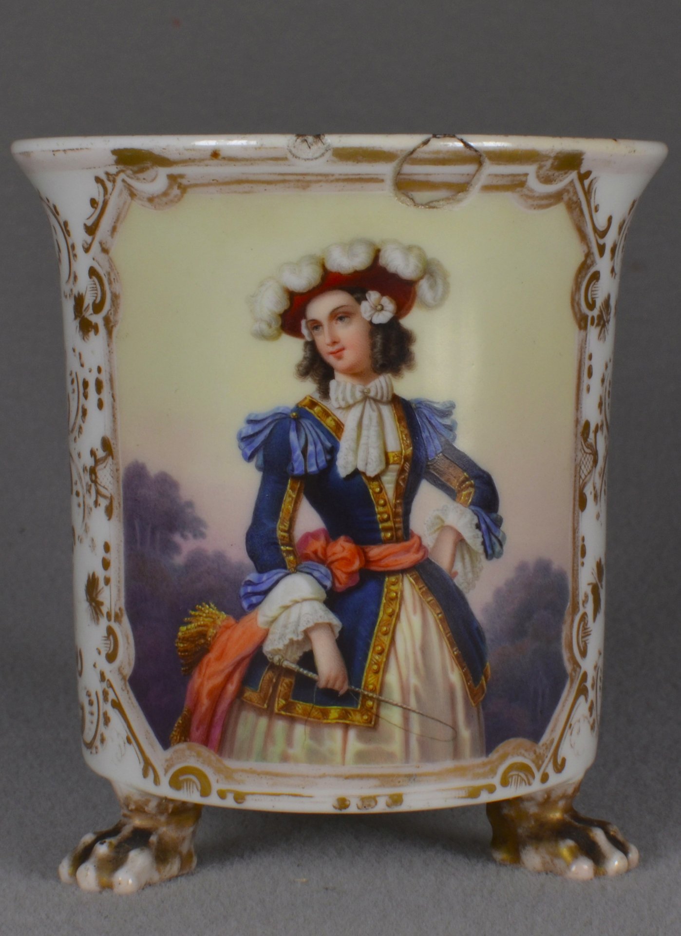 Tatzenfußtasse, Walzenform, zylindrisch, oben leicht ausladende Wandung, Ohrenform-Henkel oben und unten mit Palmettenansatz. Auf der Schauseite in sechskantiger Kartusche  mit bunten Muffelfarben die Abbildung einer jungen Frau in der Bekleidung des 18. Jahrhunderts mit einer Reitpeitsche, wohl fein gemalte Darstellung einer Schauspielerin in einer ihrer Rollen; unterglasurblaue Szeptermarke (bis 1830-1840); H.:9,9 cm