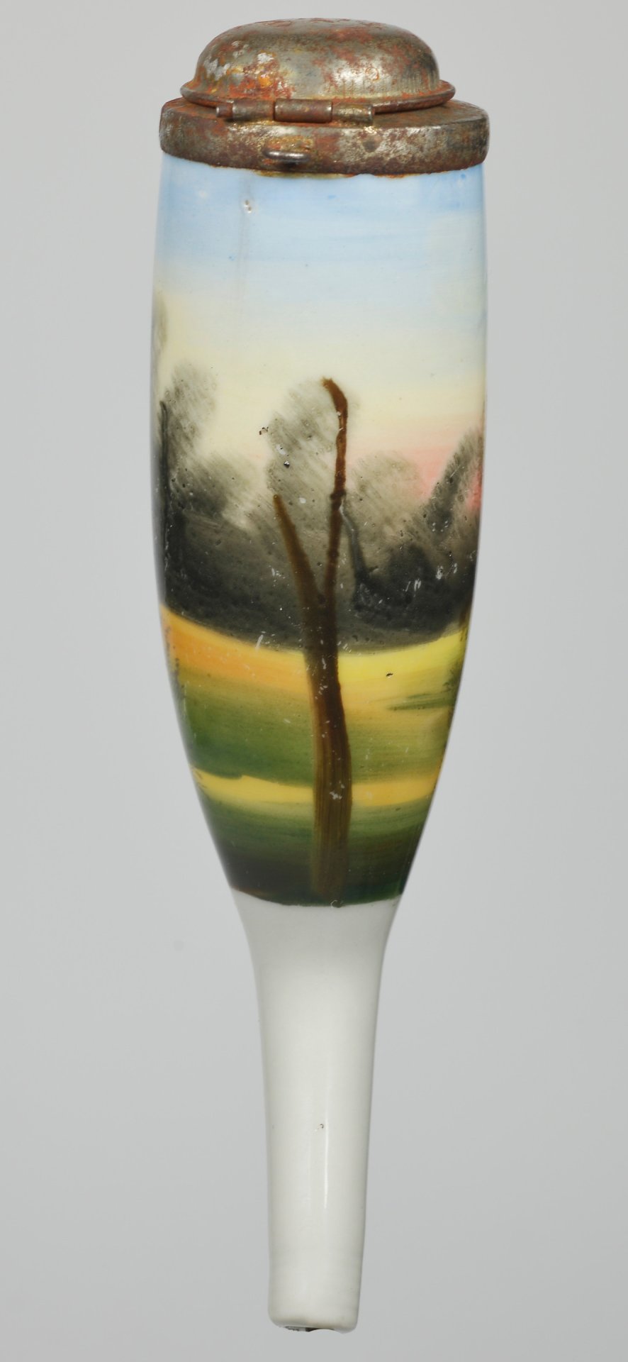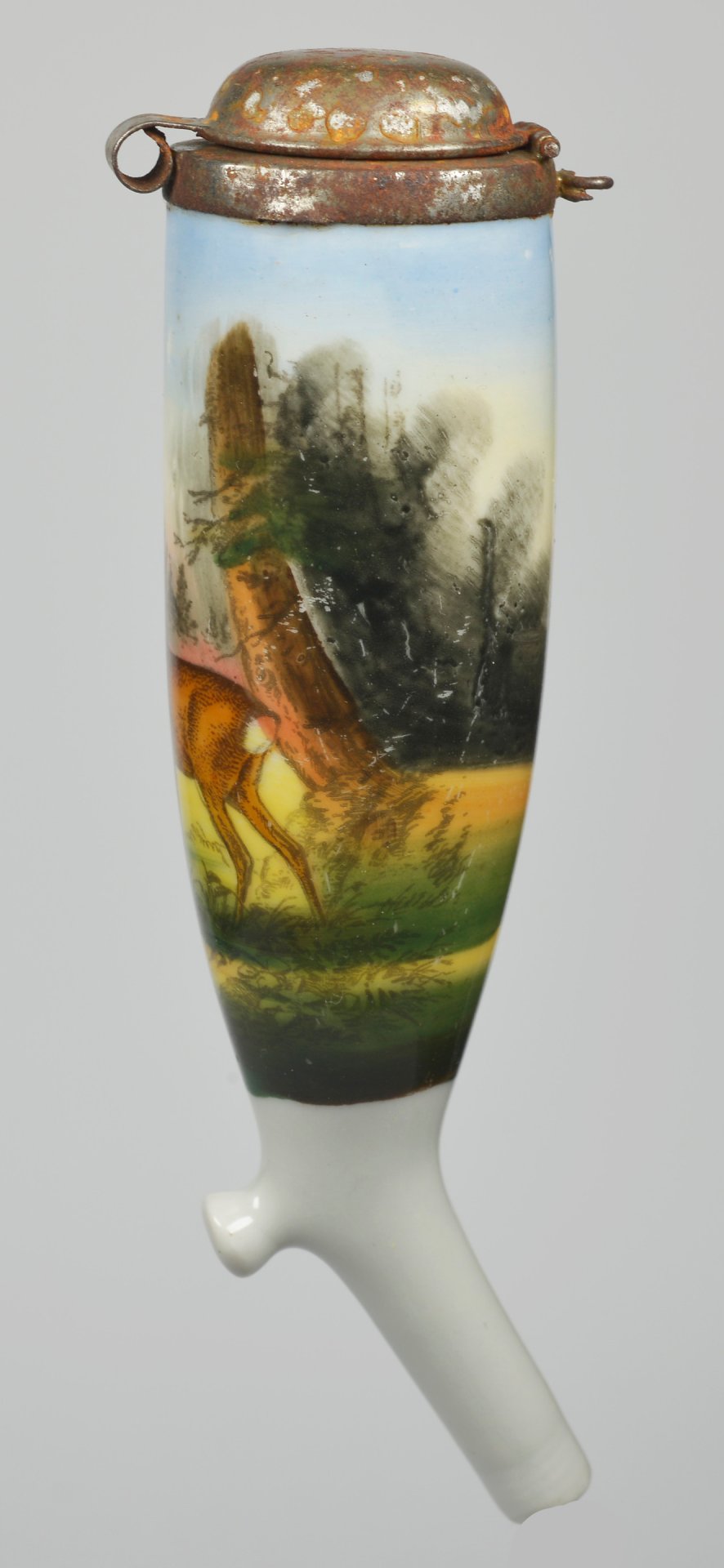 Pfeifenstummel aus Porzellan, umlaufend farbig abgebildete Waldgegend, auf einer Lichtung den Betrachter anschauender Hirsch; Montur aus verrostetem Blech; H=14,3cm (a=135,6; b=104,6; c=37mm)